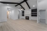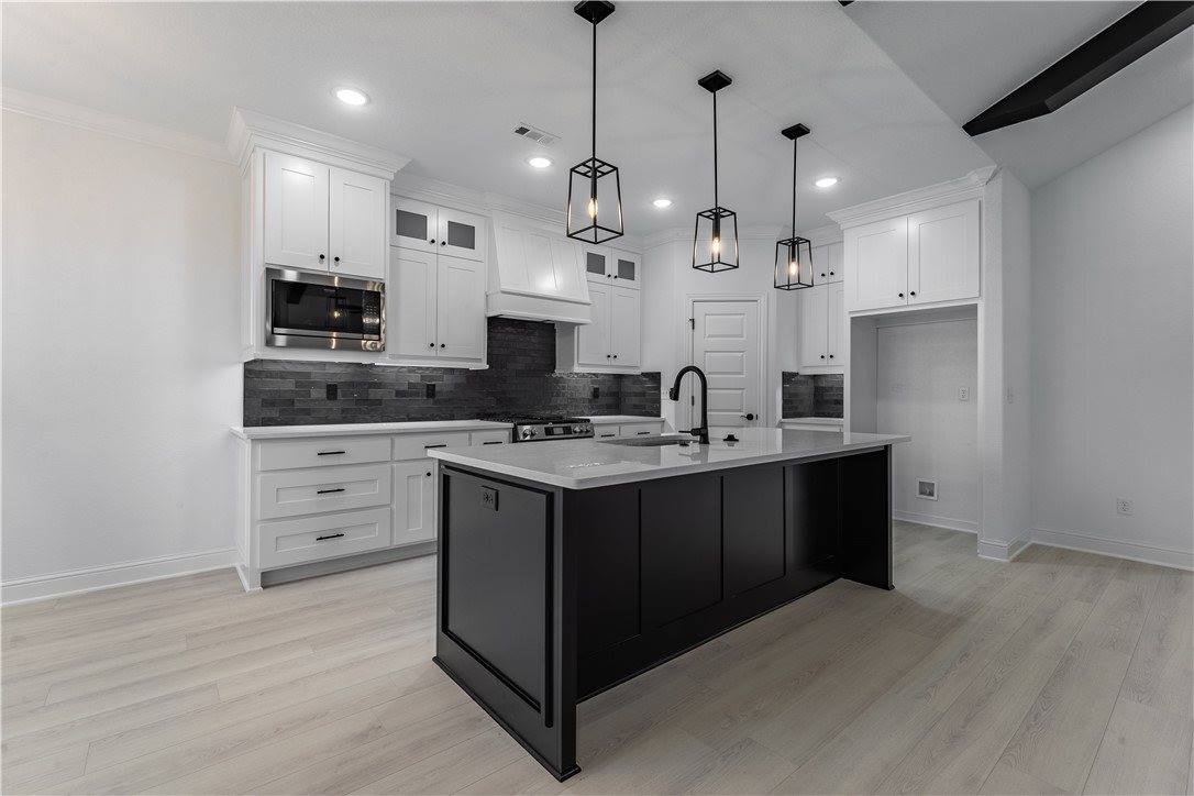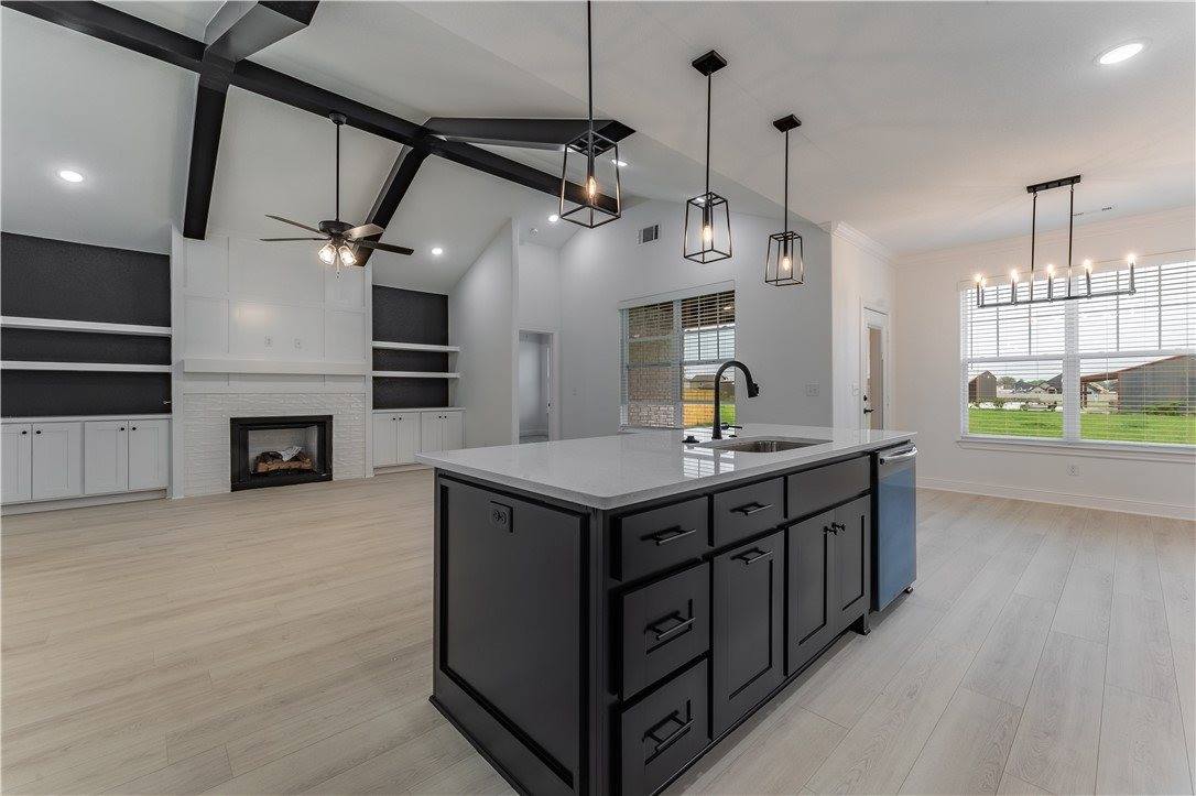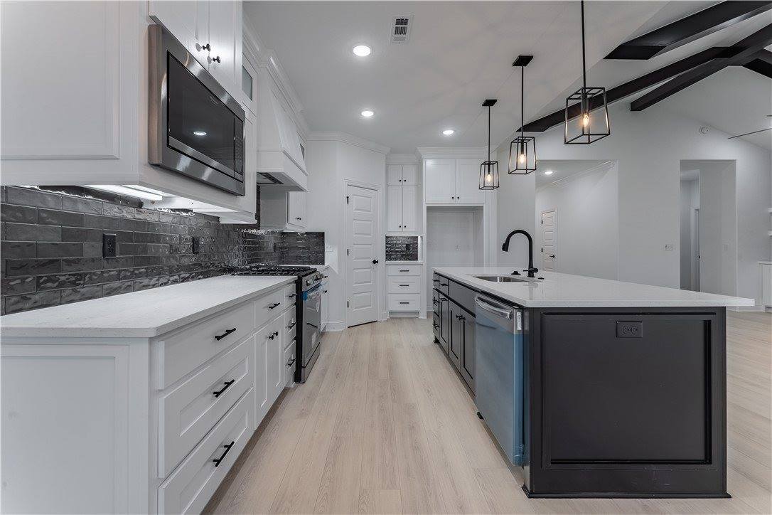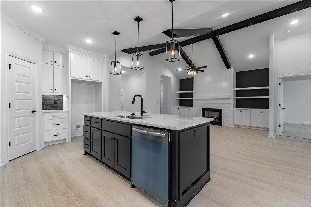 Wood Beam Detail, Fireplace With Built-ins, Custom Cabinets, And Sleek 3CM Granite Throughout. The Kitchen Shines With Custom Cabinets, Undercabinet Lighting, Tile Backsplash, Pantry, Bar Seating, And Eat-in Dining. The Primary Suite Offers A Spa-Like Feel