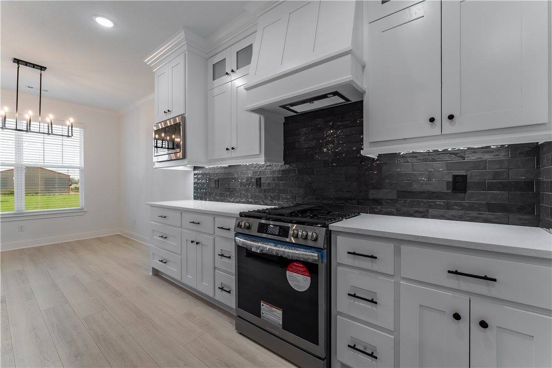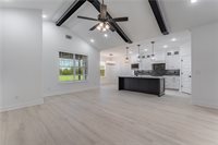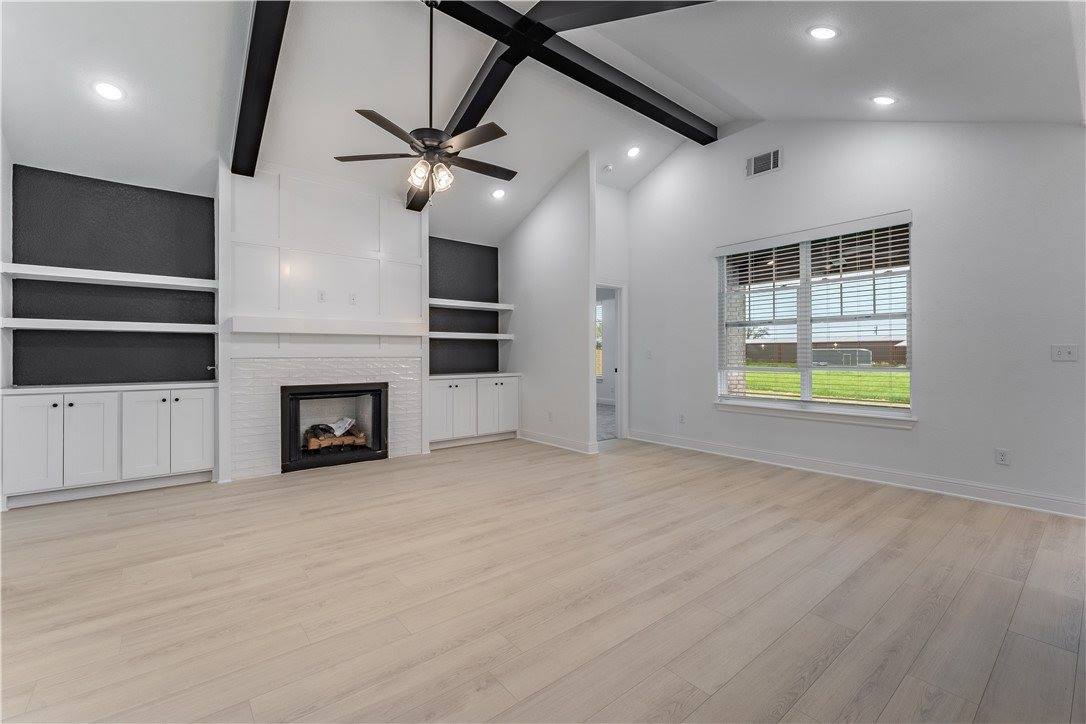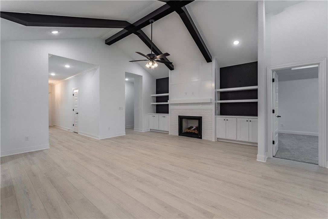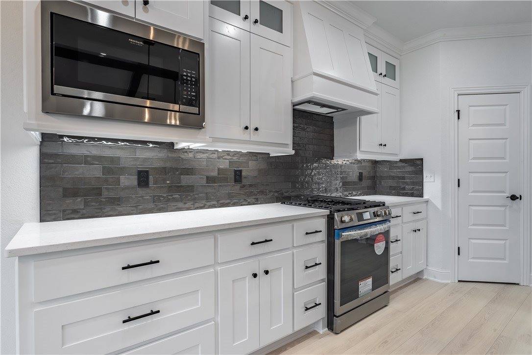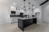 Wood Beam Detail, Fireplace With Built-ins, Custom Cabinets, And Sleek 3CM Granite Throughout. The Kitchen Shines With Custom Cabinets, Undercabinet Lighting, Tile Backsplash, Pantry, Bar Seating, And Eat-in Dining. The Primary Suite Offers A Spa-Like Feel