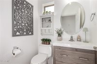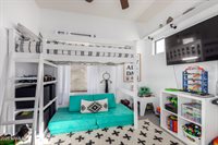 tile flooring, elegant light fixtures, & an expansive upstairs loft. The updated bathrooms add to the home's modern appeal. Step outside to a resort-style backyard with an extended covered patio, a refreshing blue pool, and gorgeous palm trees. Located in