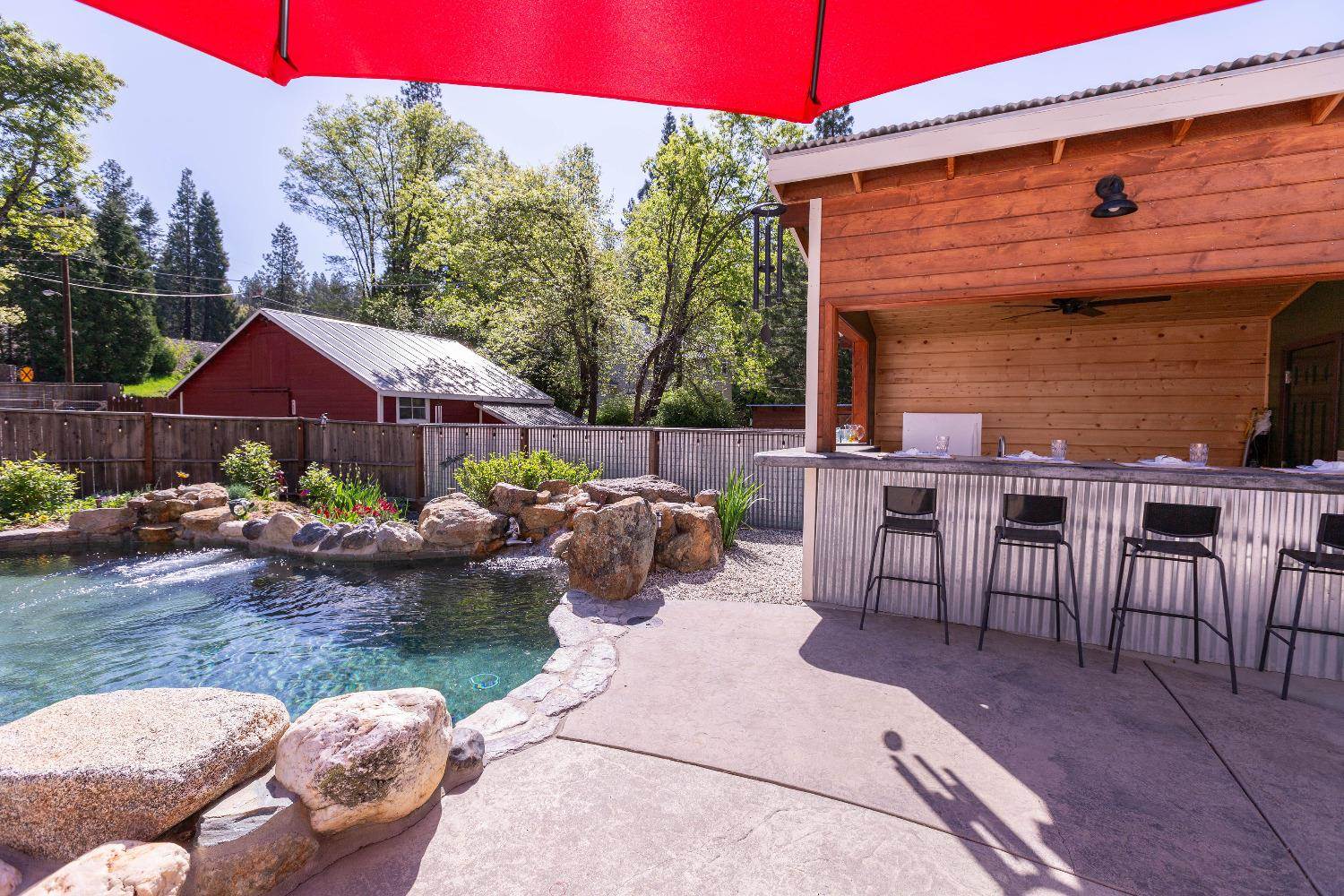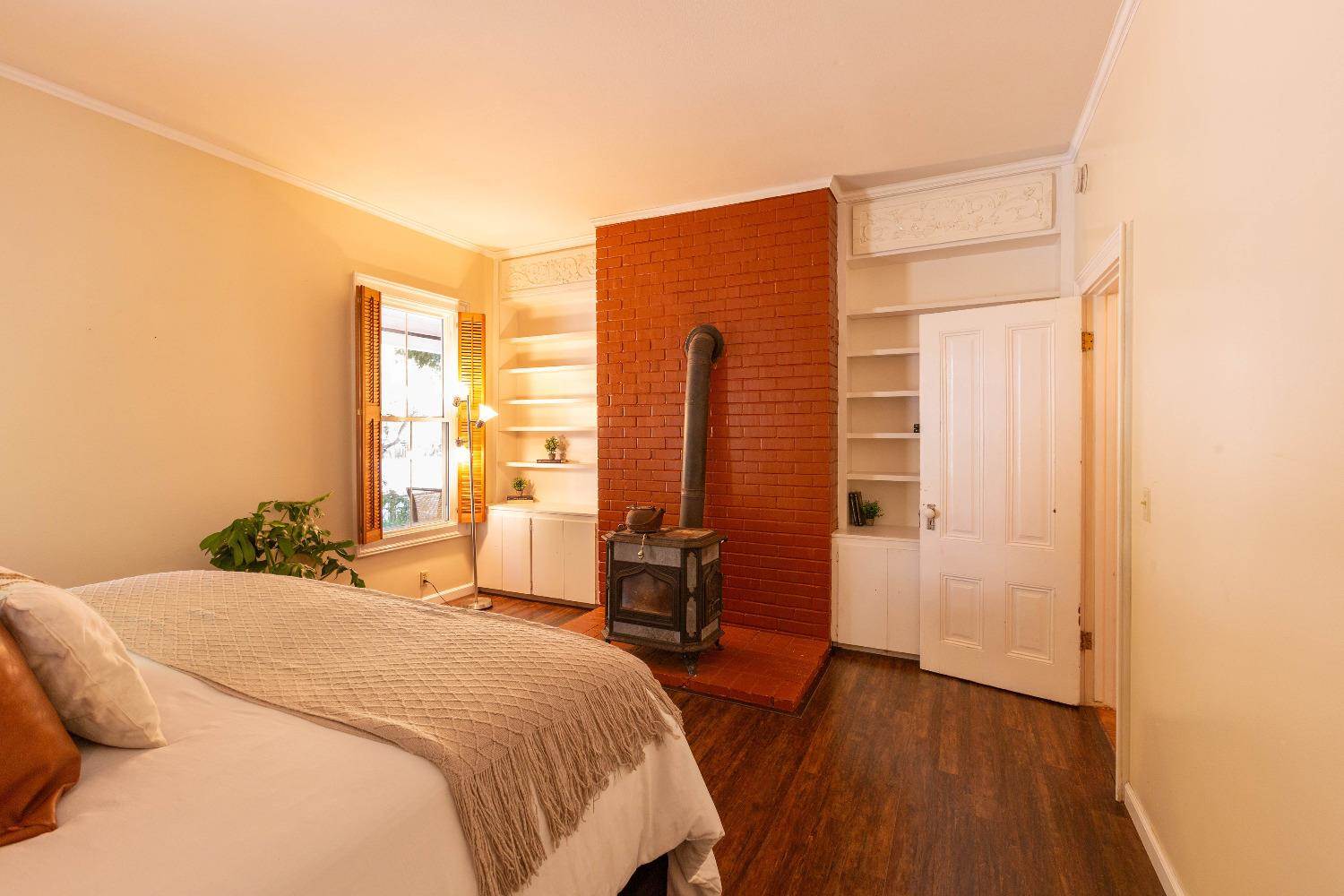 paint, a new chimney, and dual-pane windows. Enjoy high ceilings, a cozy wood-burning fireplace, formal dining, and a spacious kitchen with breakfast nook. Outside, relax or entertain with a heated pool, outdoor bar, fire pit, and fenced garden. The 3-stall
