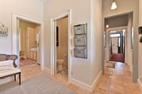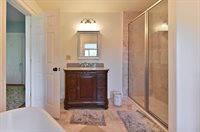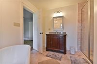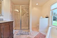 would rival any in a modern home. Tile floors, a soaking tub and huge walk-in tile shower complete this gorgeous bathroom. Beautiful crystal chandeliers adorn the ceiling of the living room and dining room and 2 of the bedrooms. With original flooring, original