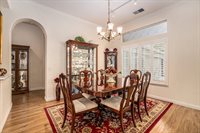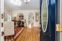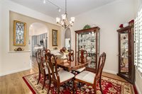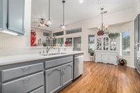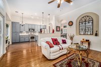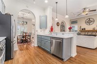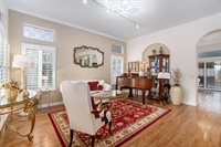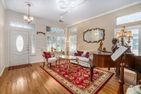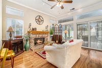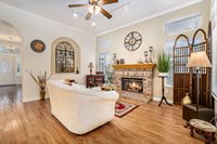 inside, where luxury vinyl plank flooring, high ceilings, plantation shutters, and transom windows fill the home with warmth and natural light. The open-concept layout features two living areas, a cozy gas fireplace, a formal dining area for entertaining,