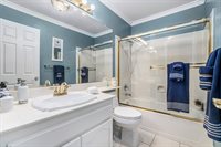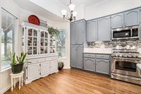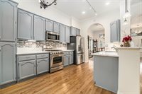 and an updated eat-in kitchen with quartz countertops, a breakfast bar, under-cabinet lighting, freshly painted cabinets, and stainless steel appliances, including a gas range, microwave, and dishwasher. The two spacious bedrooms offer walk-in closets, while
