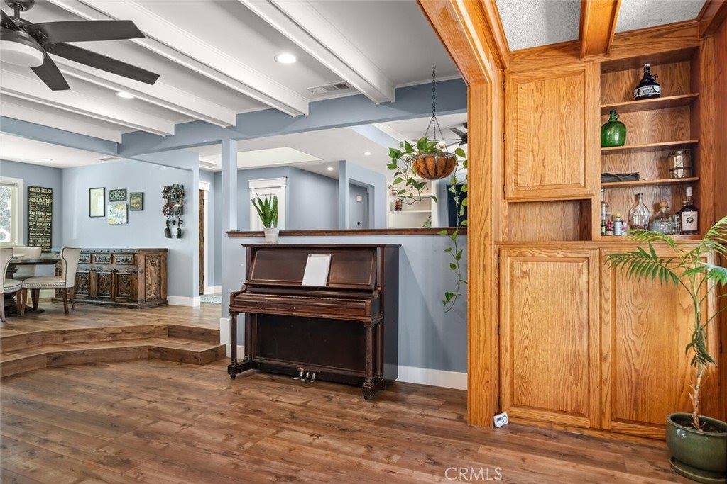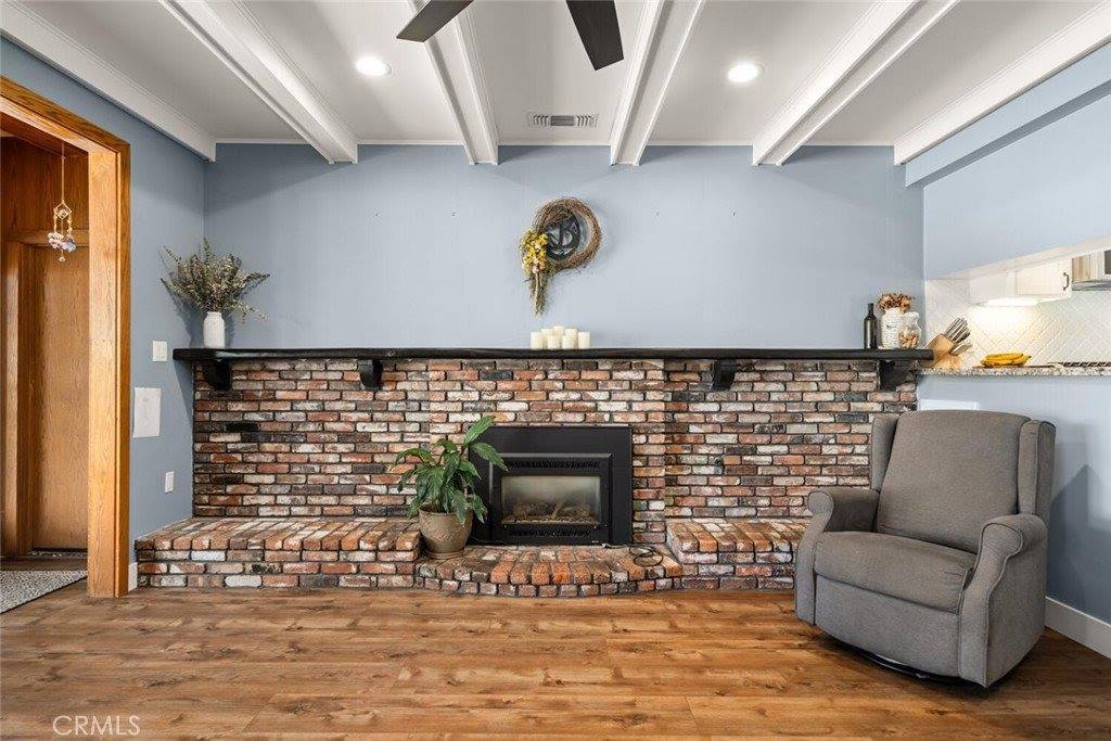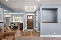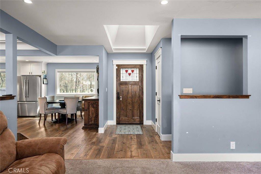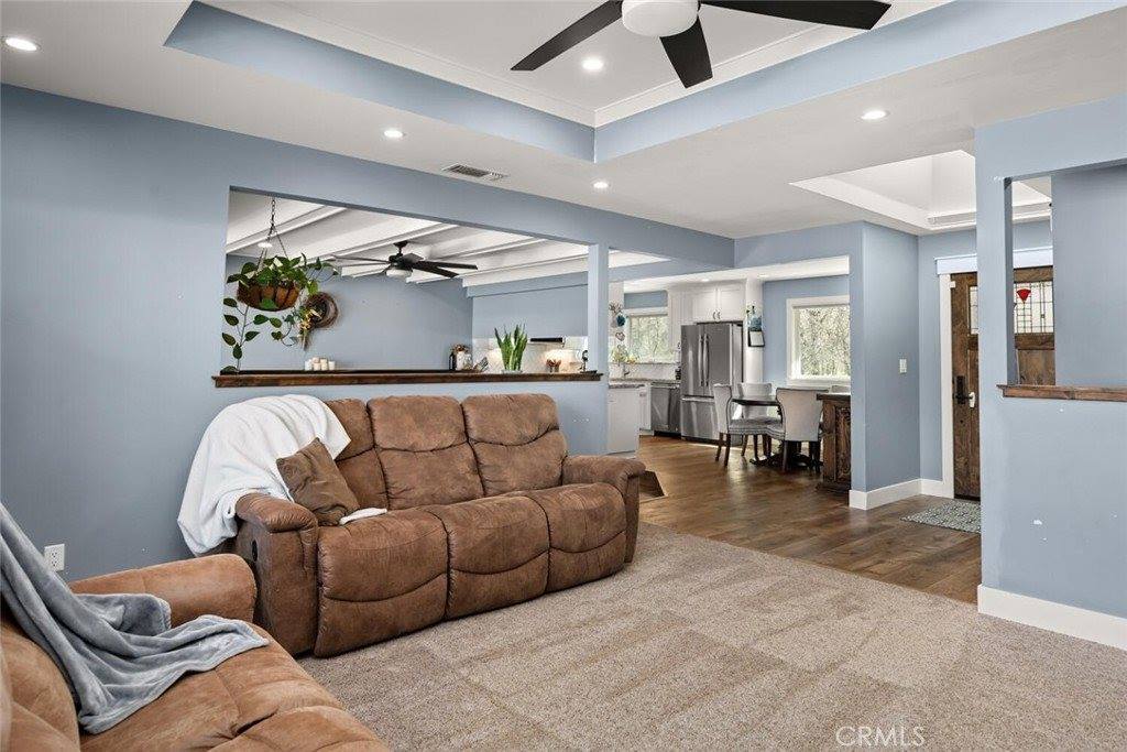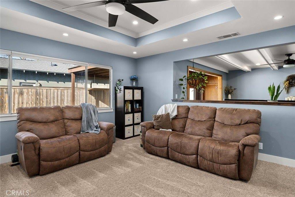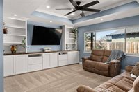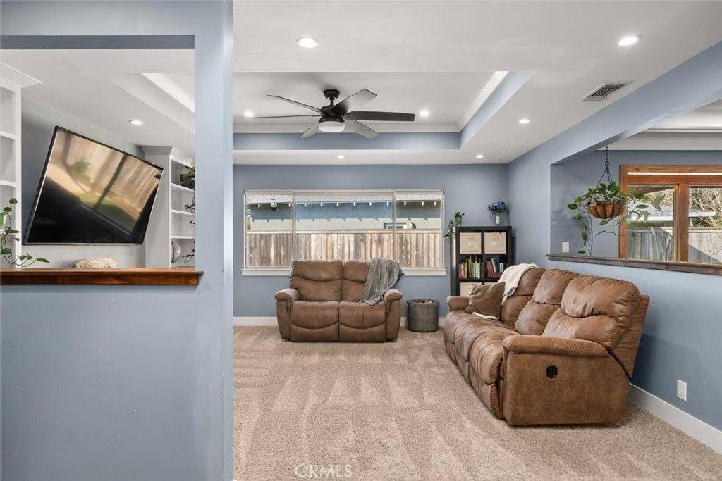 As you enter, you're greeted by luxury vinyl plank flooring and a large skylight that bathes the space in natural light. The living room boasts elegant tray ceilings, recessed lighting, and custom-built cabinets, providing both functionality and style. Step