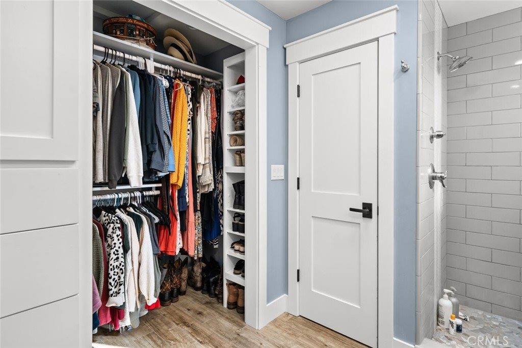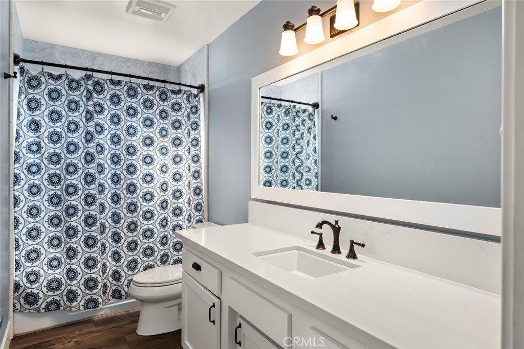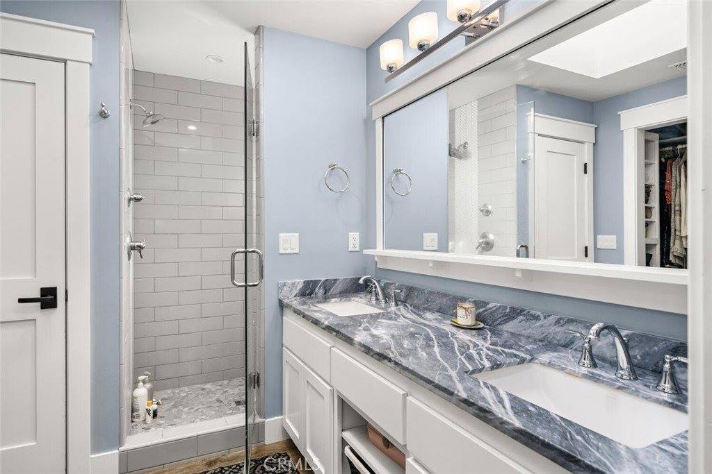 dual shower heads, marble dual sink vanity, and a private slider leading to the backyard and HOT TUB! The thoughtfully designed en-suite includes a separate toilet area for added privacy. The backyard is perfect for entertaining or relaxing, with a pergola-covered