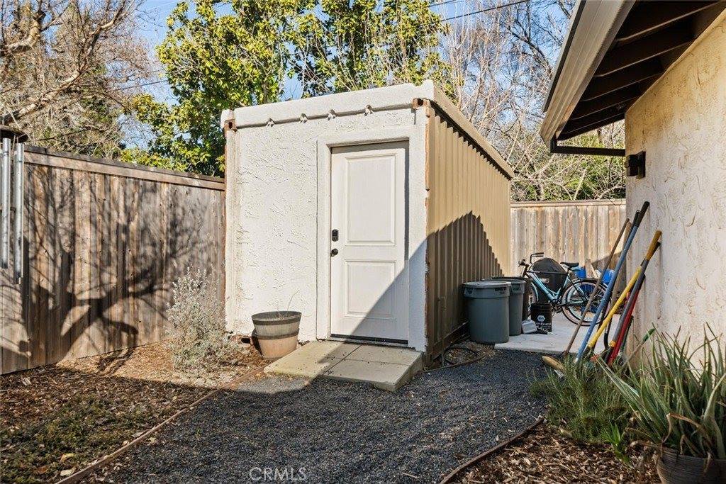home is a container shed that has been updated to complement the home's exterior. It includes a man door, a built-in workbench along one-third of a wall, and additional storage. Lighting and multiple outlets have also been installed for added functionality.