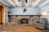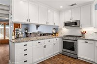 down into the cozy family room, where beamed ceilings, etched glass windows, and a gas fireplace to create a warm and inviting atmosphere. The kitchen is a chef's delight, featuring granite countertops, white shaker cabinets, stainless steel appliances, and
