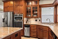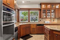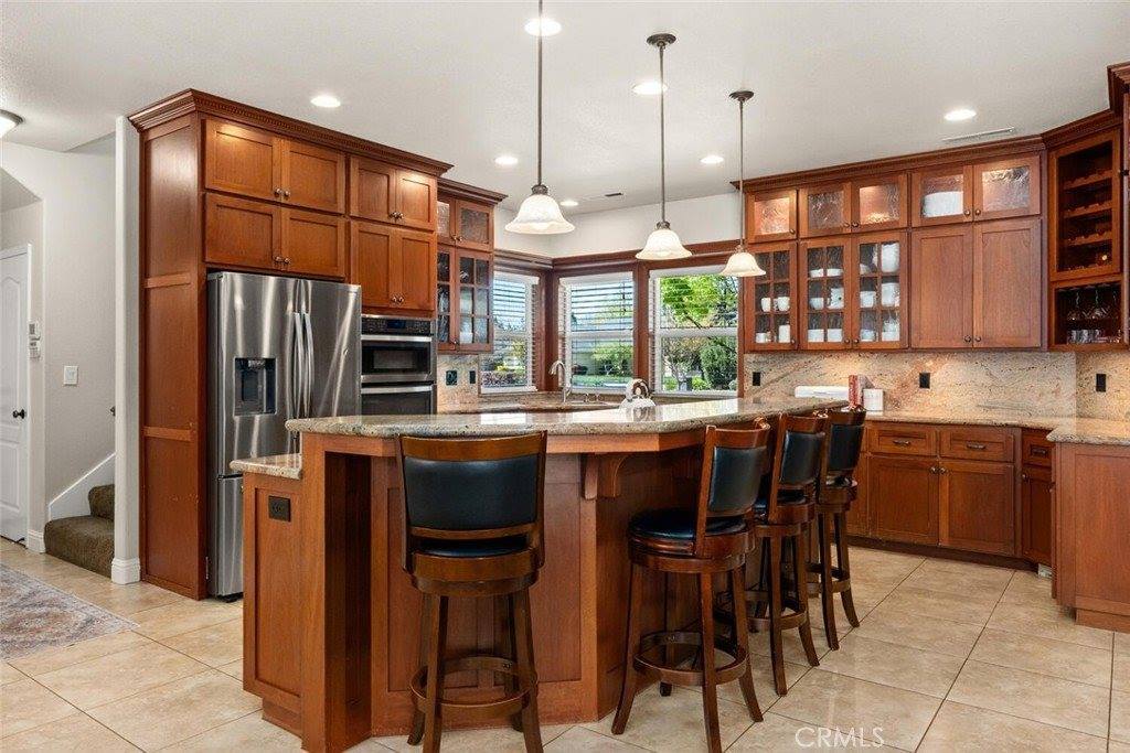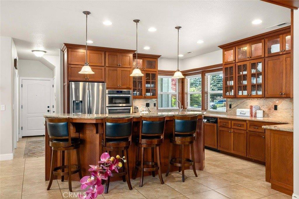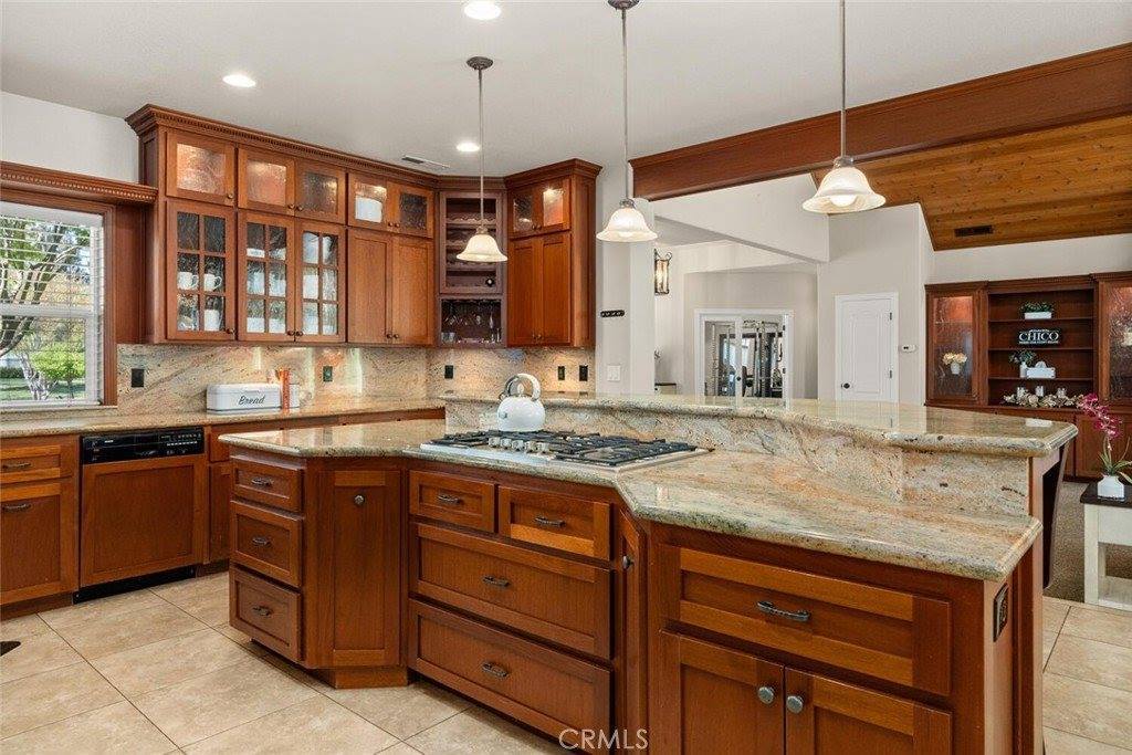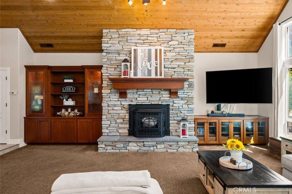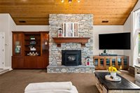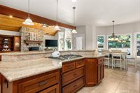 and a striking floor-to-ceiling pellet stove—an ideal centerpiece for cozy evenings or lively gatherings. The heart of the home is a true chef’s dream. This gourmet kitchen is fully equipped with rich wood cabinetry, granite countertops, stainless steel