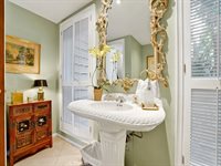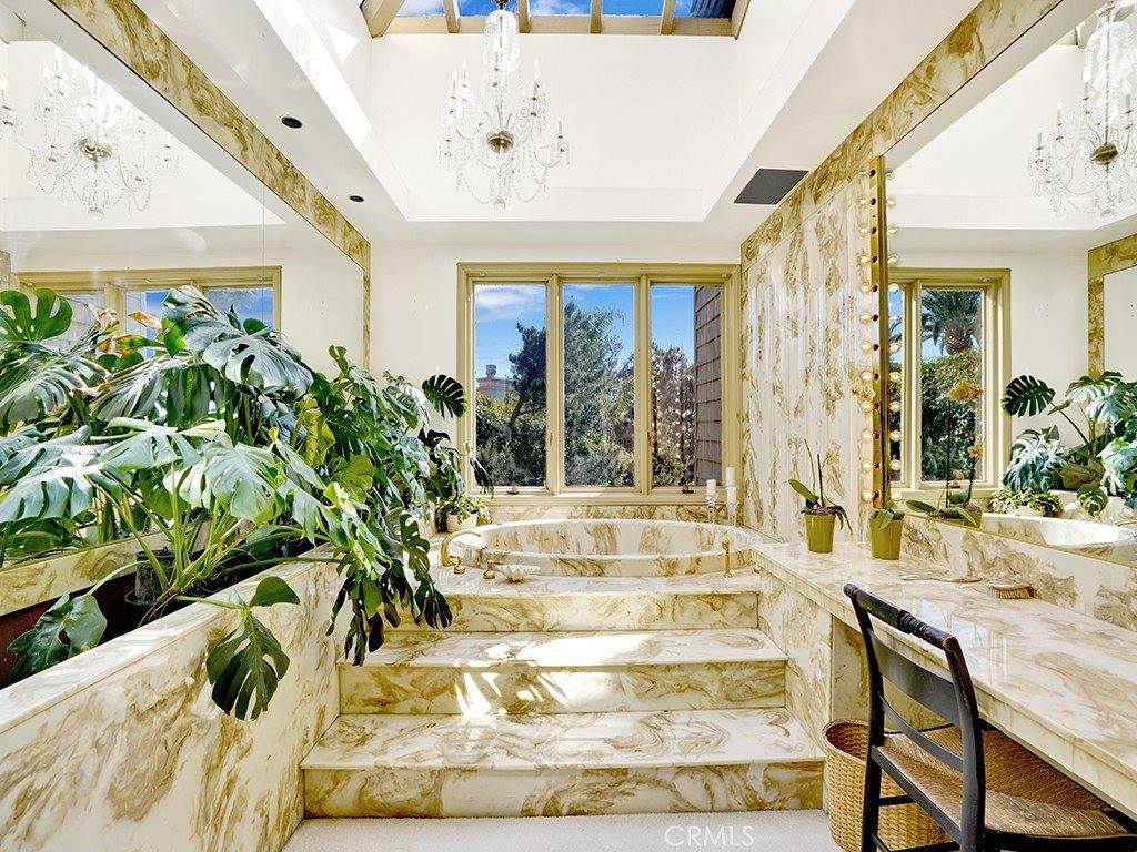 closet with built-in island cabinet. The master bath impresses with a 2 head shower, spa tub, double sinks, garden feature, skylight and 2 chandeliers. Additional living space includes 2 en suite bedrooms with private patios, and a 4th bedroom with adjacent