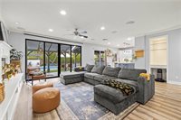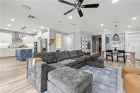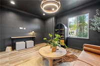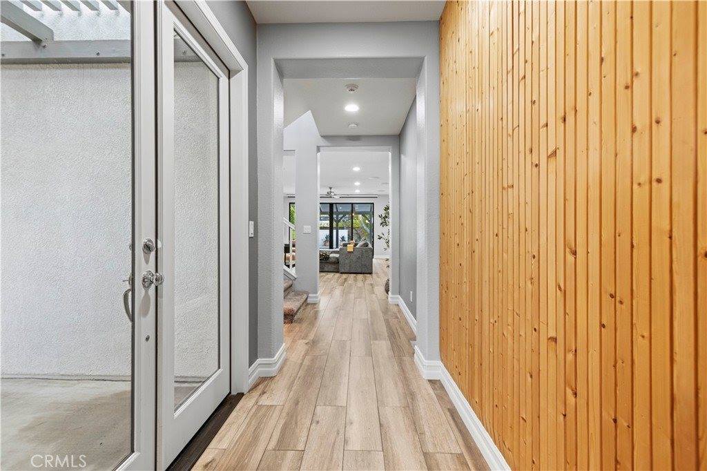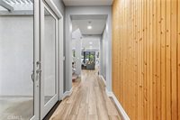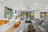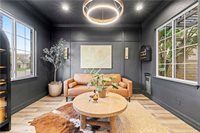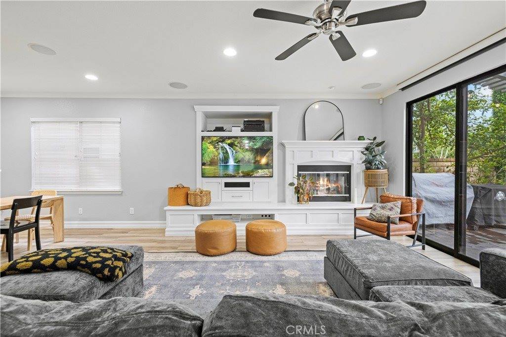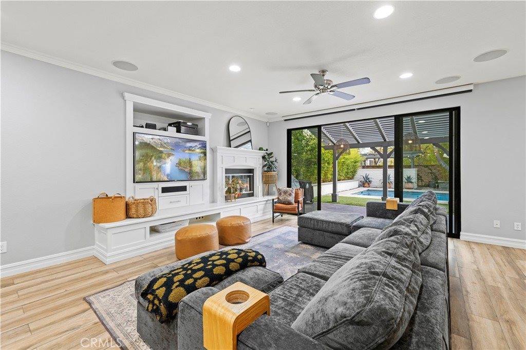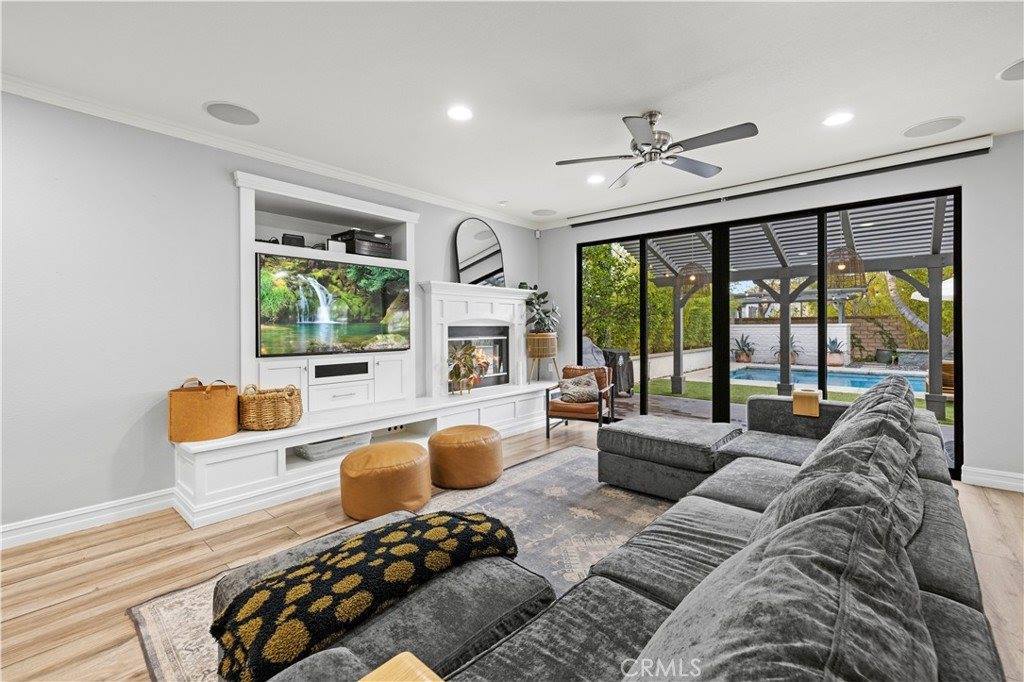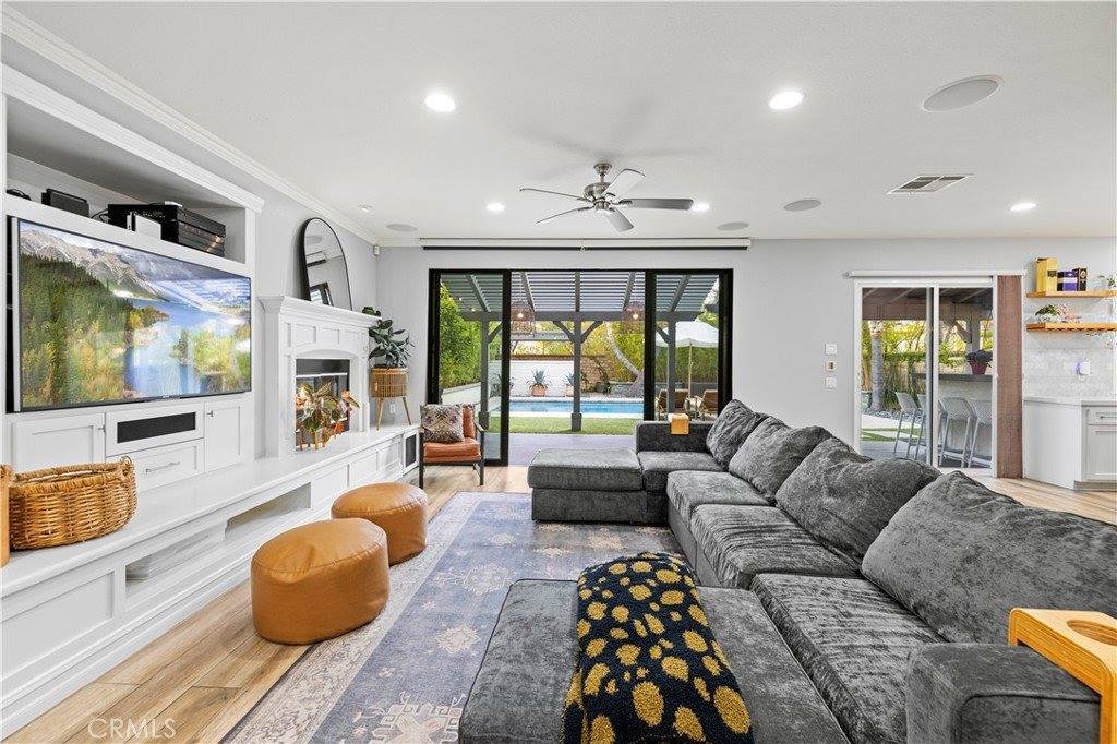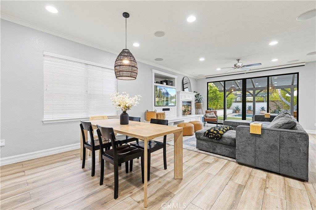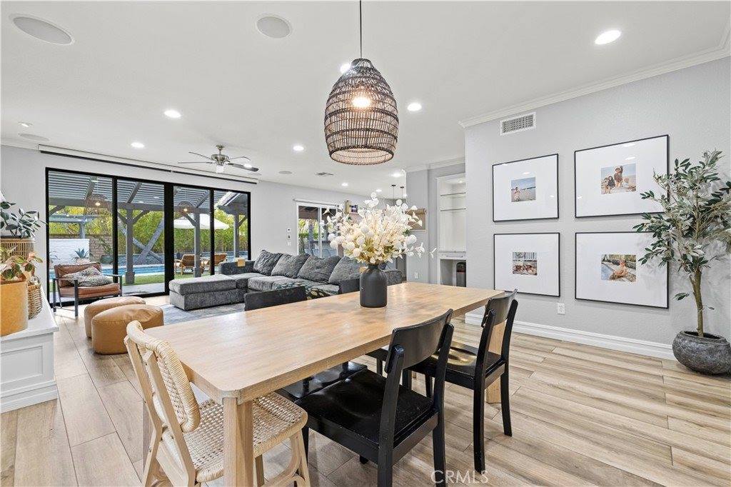 flow, thanks to the removal of interior walls between the dining, family, and kitchen areas. Step inside to soaring ceilings, black accent walls, wood detailing, and a California room that opens seamlessly to the private backyard through 12-foot custom Fleetwood