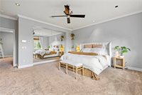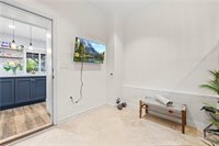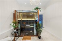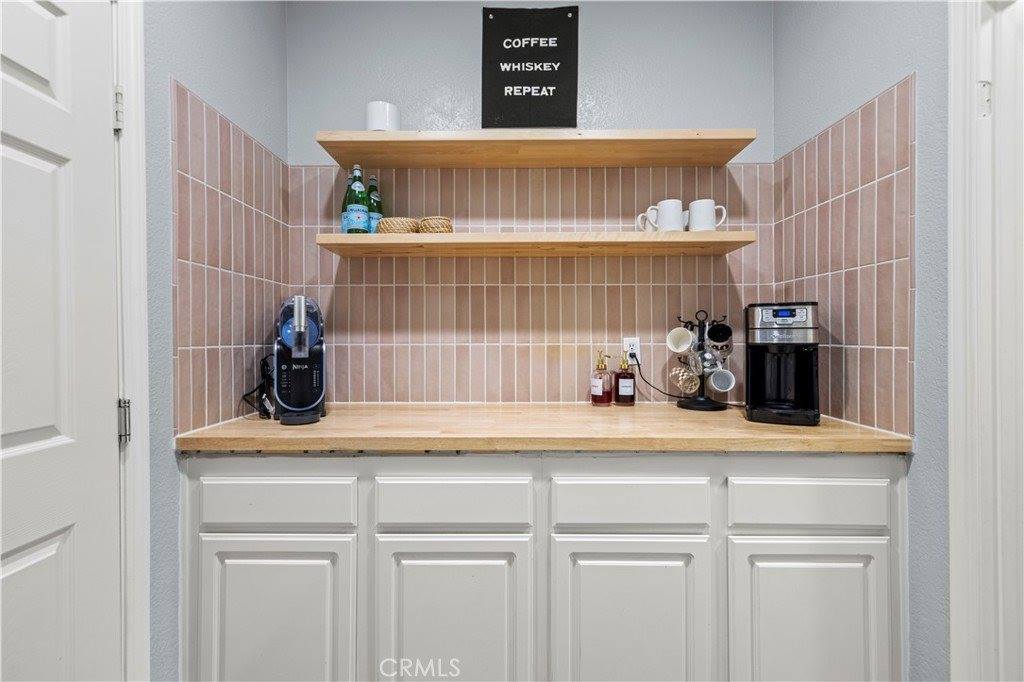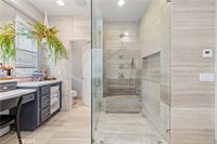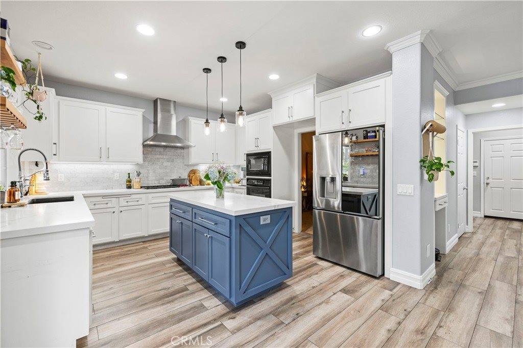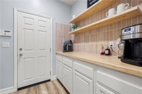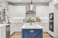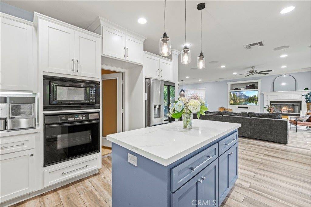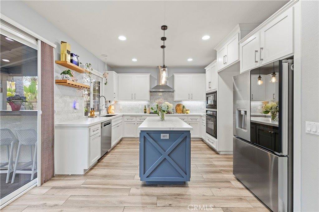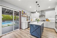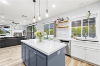 accordion doors. The heart of the home is the fully remodeled chef’s kitchen, featuring open cabinetry, a Wolf range, a picture window over the sink, and remote-controlled automatic blinds. Just off the kitchen, you’ll find a custom butler’s pantry and