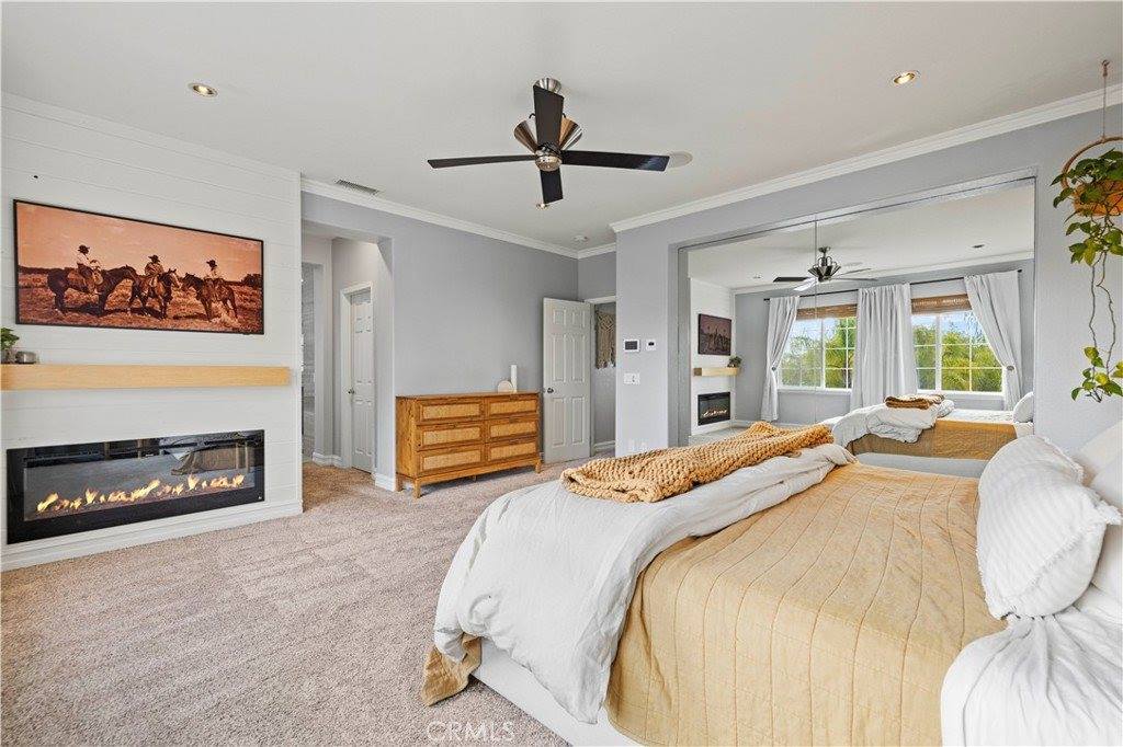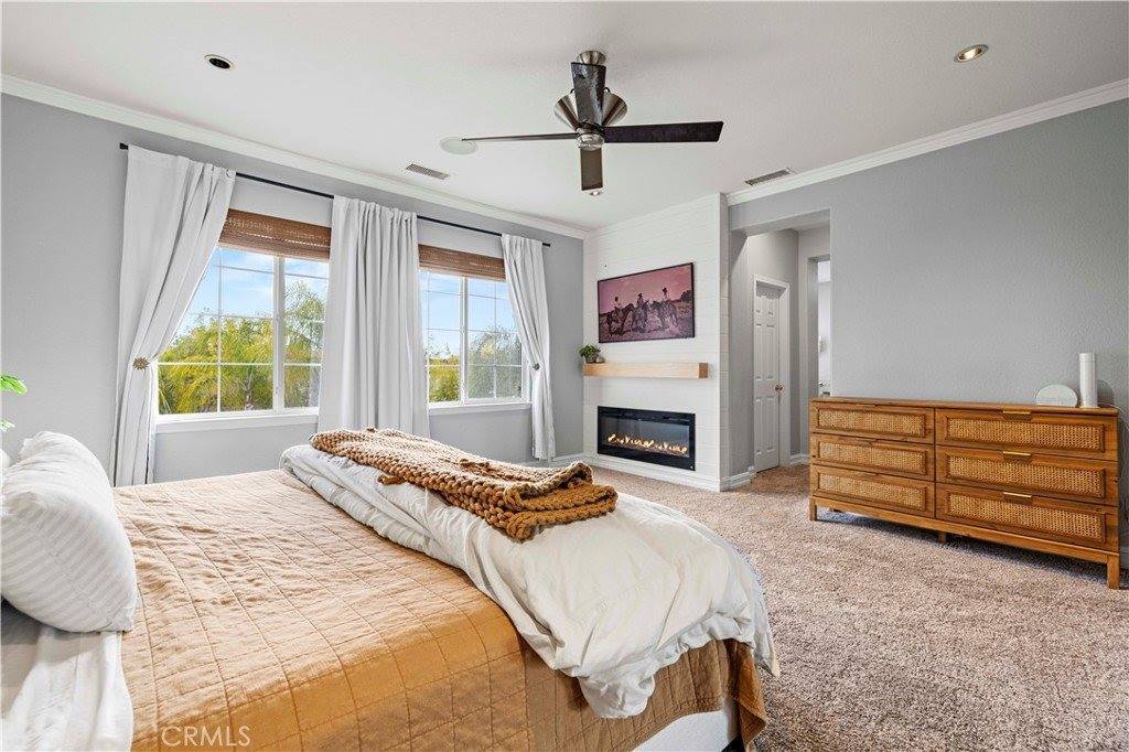 an additional flex room—perfect as an office or easily converted to a main-floor bedroom. Upstairs, you'll find four spacious bedrooms, including a luxurious primary suite with a modern electric fireplace, two walk-in closets, and a remodeled spa-like bath