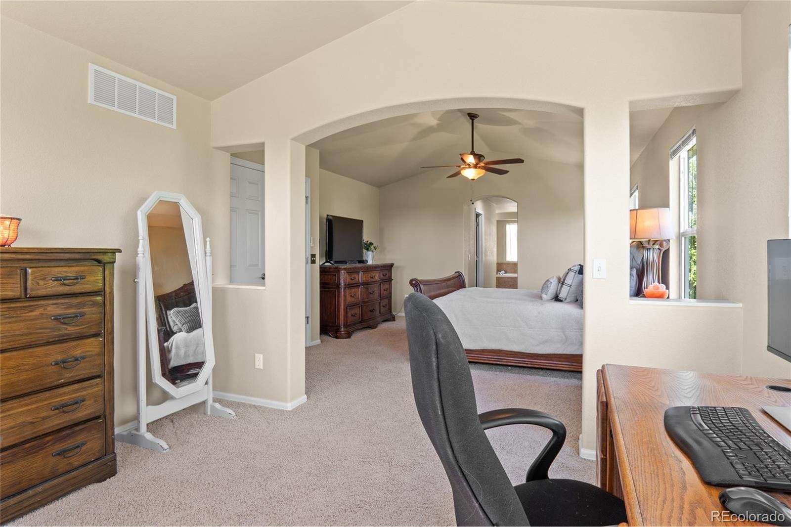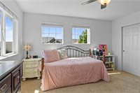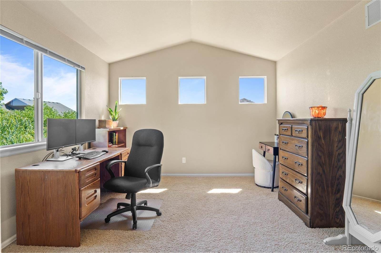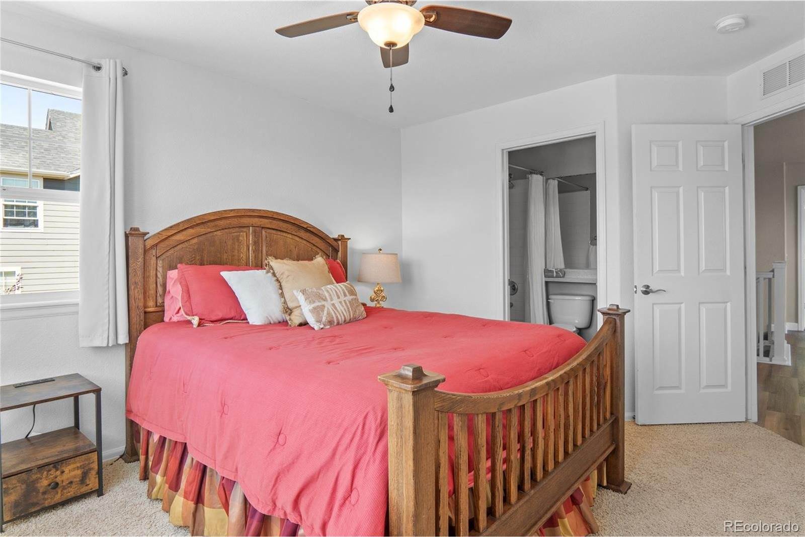 bedroom that can double as a home office or guest room. One of the upper-level bedrooms features a private en suite full bathroom, perfect for multigenerational living or visitors. The expansive primary suite is a true retreat, complete with a large attached