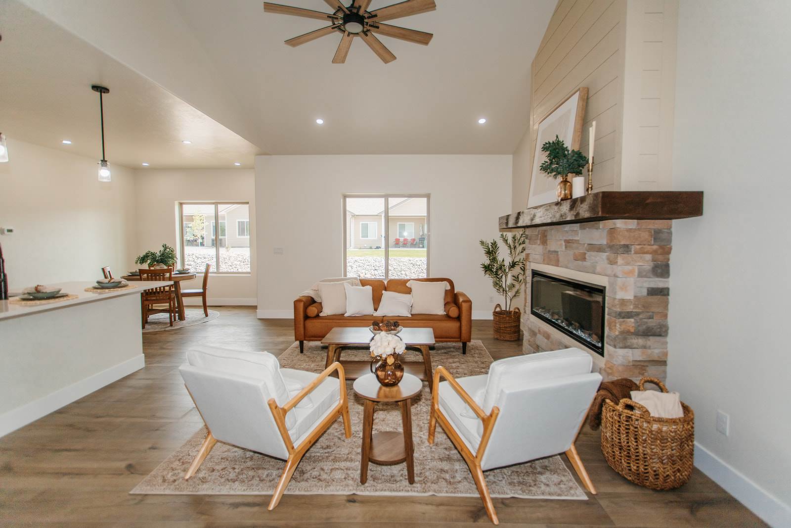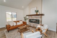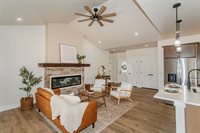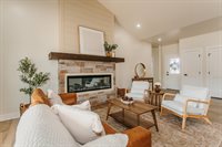 with a tiled shower and glass door, separate soaking tub, private toilet, and dual-sink vanity. The open-concept layout seamlessly connects the vaulted ceiling living room, dining and kitchen areas. The kitchen is equipped with a center island with room for