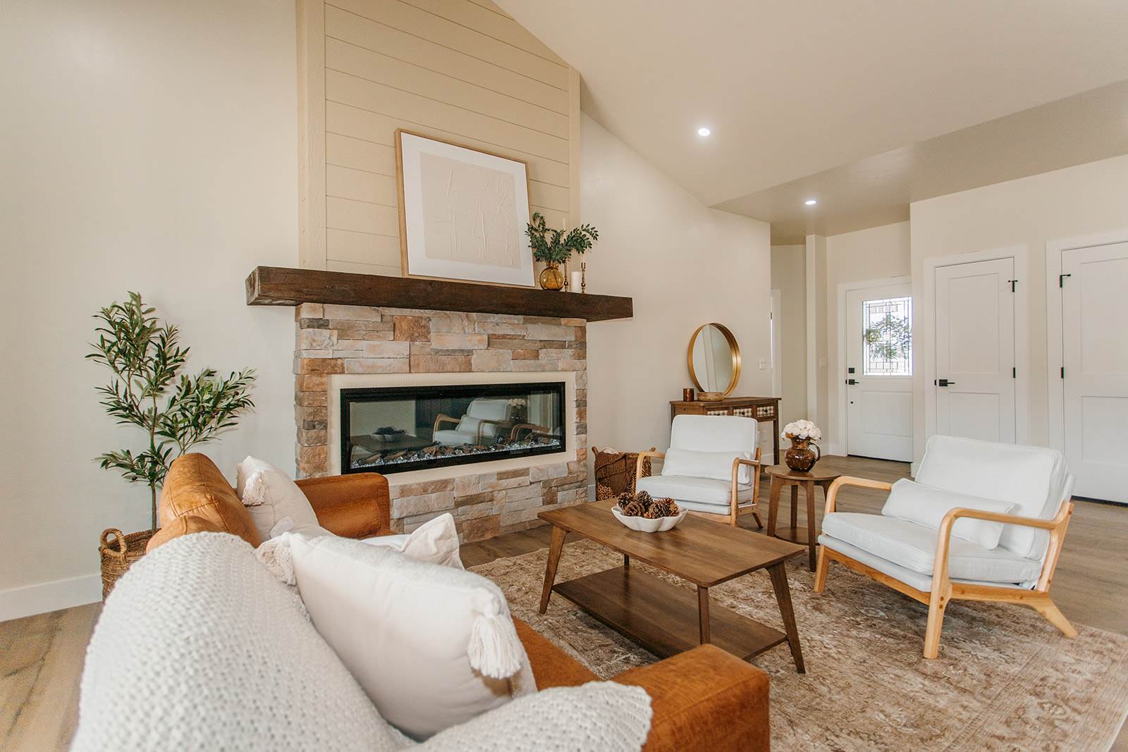 including two fireplaces—one in the spacious living room and a second in the serene primary suite. The smart split floor plan features a generous master bedroom with vaulted ceiling and ceiling fan, an expansive walk-in closet, and a luxurious en suite bath
