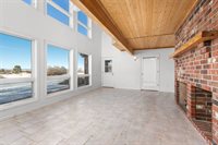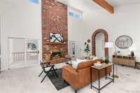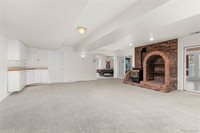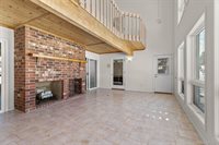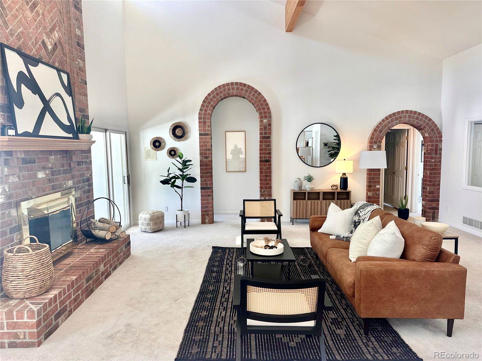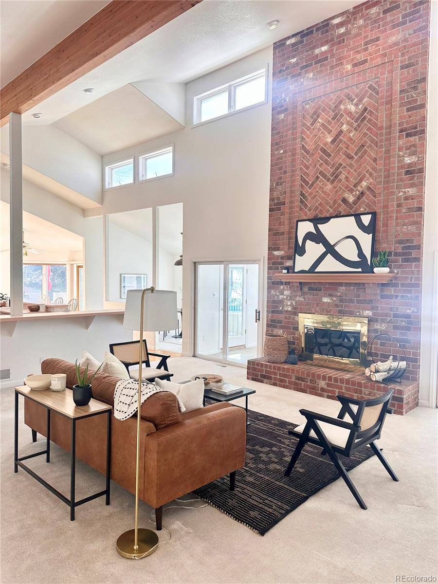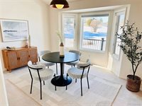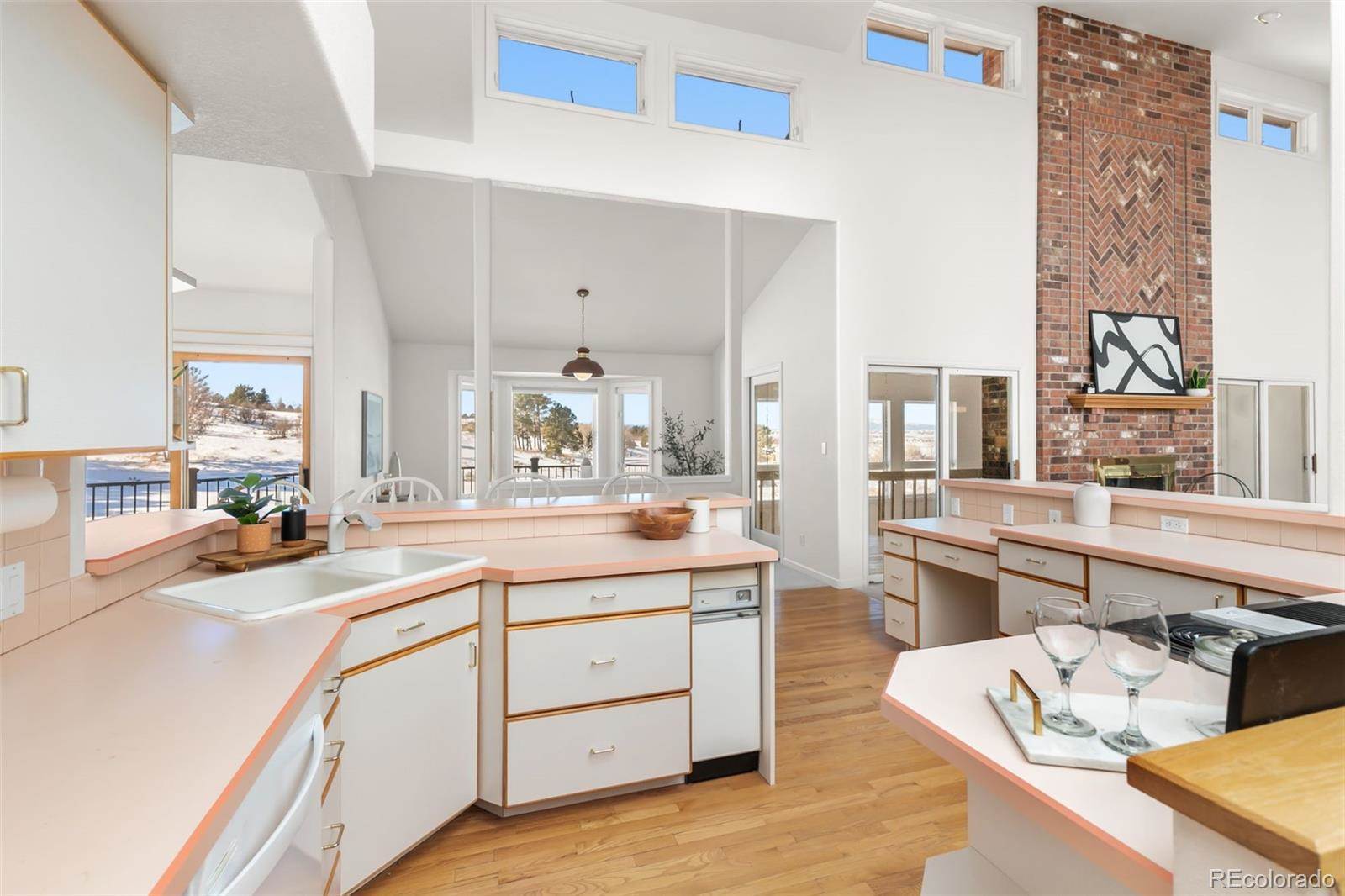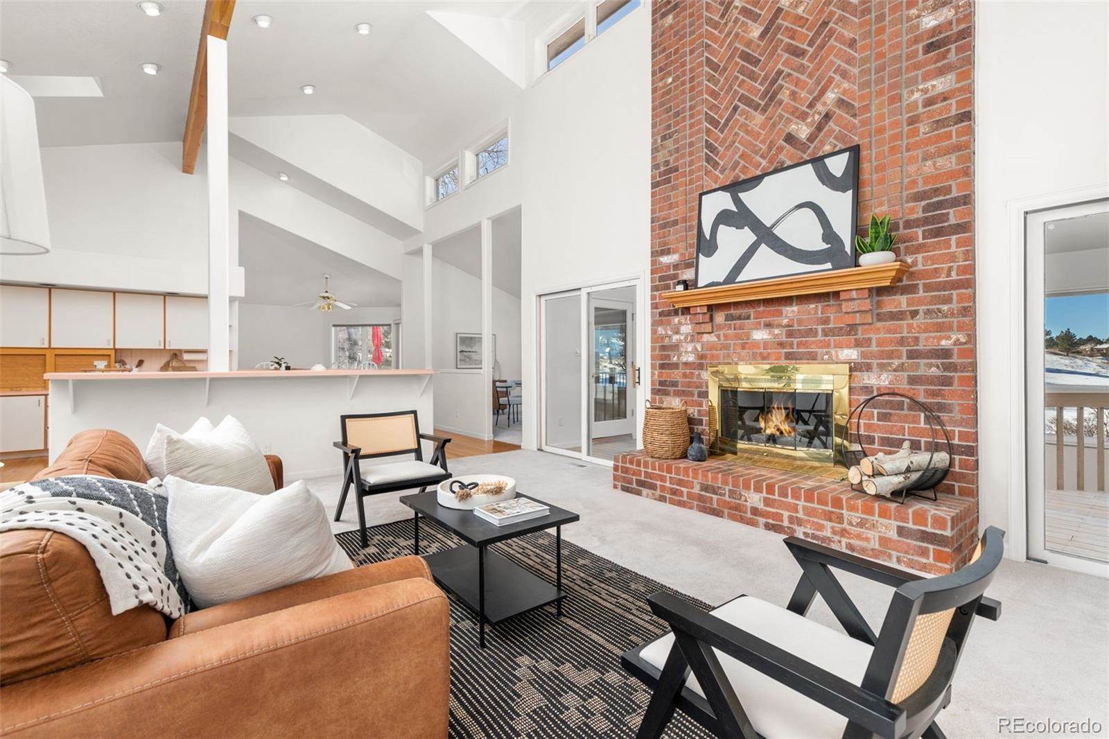 and a striking brick fireplace, creating a bright and welcoming atmosphere. The expansive kitchen features mid-century modern charm and plenty of space for gatherings. Step out onto the southwest-facing Trex deck to enjoy breathtaking sunsets year-round. The