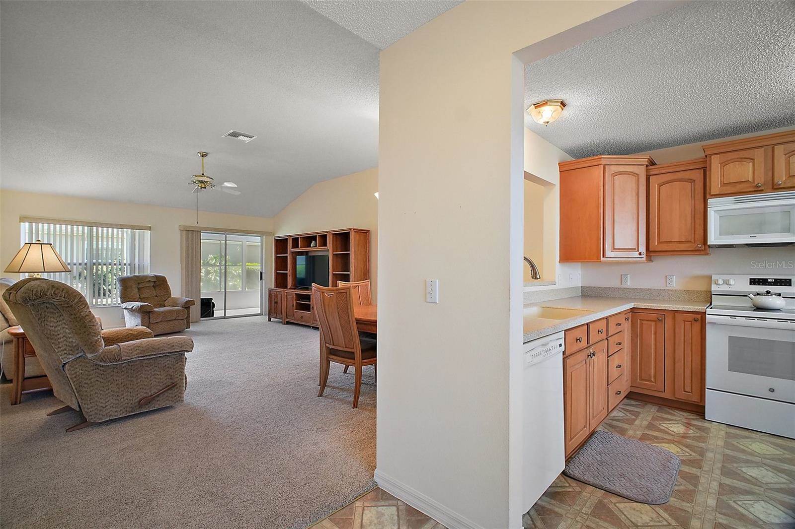 ROOM COMBO, VOLUME CEILINGS & SLIDING GLASS DOORS leading to the ENCLOSED LANAI (no kissing lanai's). The KITCHEN is thoughtfully designed with additional cabinetry and benefits from LARGE BAY WINDOWS in the BREAKFAST NOOK, creating a Bright and Inviting space.