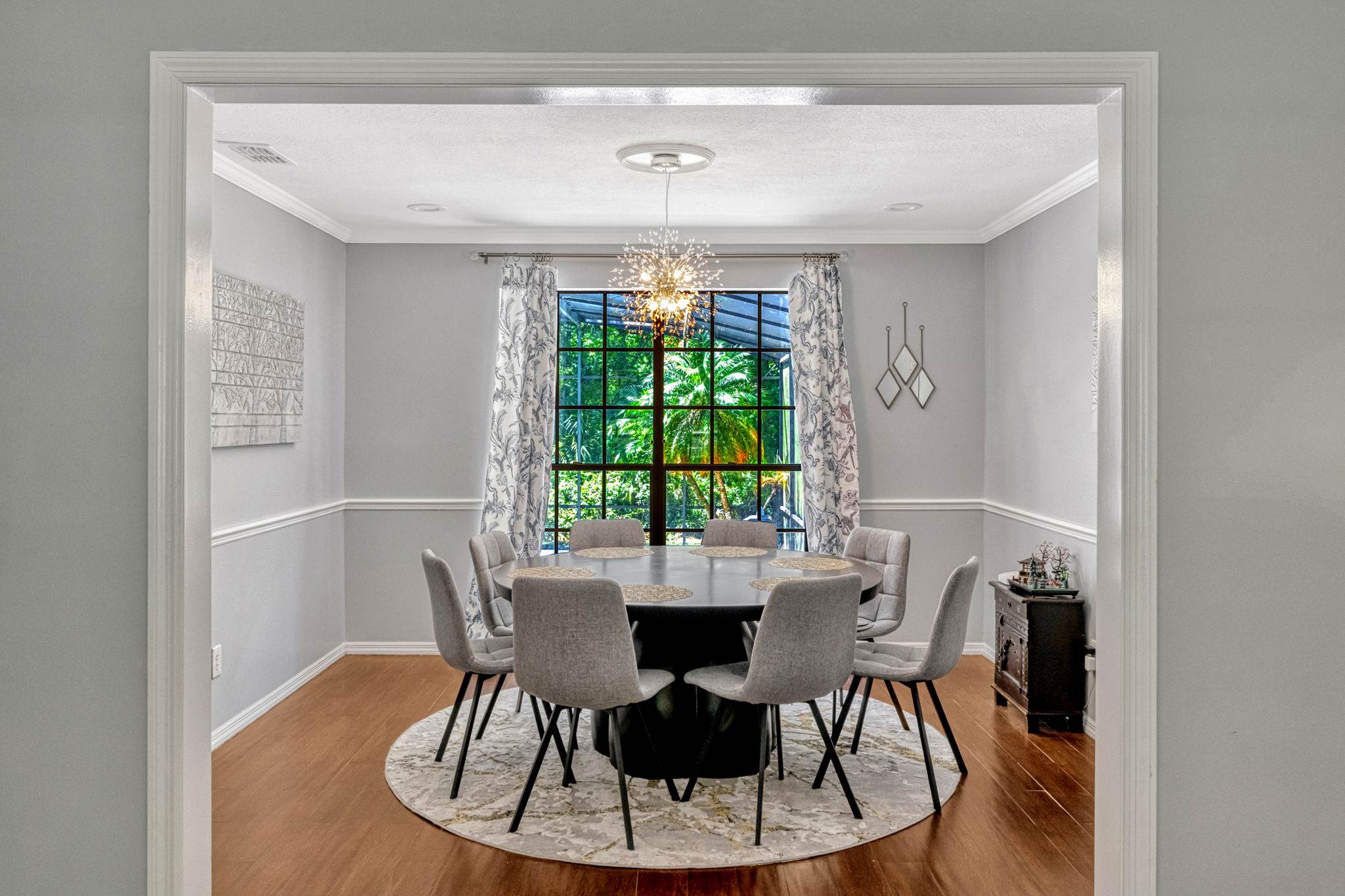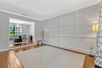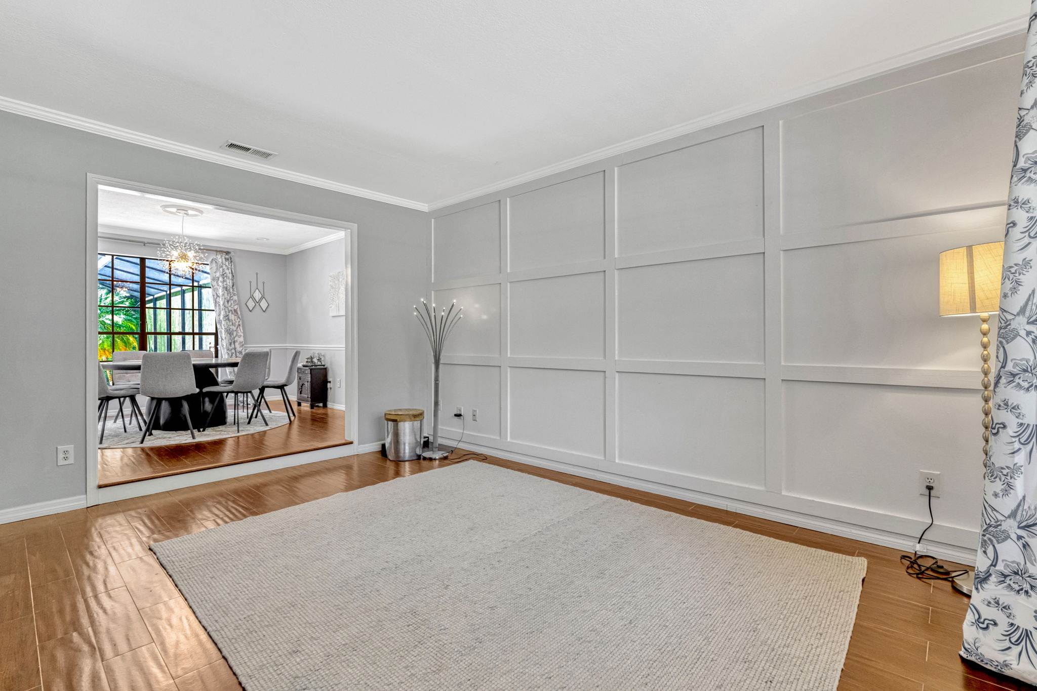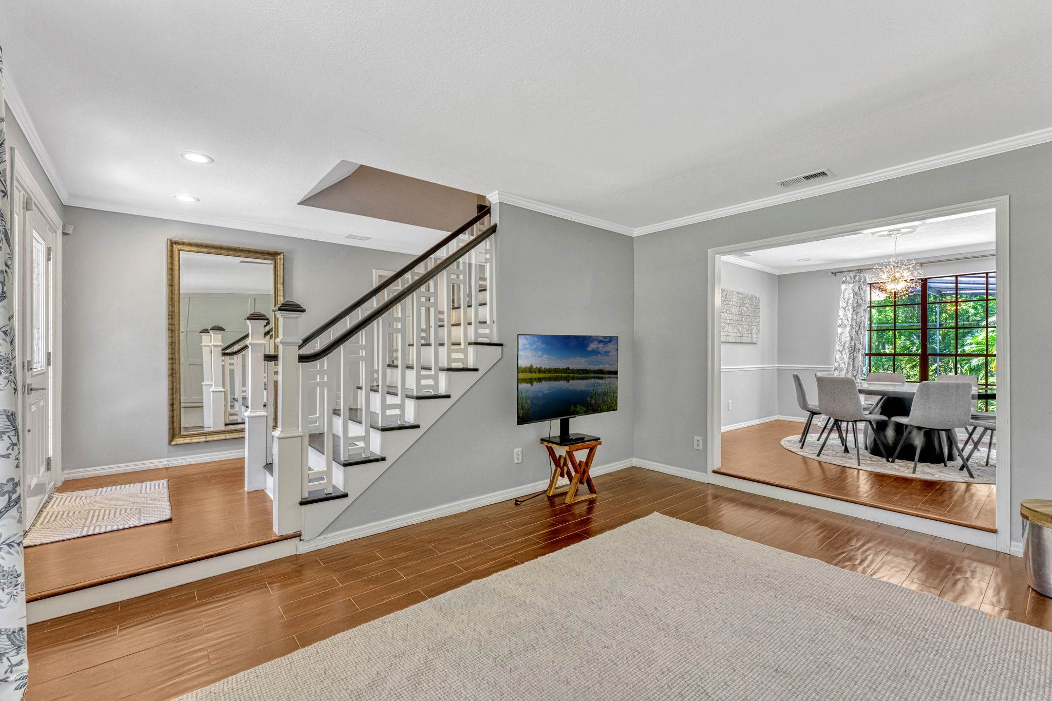 luxury. Step inside to an inviting open living room that flows seamlessly into a formal dining space adorned with crown molding and classic chair rail accents. Durable and stylish wood look tile planks span the main level, creating a warm and cohesive aesthetic.