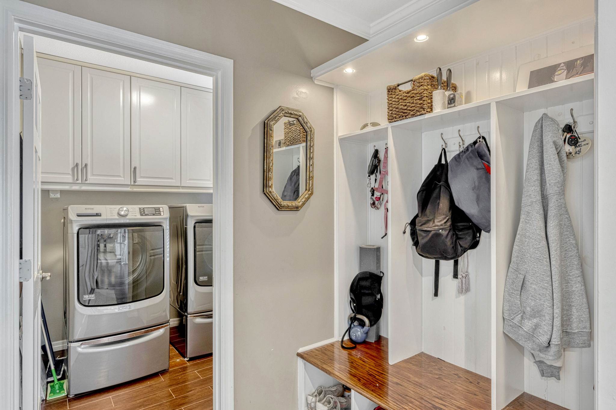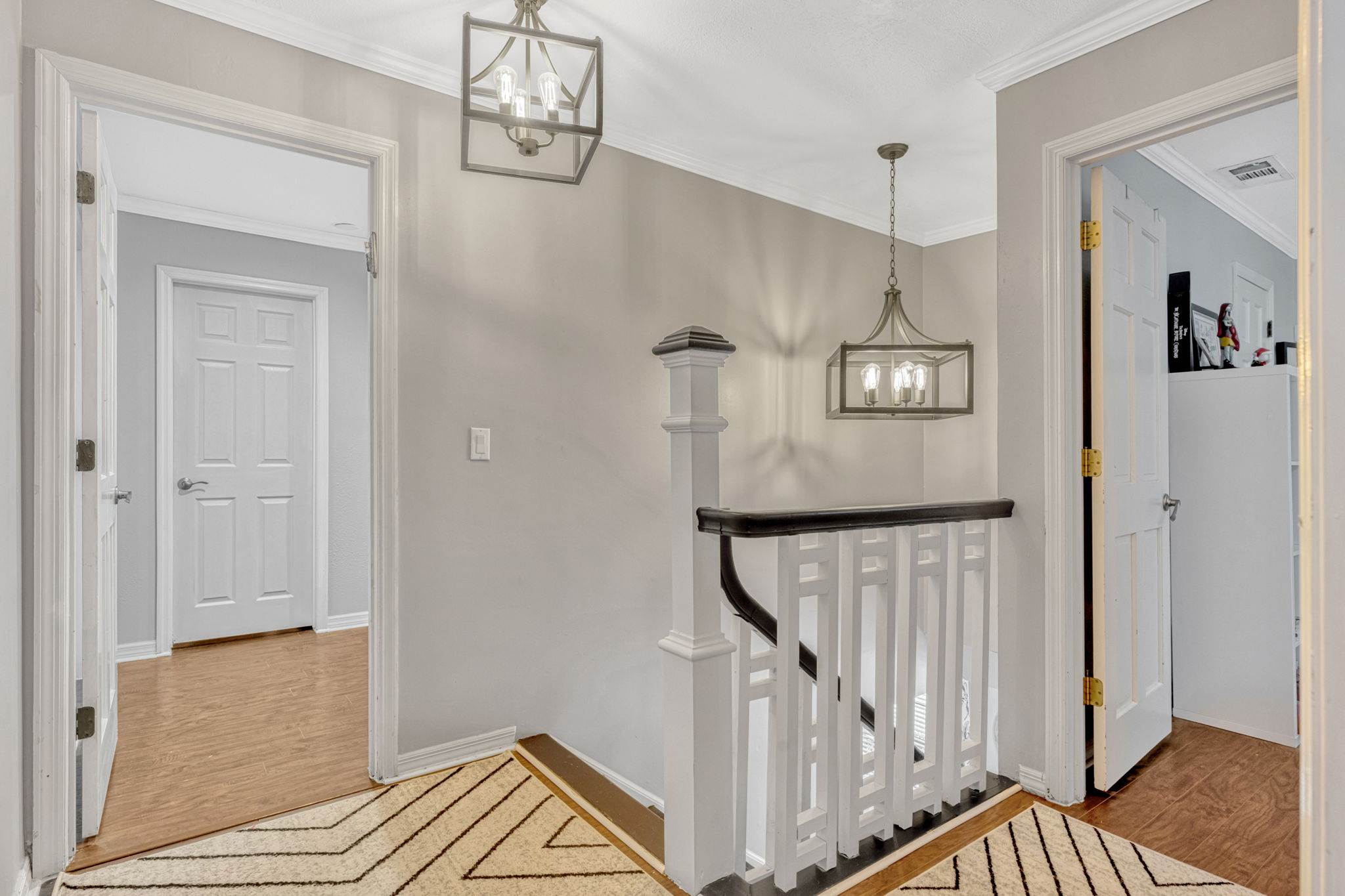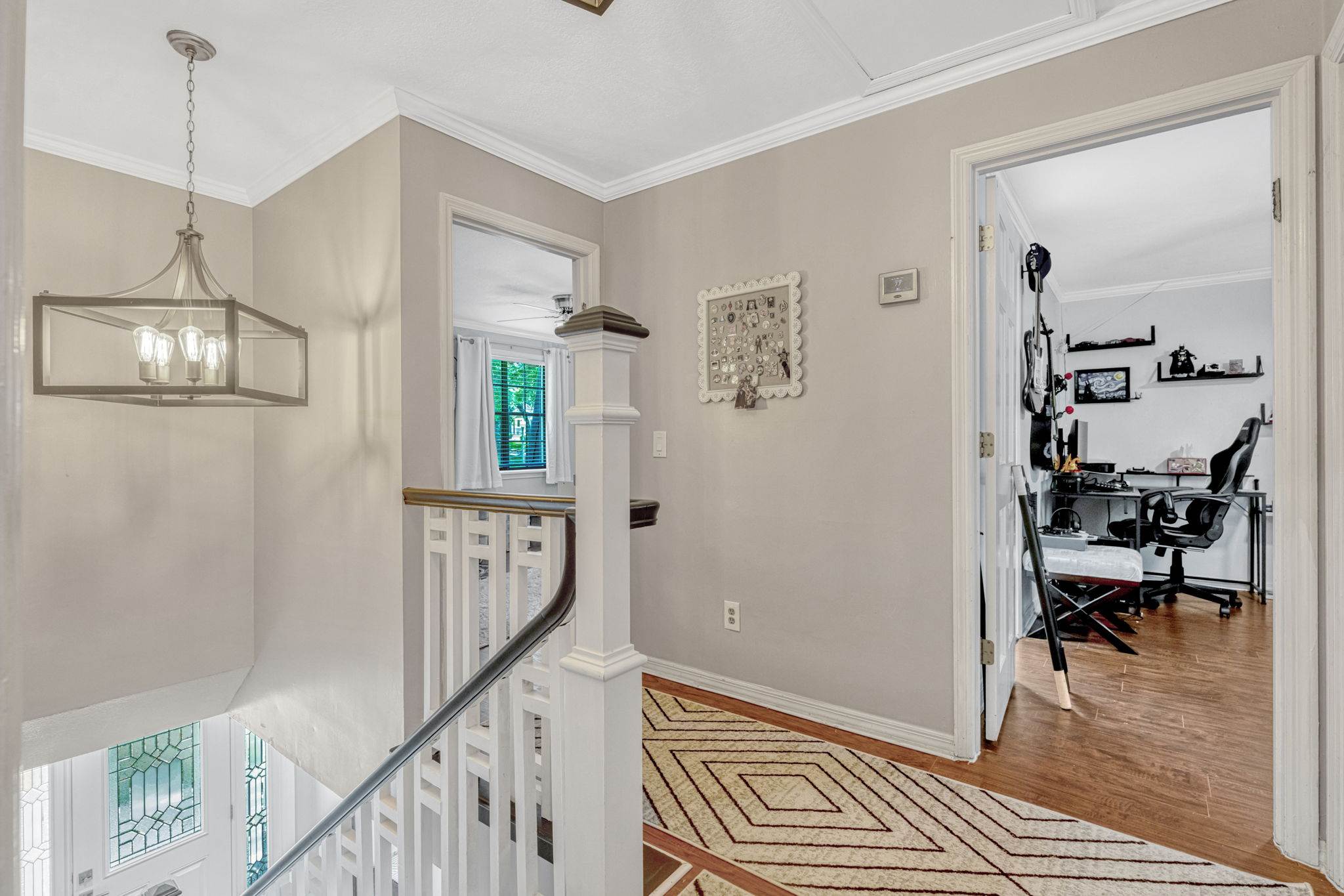 luxury. Step inside to an inviting open living room that flows seamlessly into a formal dining space adorned with crown molding and classic chair rail accents. Durable and stylish wood look tile planks span the main level, creating a warm and cohesive aesthetic.