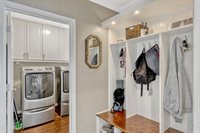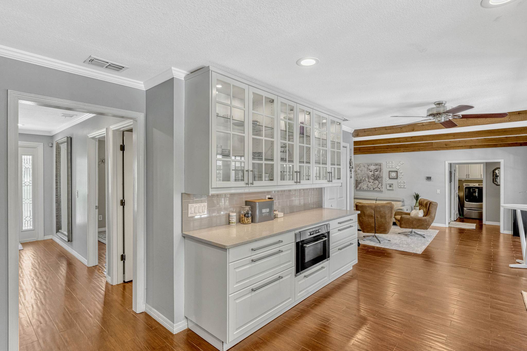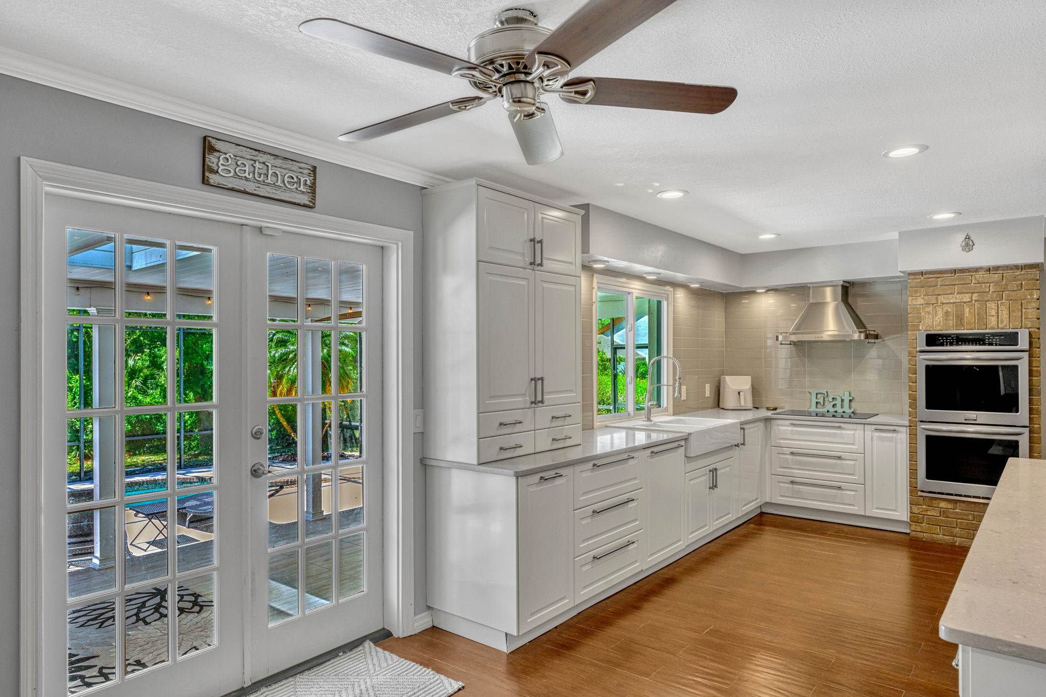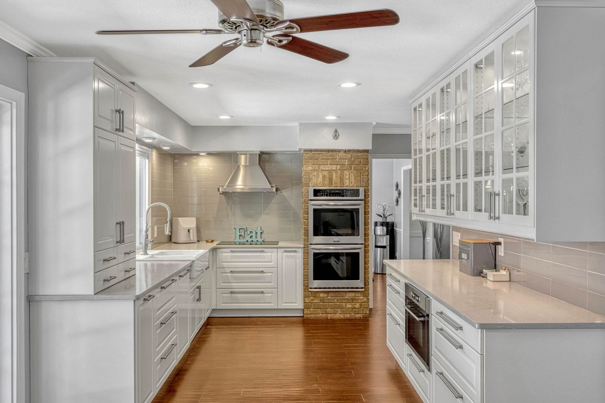 Outfitted with quartz countertops, induction cooktop, double convection ovens, stainless steel hood and appliances, a farmhouse sink, and designer tile backsplash. Contemporary wood cabinetry includes glass-front uppers, deep pot drawers, built in trash bins,