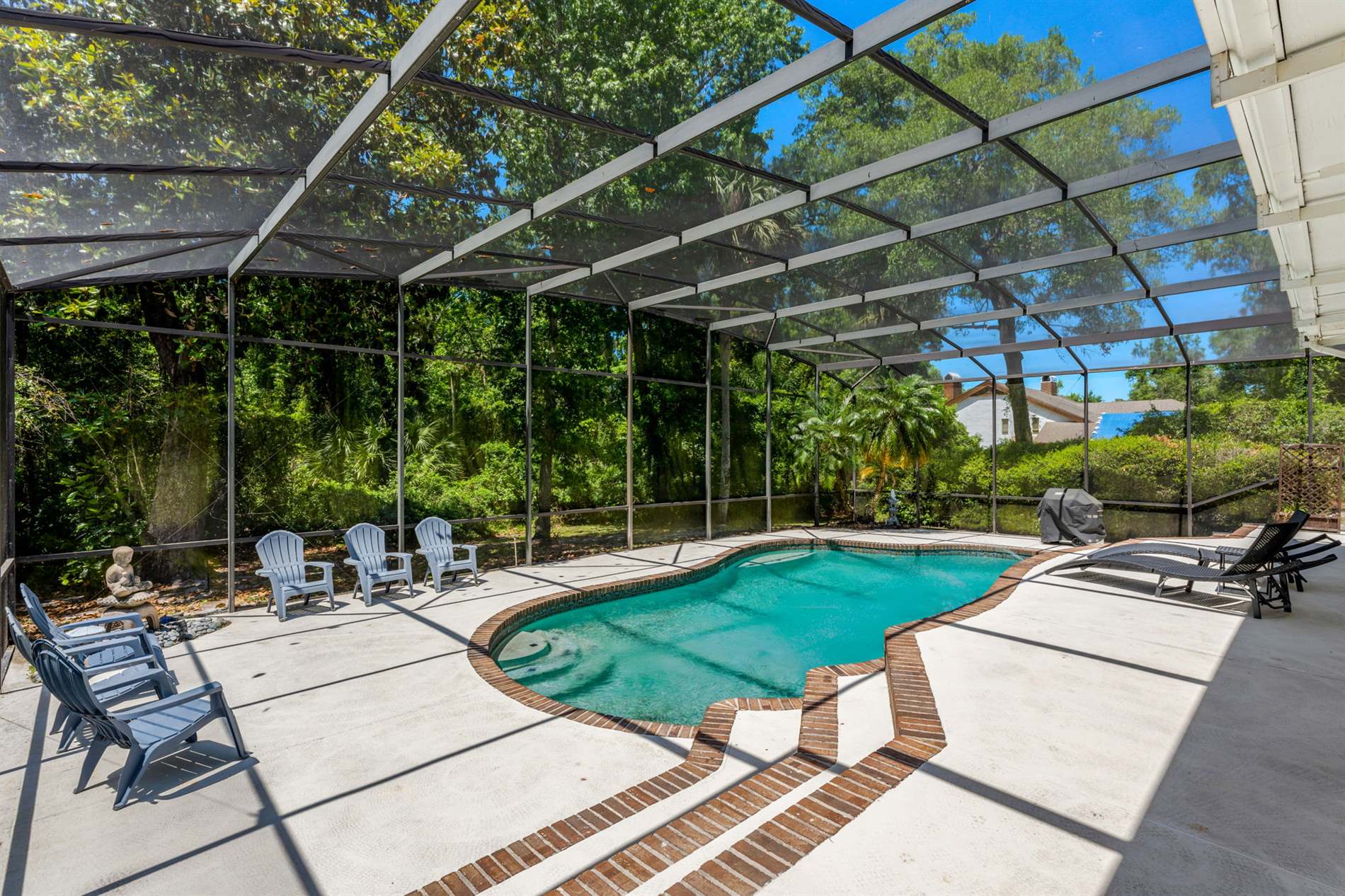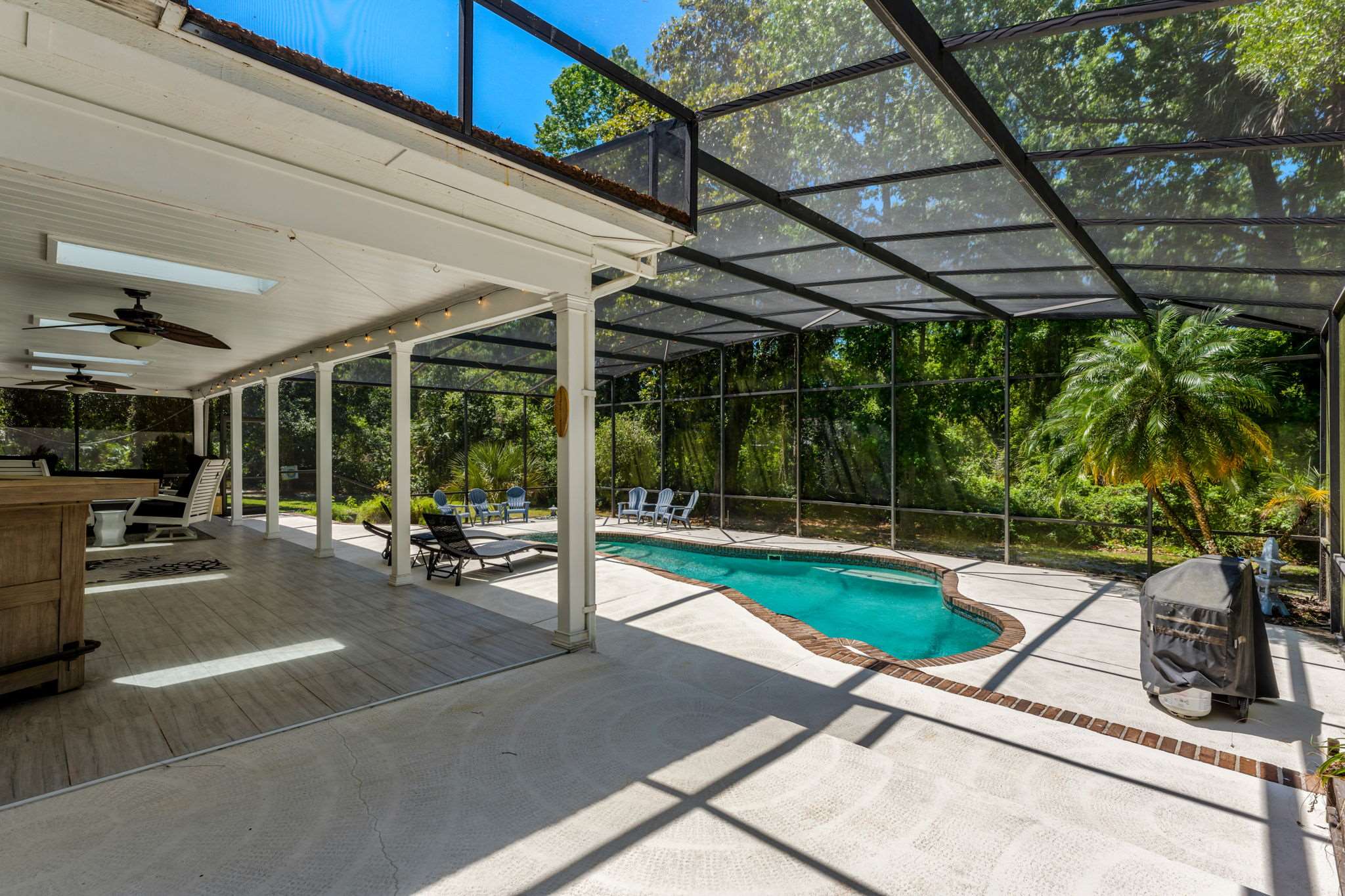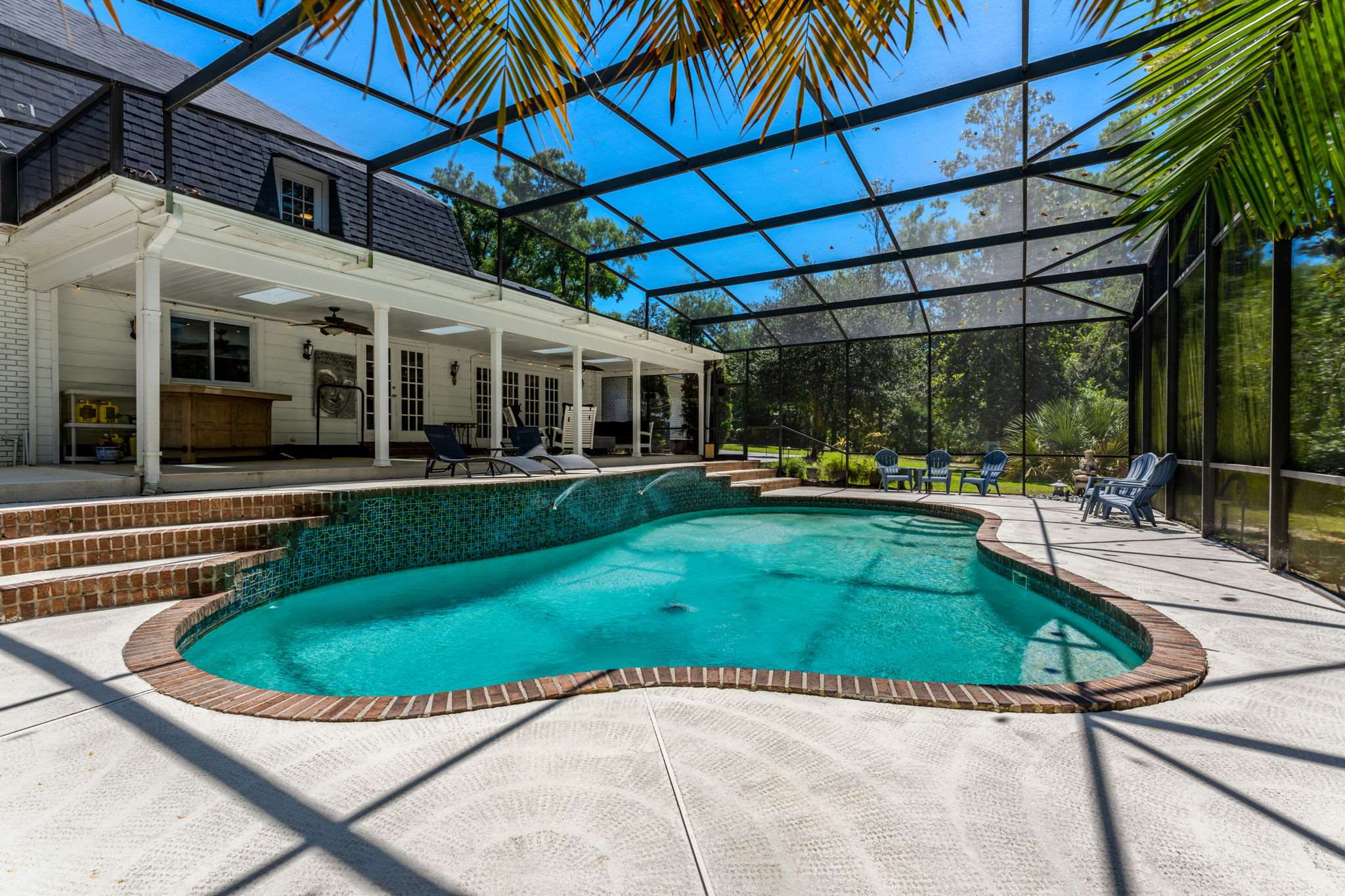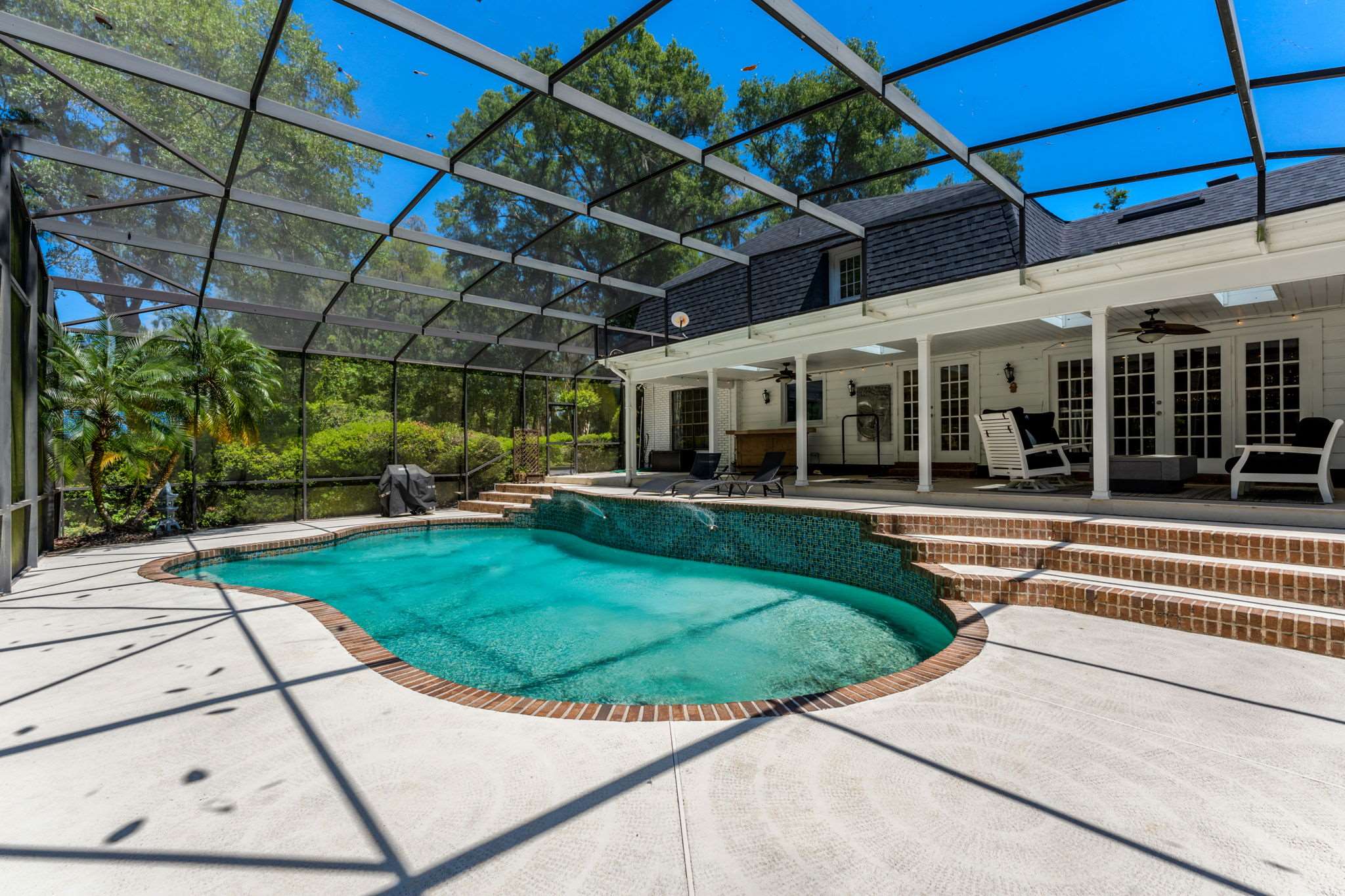featuring oversized outdoor tile ideal for poolside living. A few steps lead down to a stunning free form pool with brick coping and a tranquil water feature set against a lush, wooded backdrop offering unmatched privacy and glowing sunset views. Back inside,