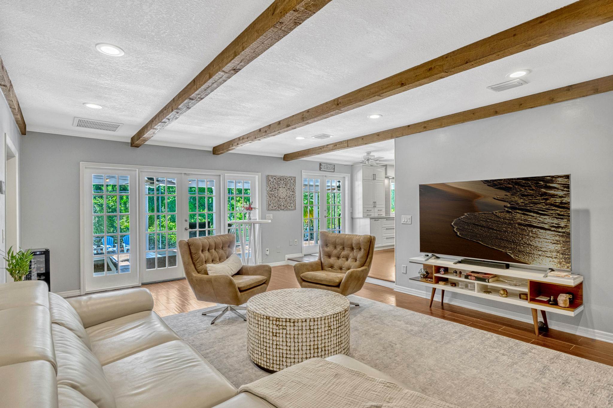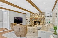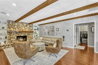 and custom organizers, offering both form and function. The spacious family room exudes comfort with its cedar beamed ceiling, cozy wood burning stone fireplace, and built in bookshelves. Double French doors invite you outside to a magnificent covered lanai
