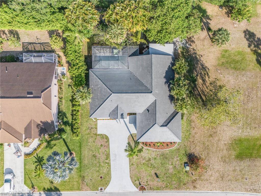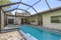 multiple living spaces. The large outdoor living space is equipped with a kitchen, large concrete pool and spa and a caged lanai with multiple access points. The high ceilings and natural light is a huge bonus of this home. Situated on a coveted lot in the