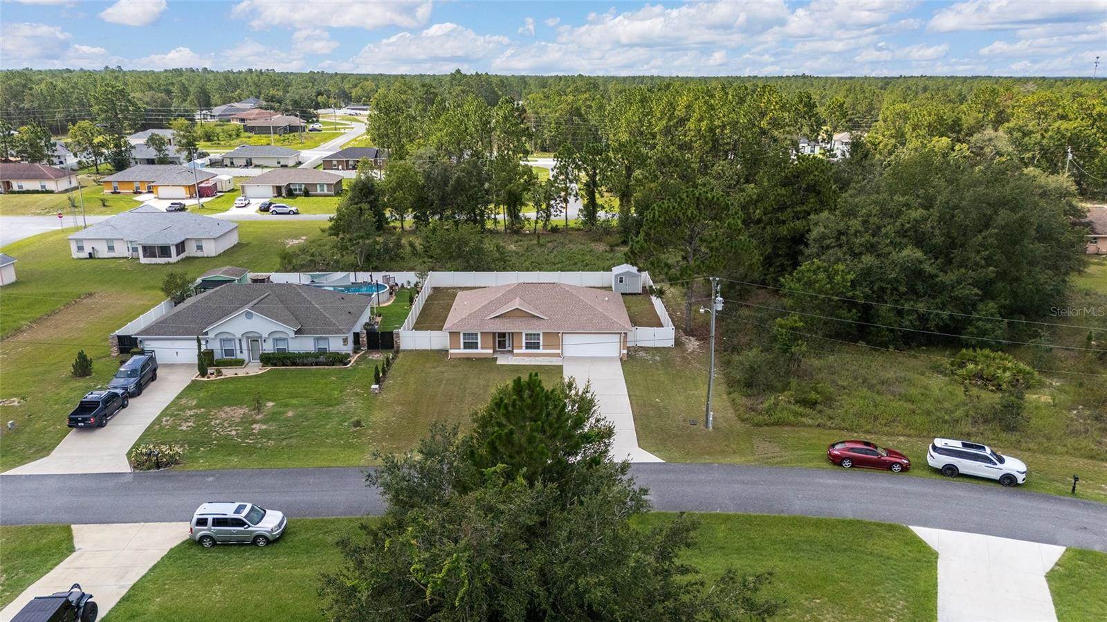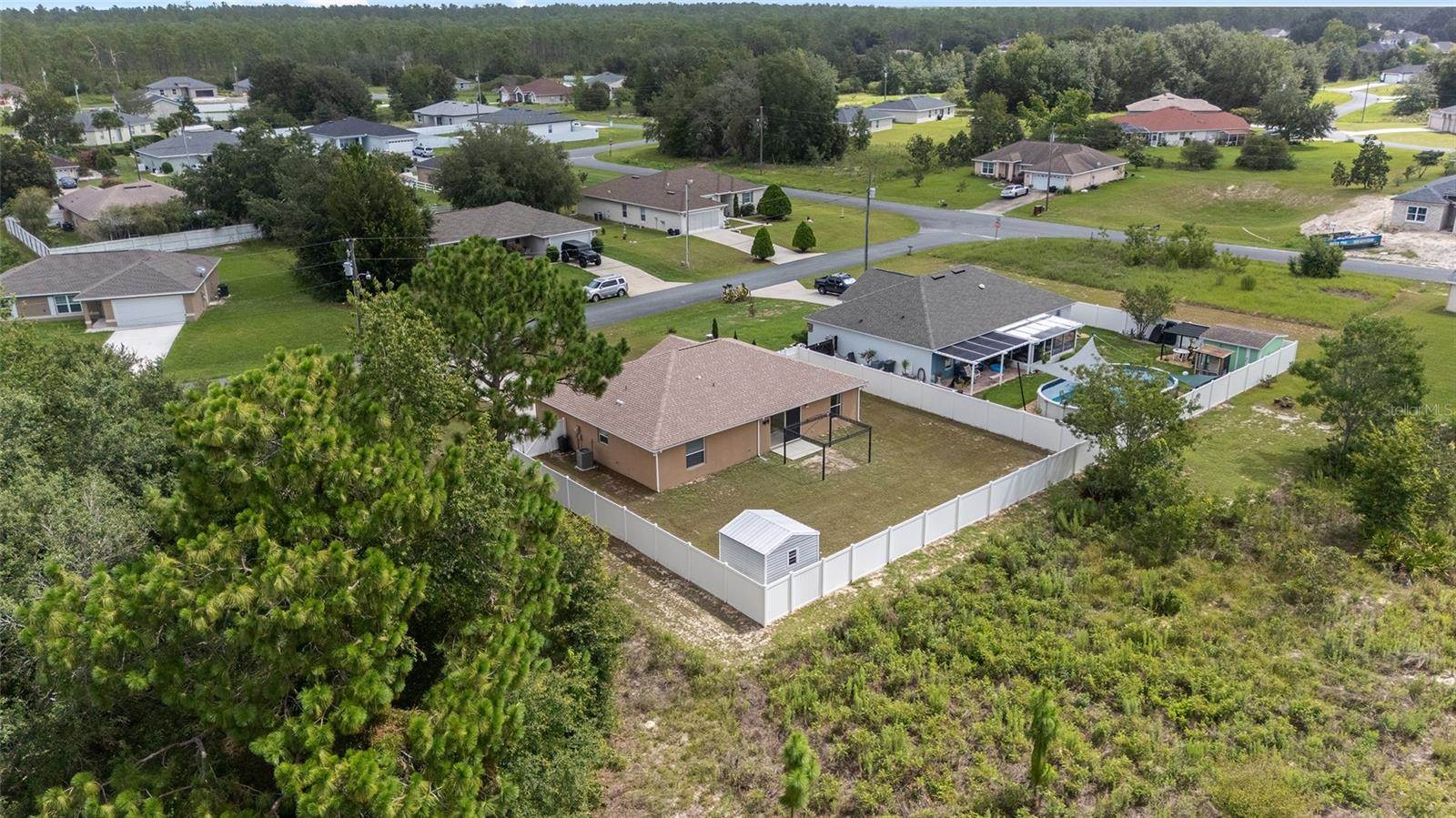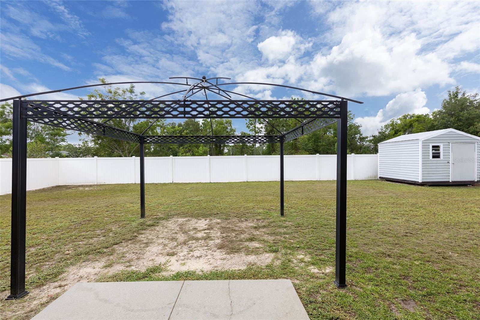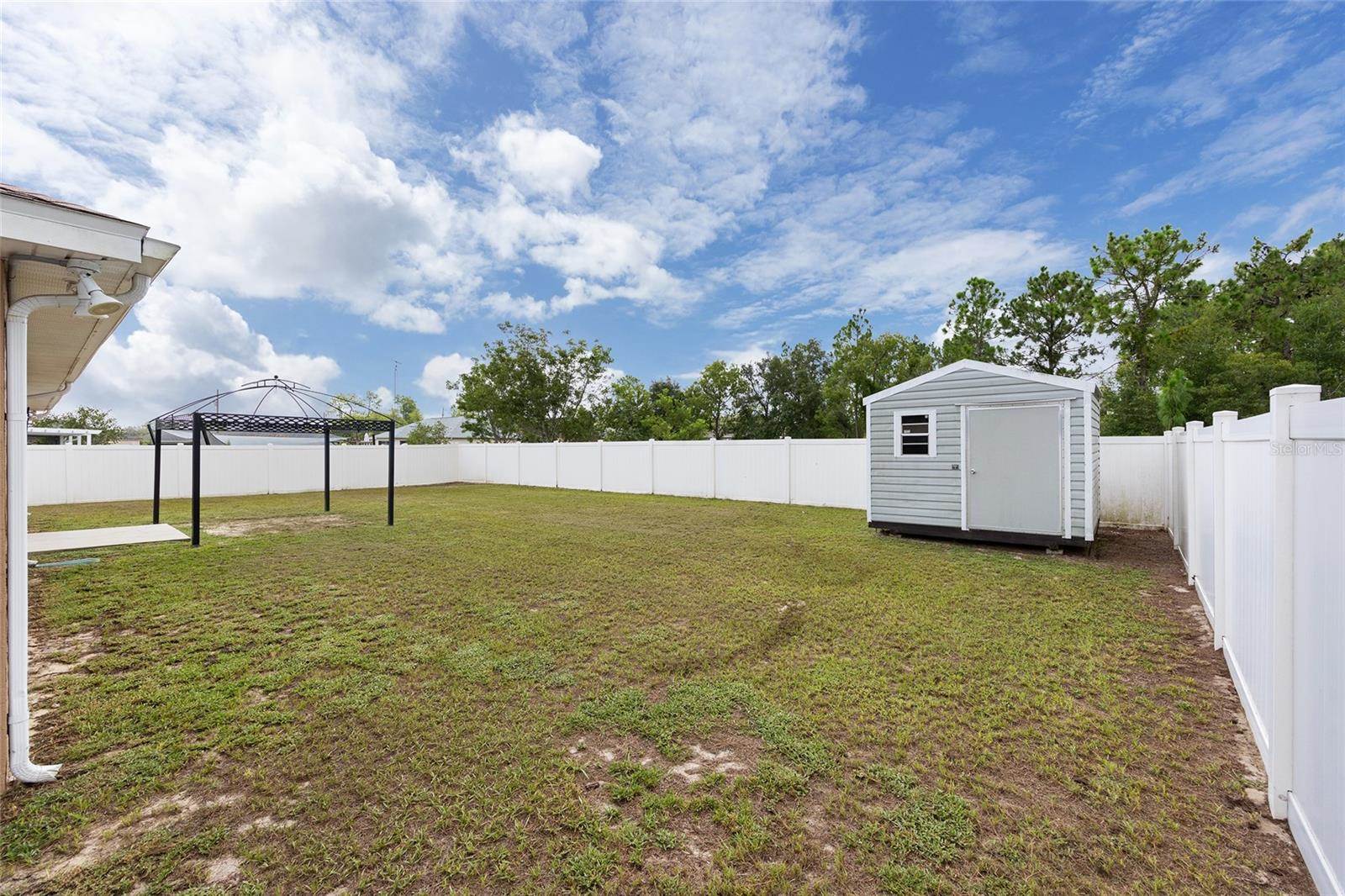 bedrooms and a full guest bath complete the layout. Outside, enjoy a fully fenced yard with white PVC fencing, an 8x8 shed, and a rear patio slab with a freestanding cabana. Located near HWY 484, I-75, shopping, parks, and schools. This home combines value,