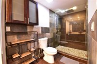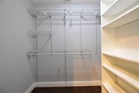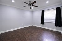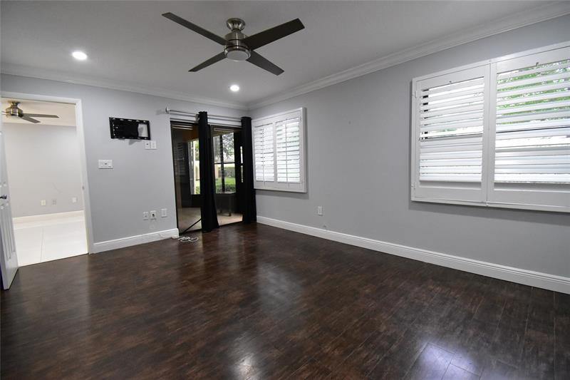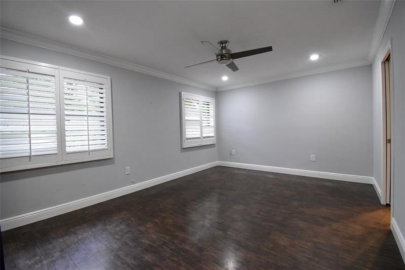 a glass-enclosed shower and mosaic tile accents. The generous bedrooms, adorned with rich hardwood floors and modern ceiling fans, offer tranquil retreats. Bask in the abundance of natural light streaming through plantation shutters, creating an airy ambiance