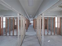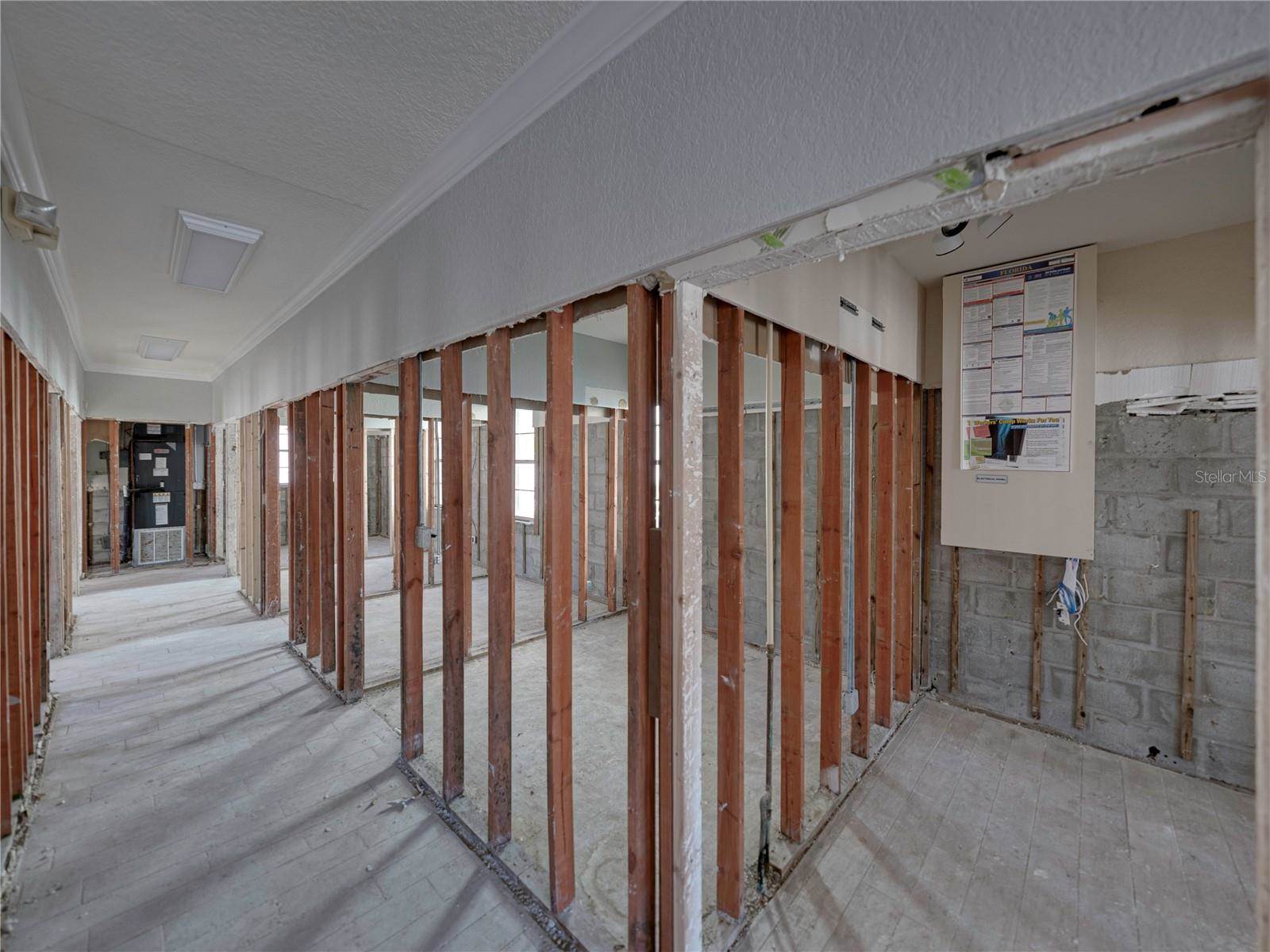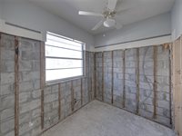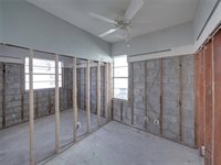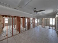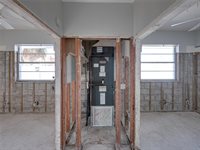 growth would subsequently occur. The drywall was removed to 7'. The electrical panel, updated in 2019, was above the water line and not part of the insurance claim. The waterline from storm surge was approximately 45". The space is not a blank canvas, as the