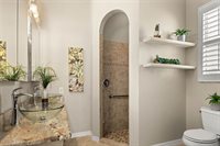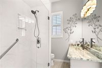 a large walk-in closet. The ensuite bathroom has a ROMAN SHOWER and a dual sink vanity with GRANITE countertops. The cozy front bedroom is the only carpeted room with direct access to a hall bath. The hall bath has a walk-in shower with glass doors, GRANITE