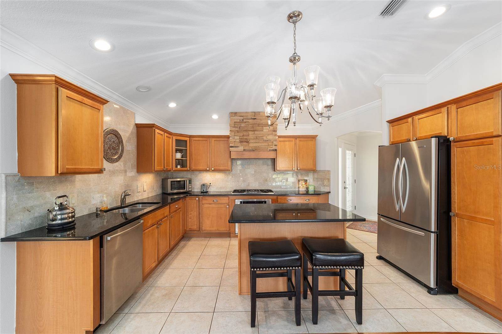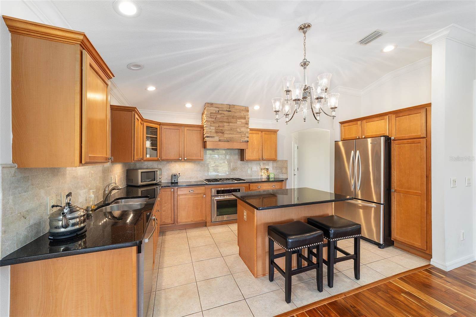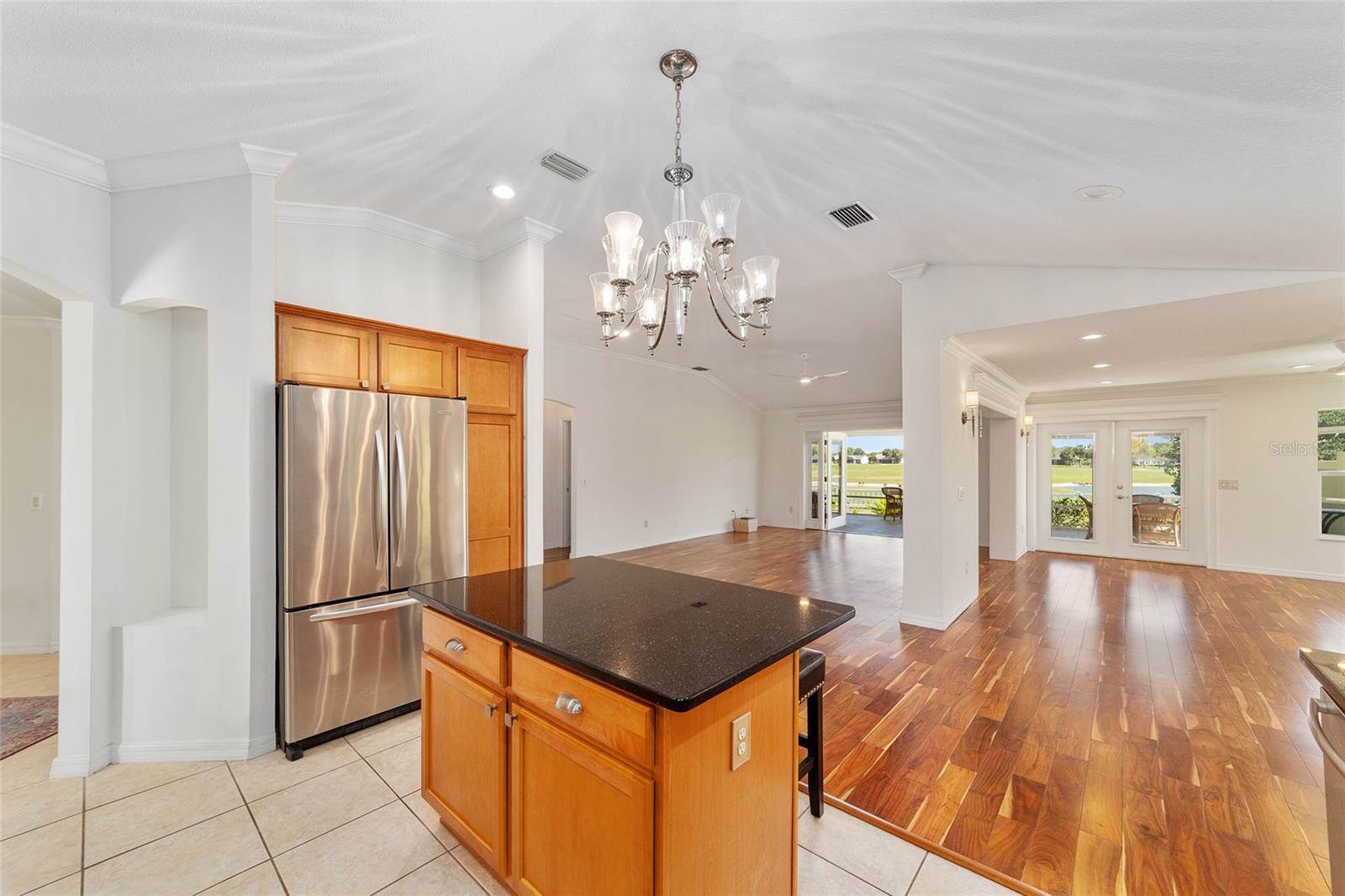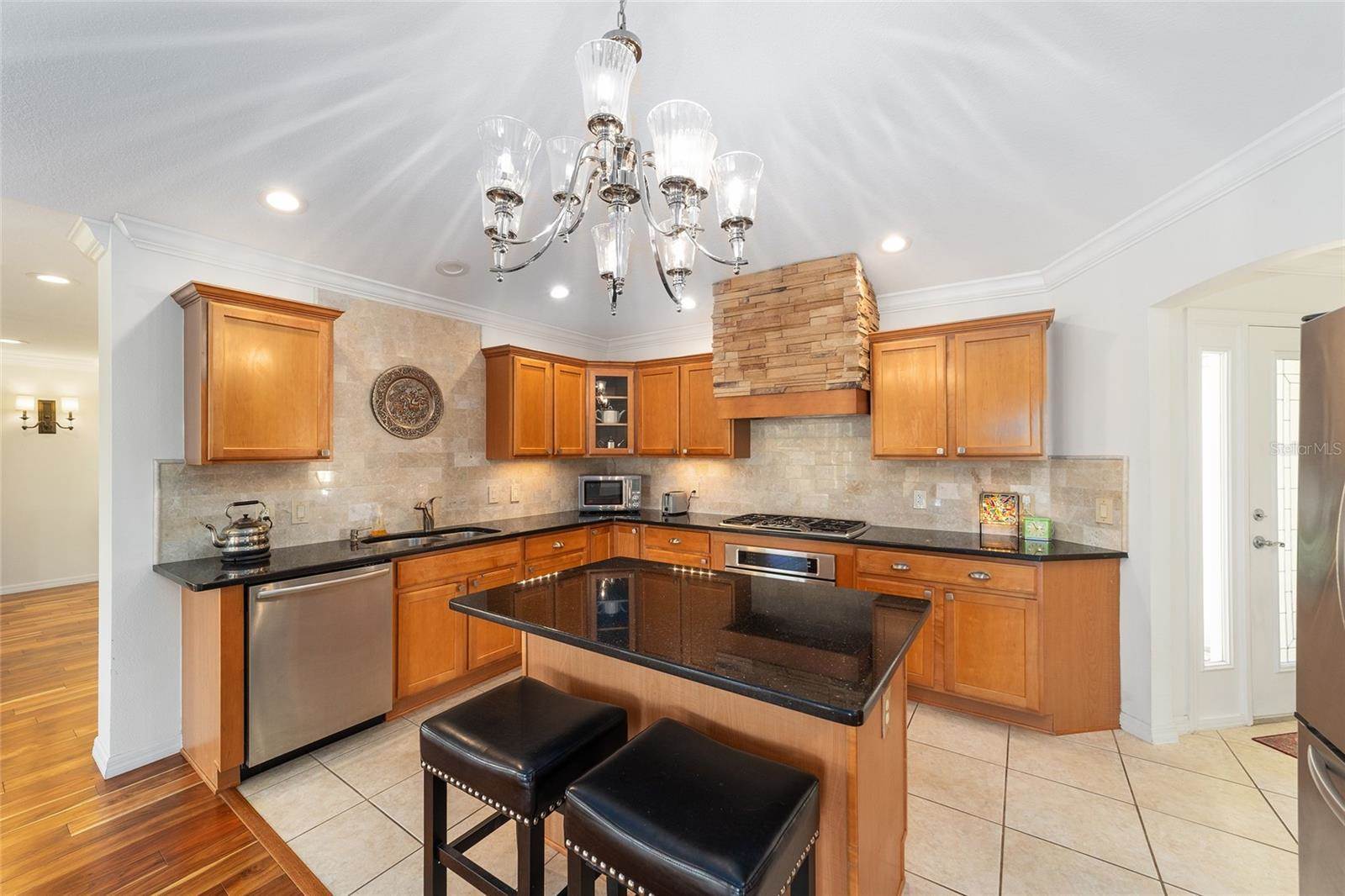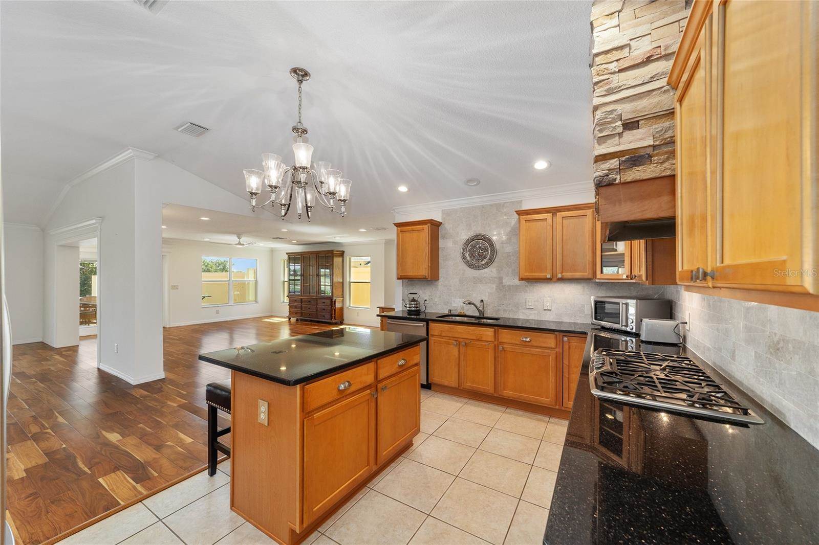 room and family room with integral blinds. LOVELY HARDWOOD flooring throughout the entire living area and bedrooms with tile in the foyer and kitchen. The OPEN kitchen offers GRANITE countertops with stone backsplash, an island with a beautiful Hinkley chandelier