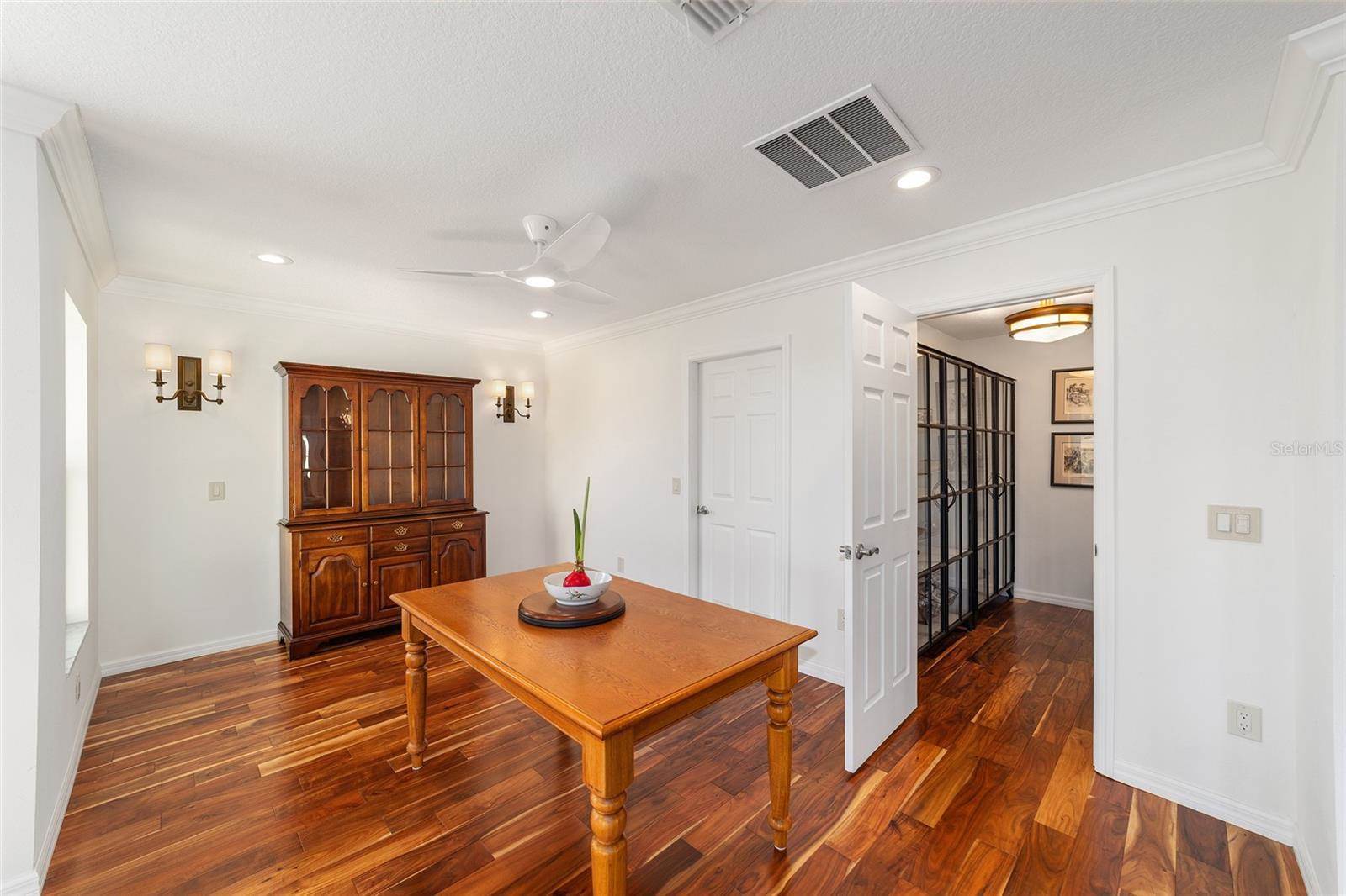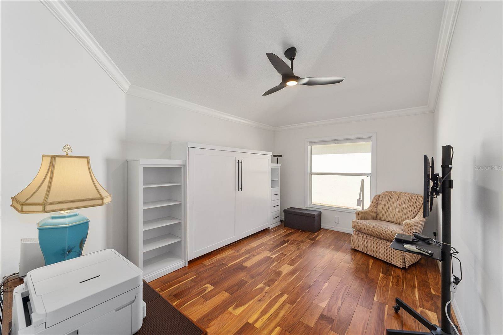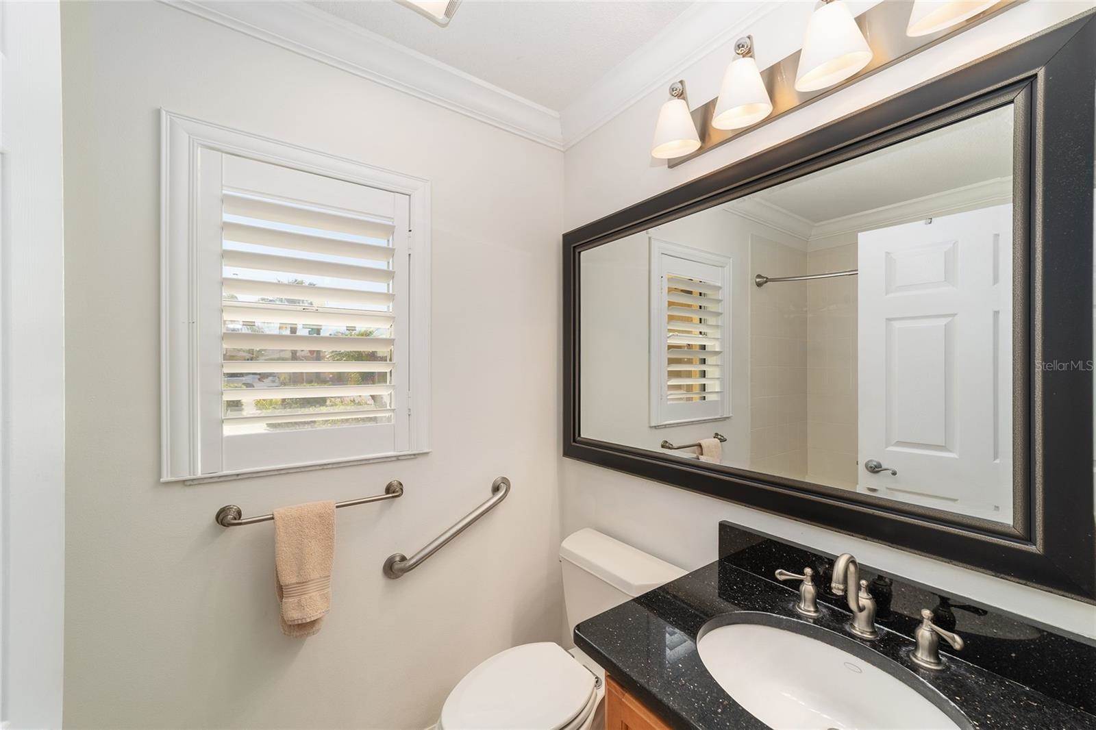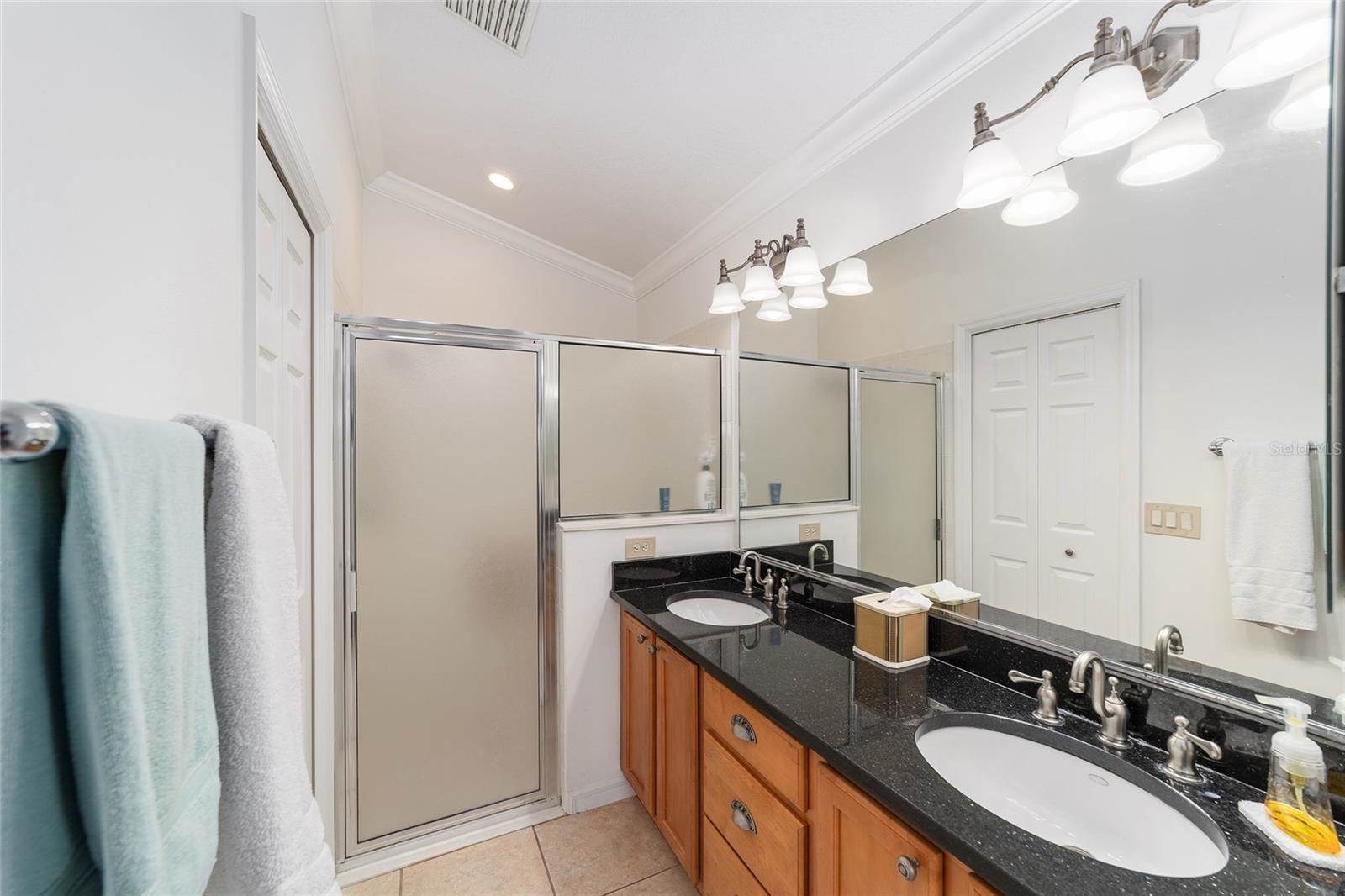 to the lanai, and an EN-SUITE bath with granite counters, dual sinks, shower, separate toilet room, and a large WALK-IN CLOSET with built-ins. One guest room offers a QUEEN SIZE MURPHY BED – both guest rooms have built-in closets, and the guest bath has granite