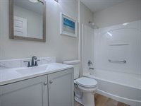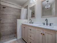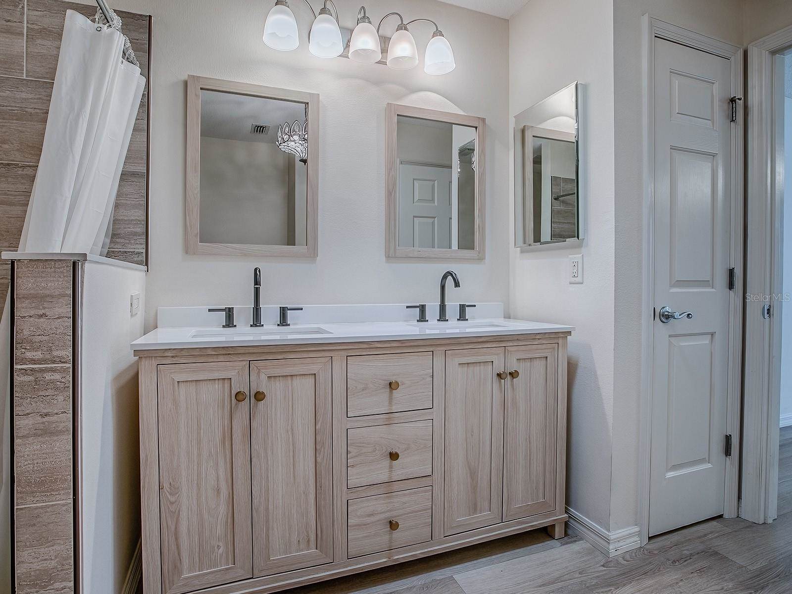 with solid surface countertops, DUAL SINKS, a linen closet, and a NEW WALK-IN lovely tiled SHOWER. The private guest suite also has a remodeled EN-SUITE BATH with NEW cabinets, and the same lovely countertops with a tub/shower. You’ll really enjoy the additional