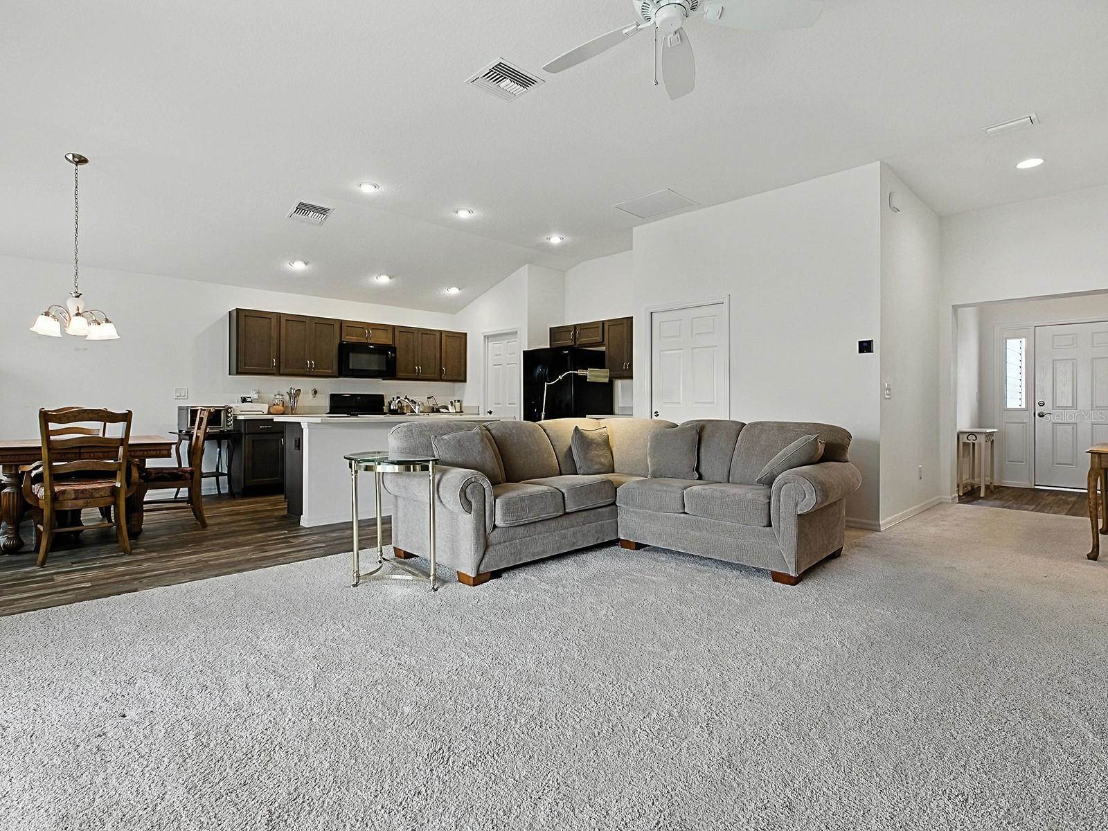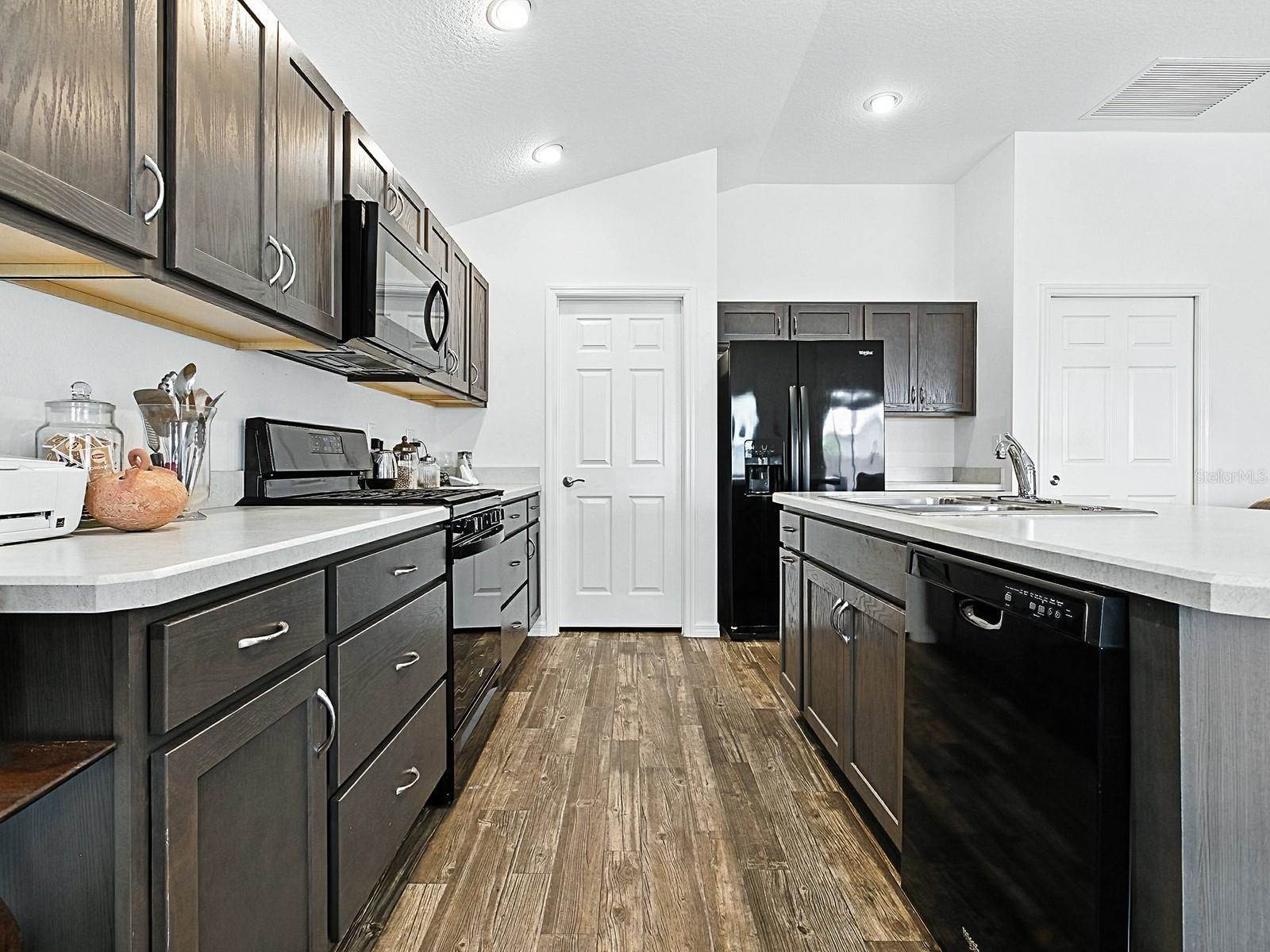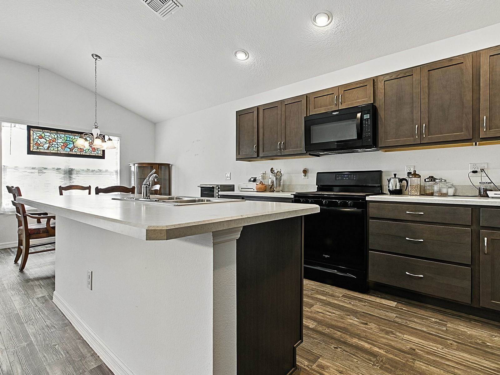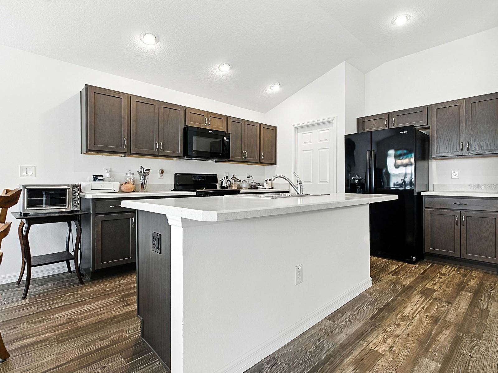 living room that opens with sliding glass doors out to the screened lanai with a fence behind offering much sought after PRIVACY! The kitchen has beveled-edge laminate counter tops with black appliances, with a GAS stove and offers lots of counter space, cabinets,