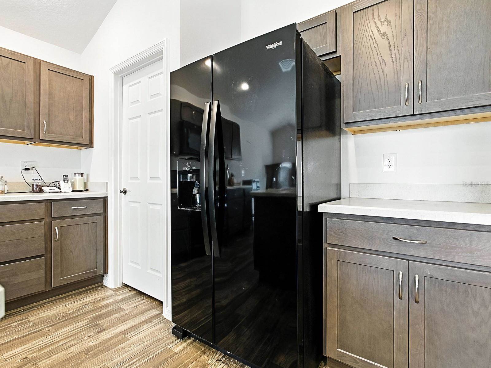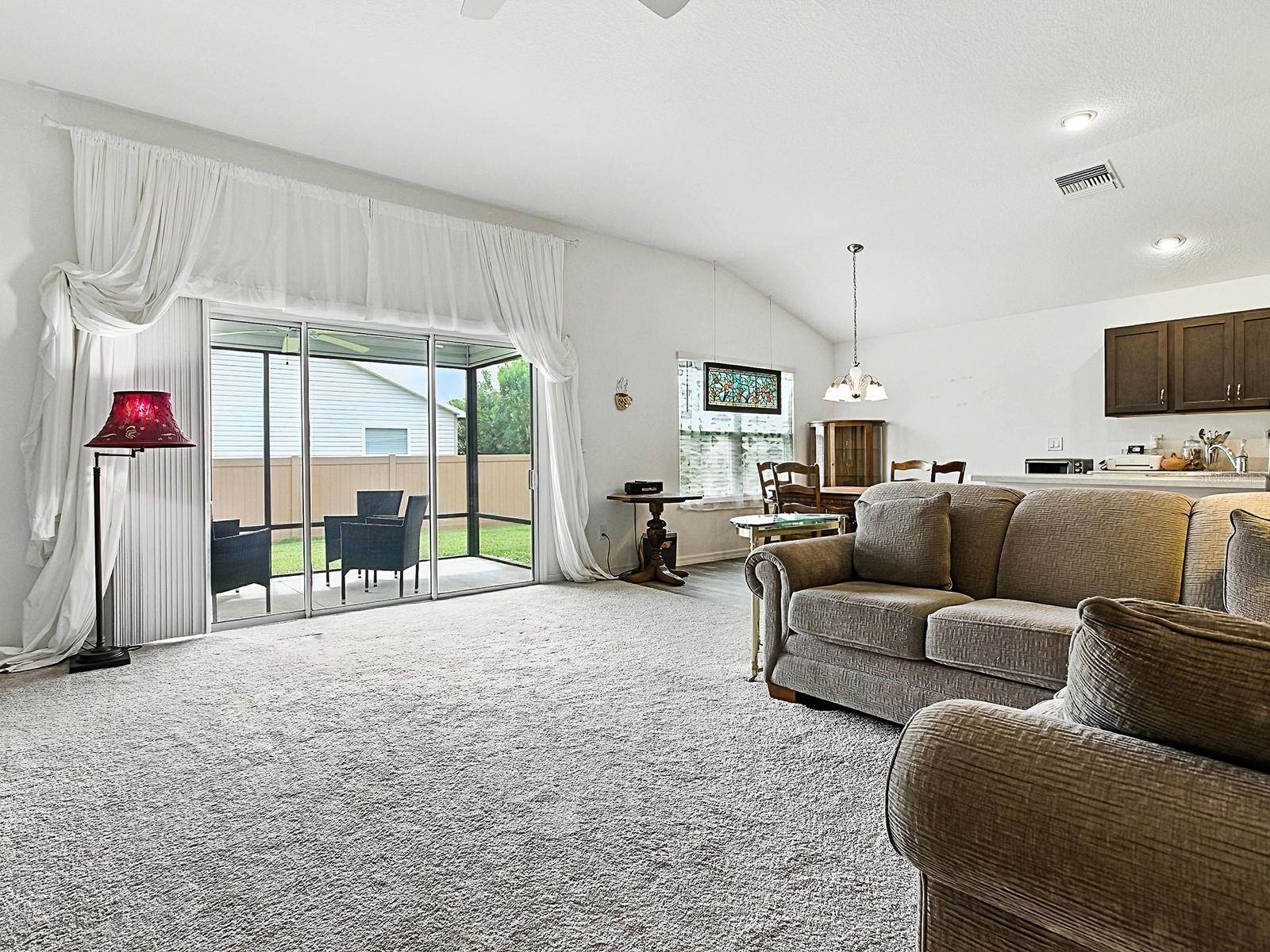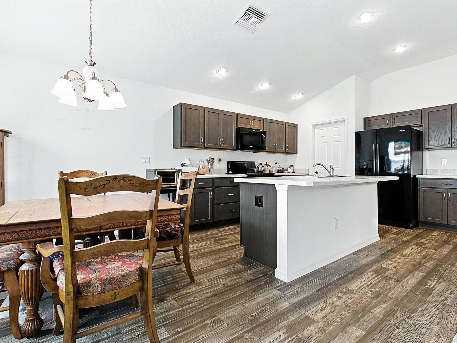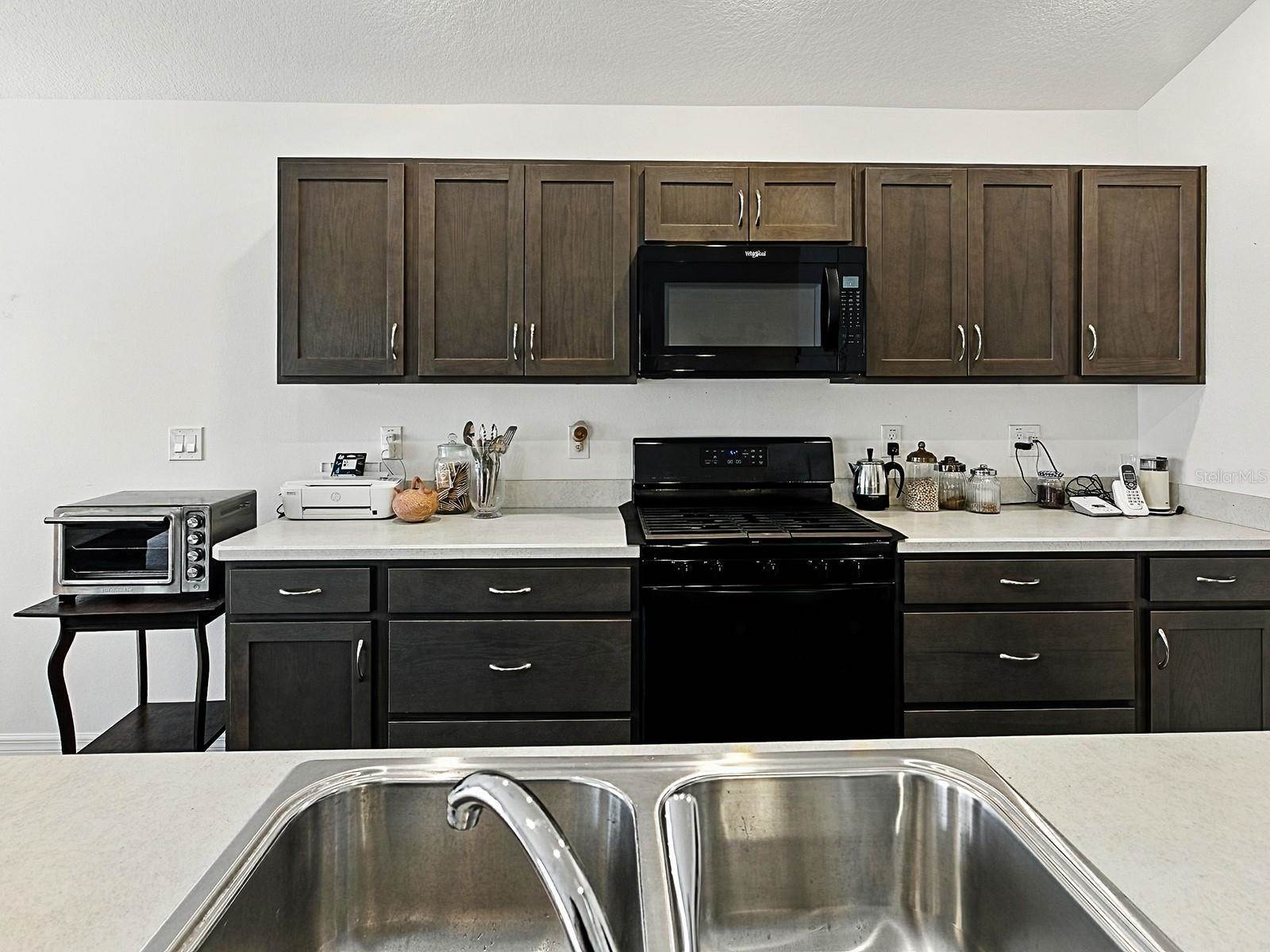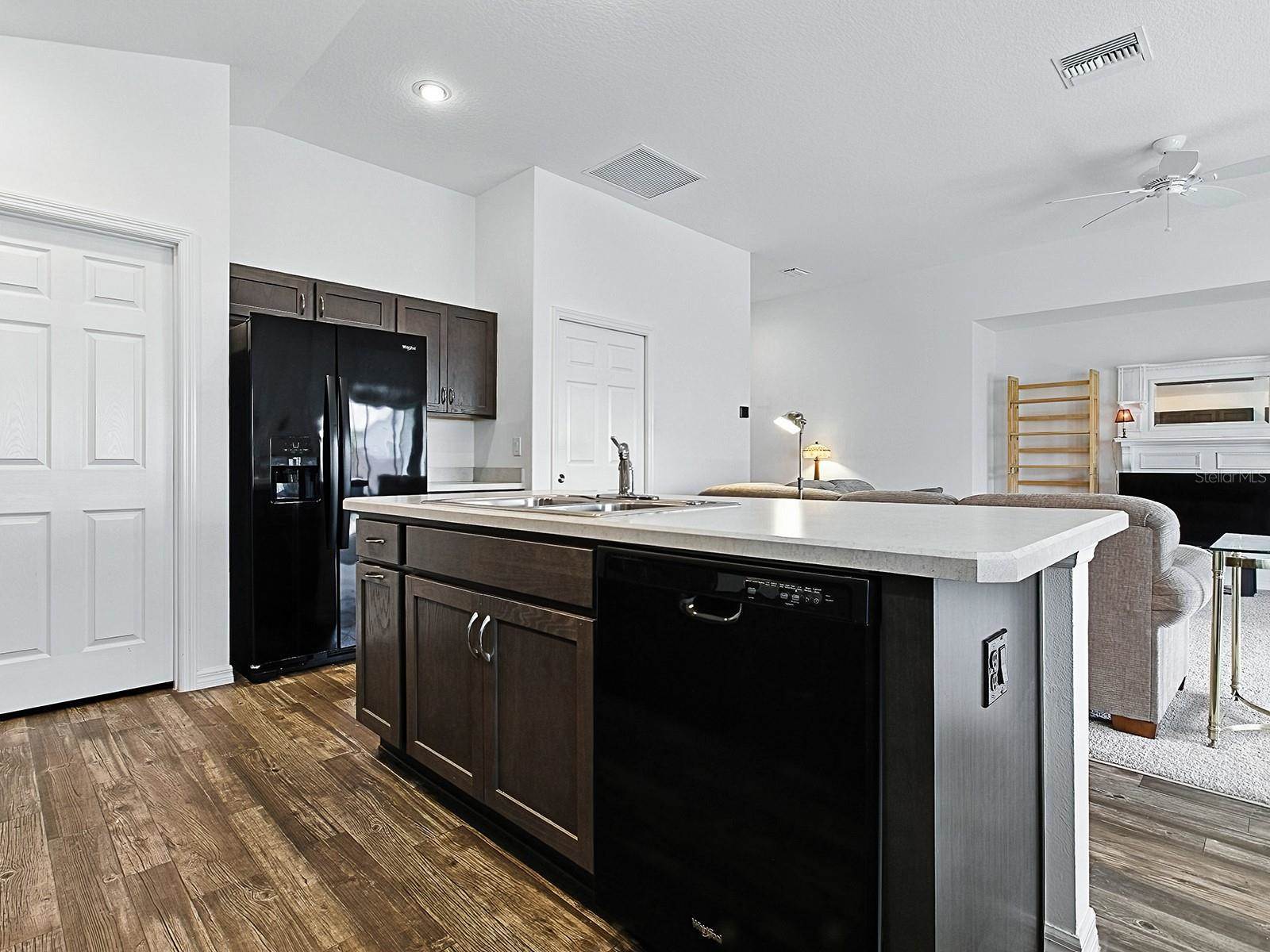 living room that opens with sliding glass doors out to the screened lanai with a fence behind offering much sought after PRIVACY! The kitchen has beveled-edge laminate counter tops with black appliances, with a GAS stove and offers lots of counter space, cabinets,