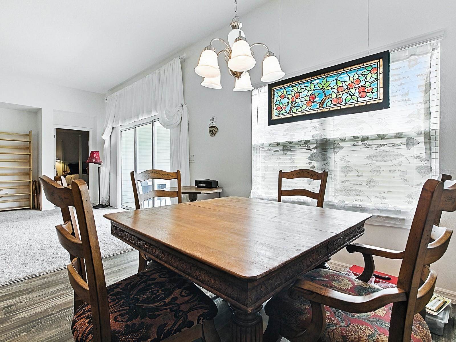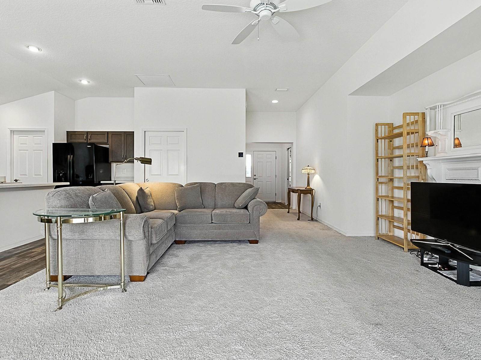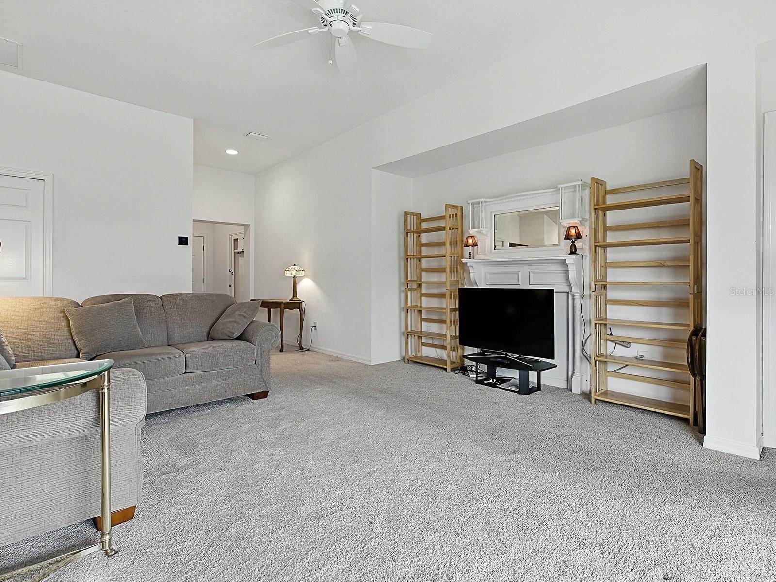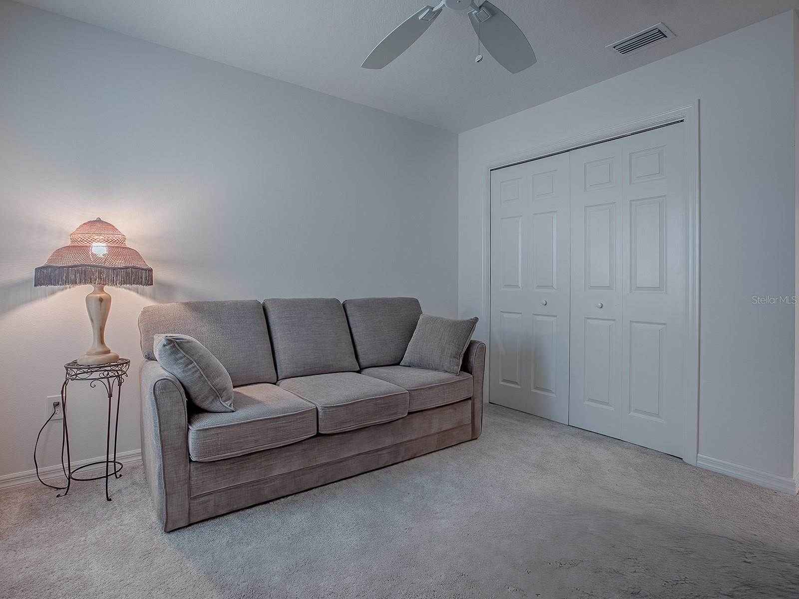 living room that opens with sliding glass doors out to the screened lanai with a fence behind offering much sought after PRIVACY! The kitchen has beveled-edge laminate counter tops with black appliances, with a GAS stove and offers lots of counter space, cabinets,