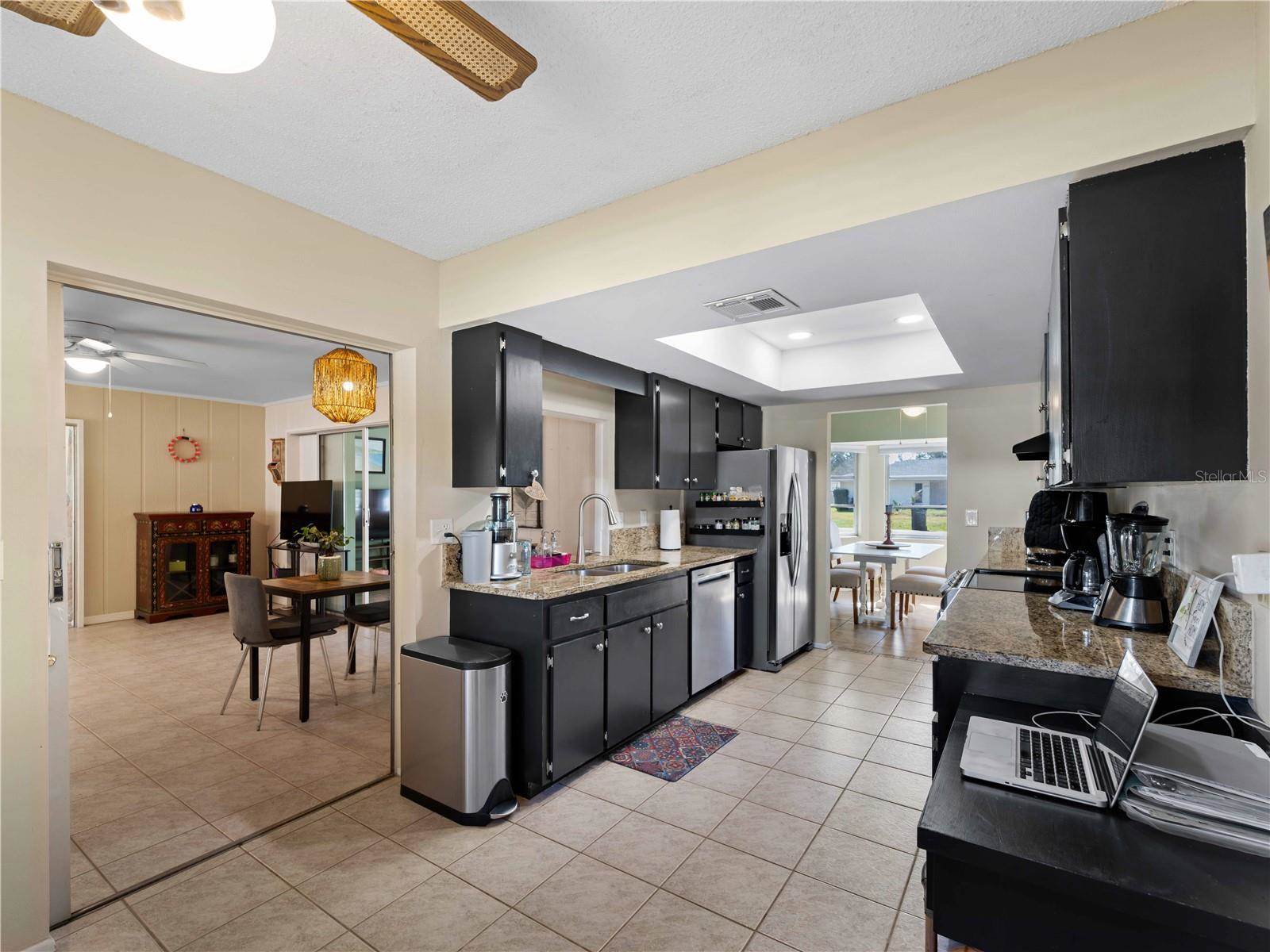 it both stylish and practical. The updated kitchen boasts granite countertops, recessed lighting, and new stainless steel appliances (2021), including a second fridge (2023). A bay window overlooks the fenced backyard, letting natural light flood the space.