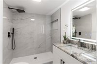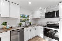 luxury vynil flooring throughout, providing a seamless and elegant feel. The brand-new kitchen features luxurious marble countertops, custom cabinetry, and a sleek, new Whirlpool appliance package with full warranty, perfect for cooking and entertaining. The