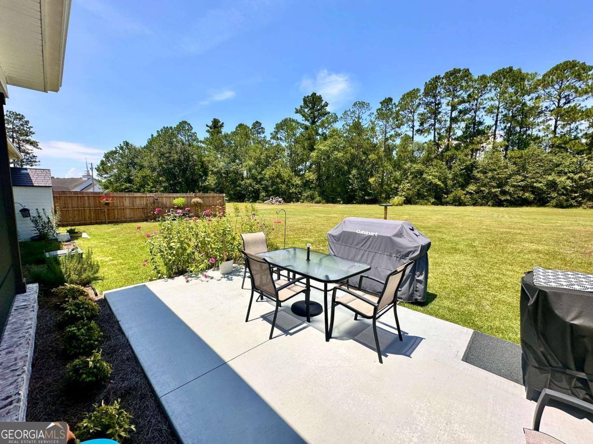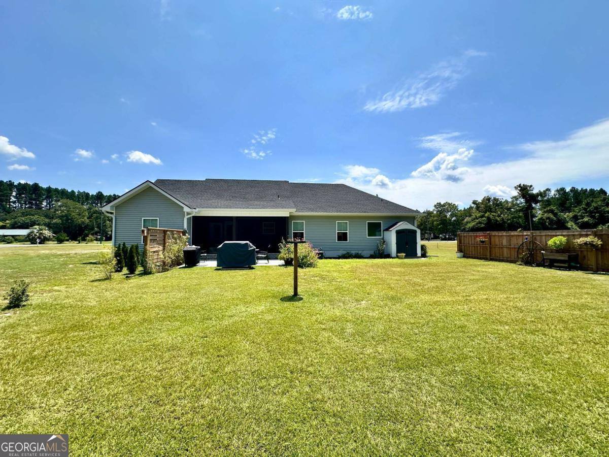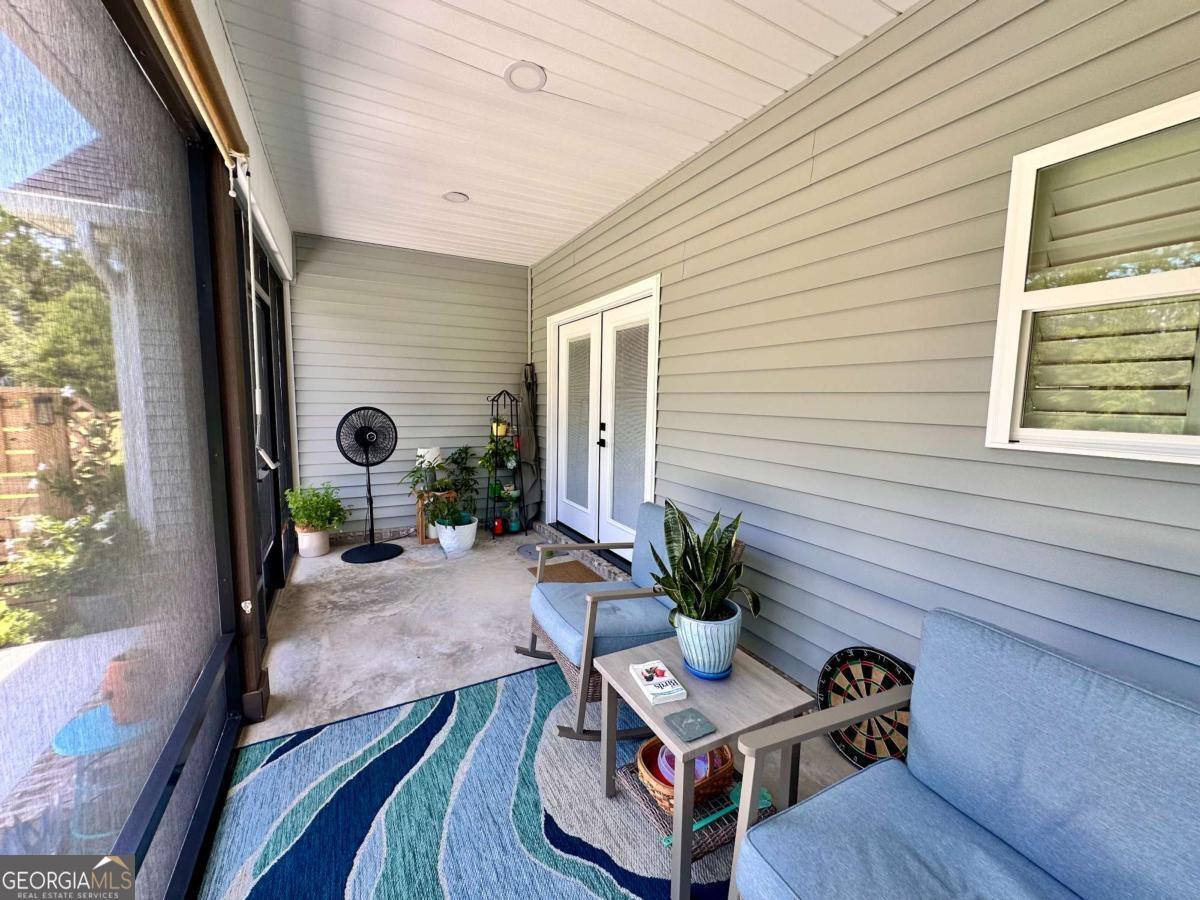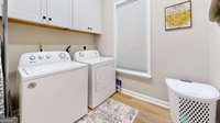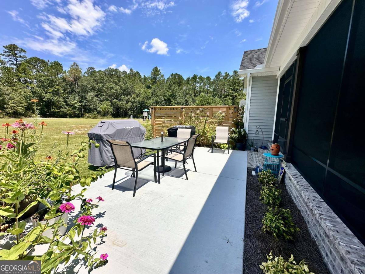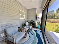 soaking tub, and a double vanity. A spacious laundry room with cabinetry offers additional storage and practicality. French doors open onto a screened-in, covered concrete back porch overlooking a patio and a generous backyard, providing the ideal space for