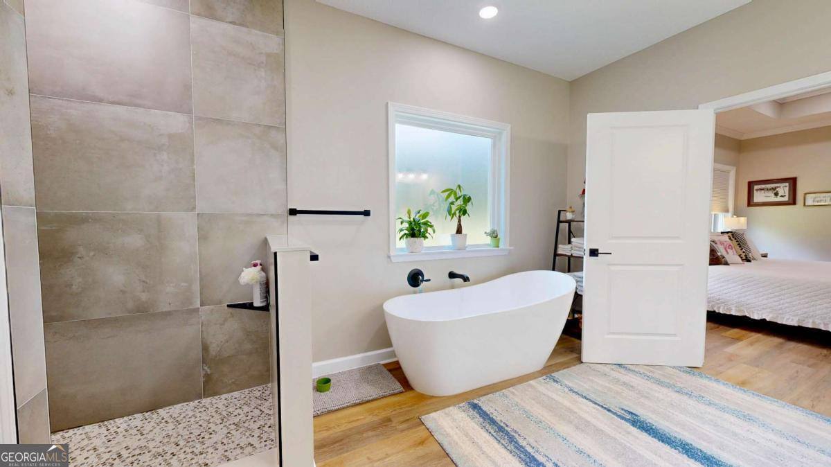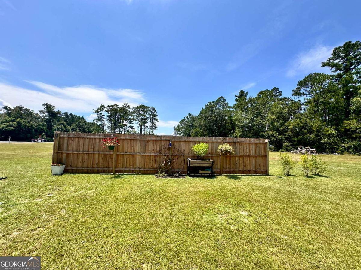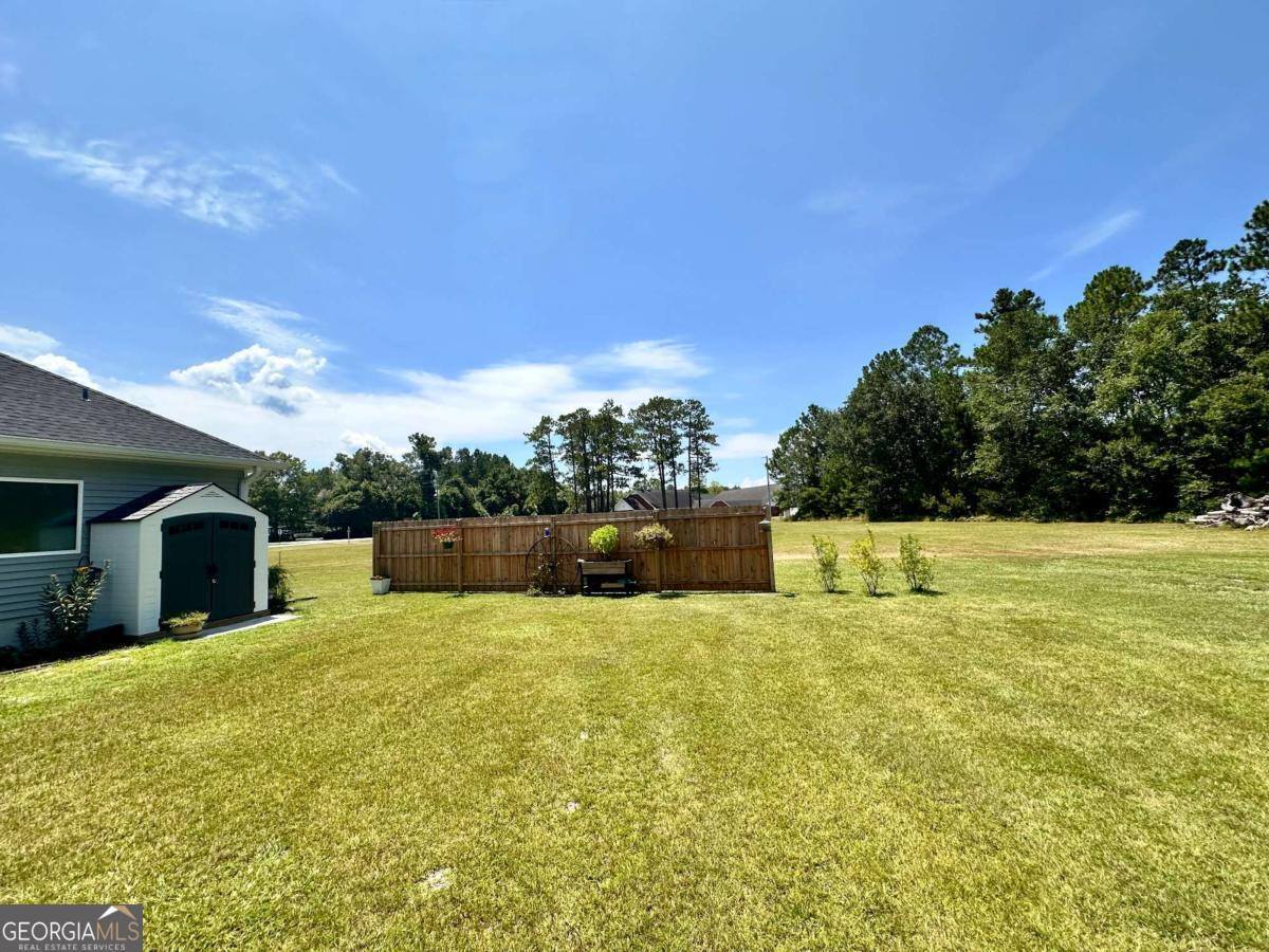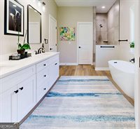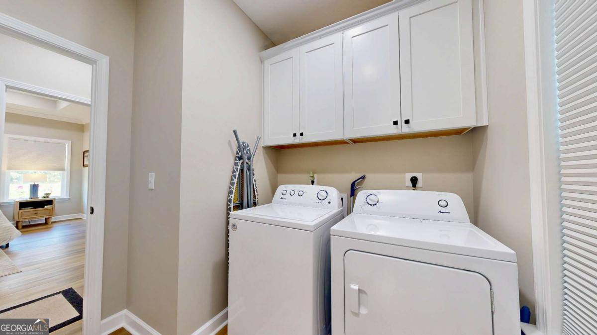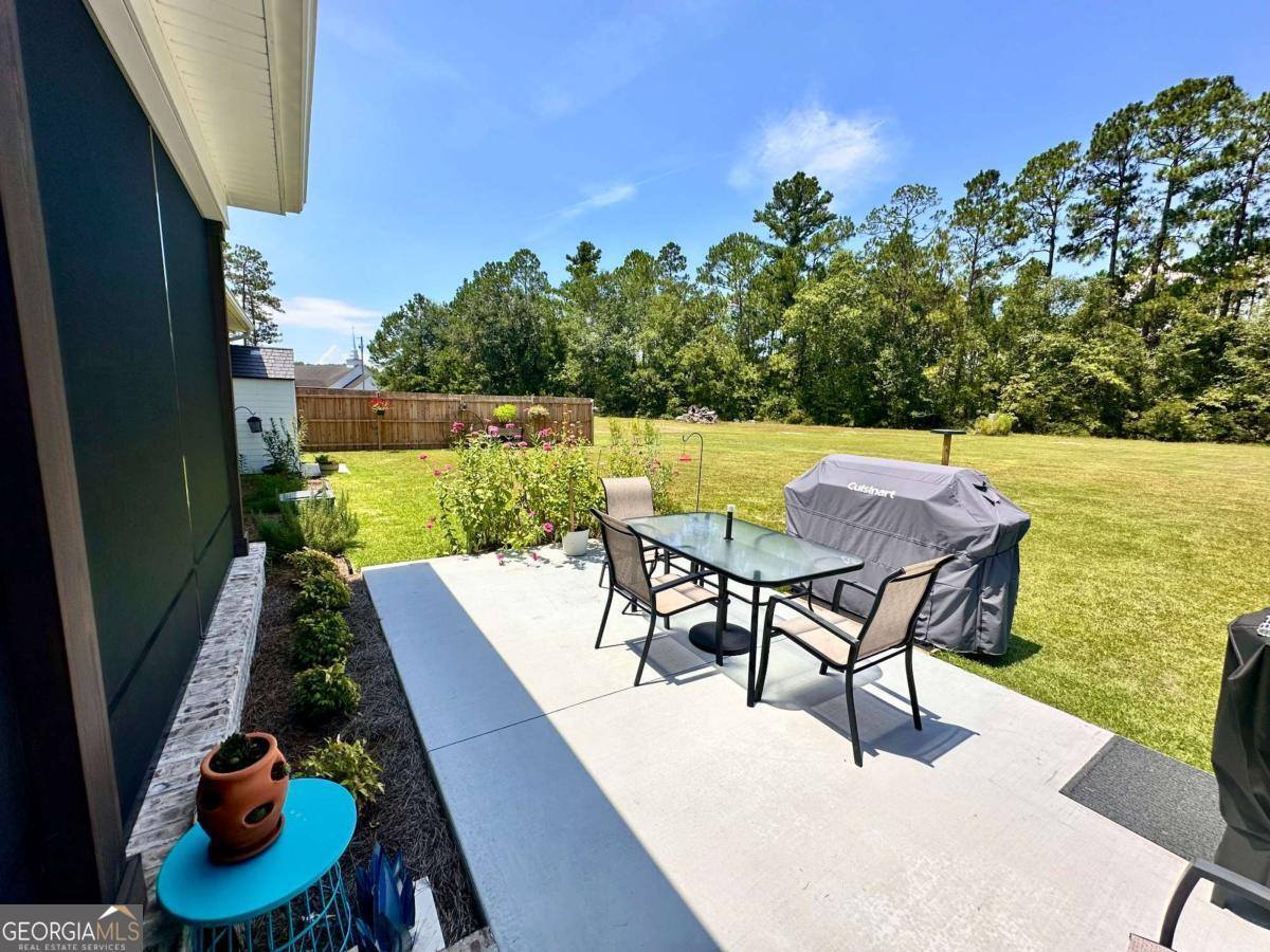 soaking tub, and a double vanity. A spacious laundry room with cabinetry offers additional storage and practicality. French doors open onto a screened-in, covered concrete back porch overlooking a patio and a generous backyard, providing the ideal space for