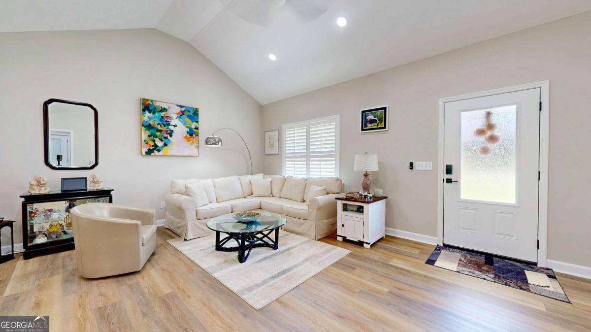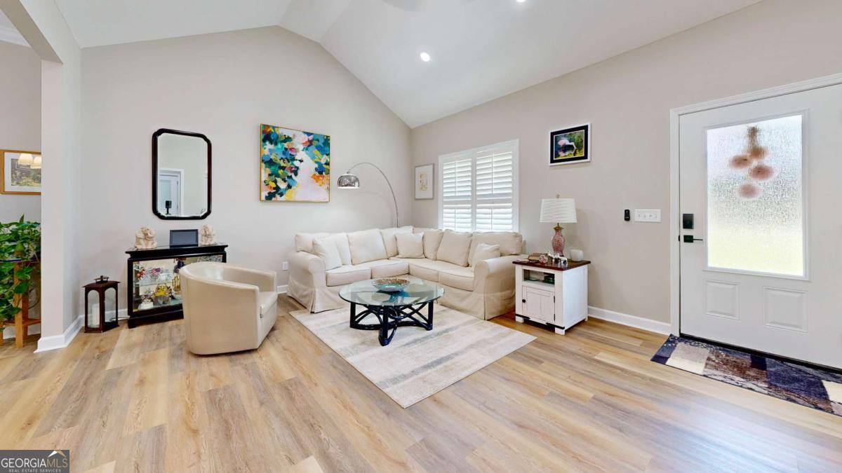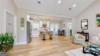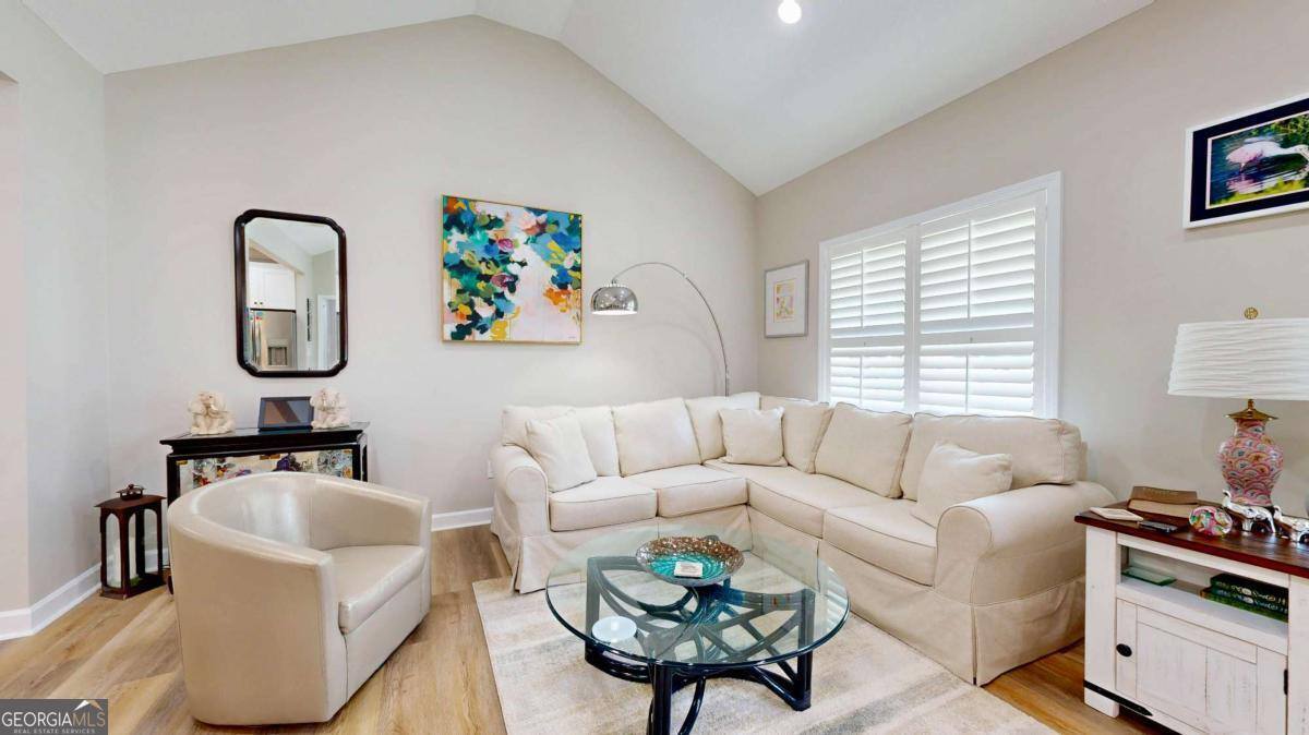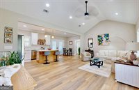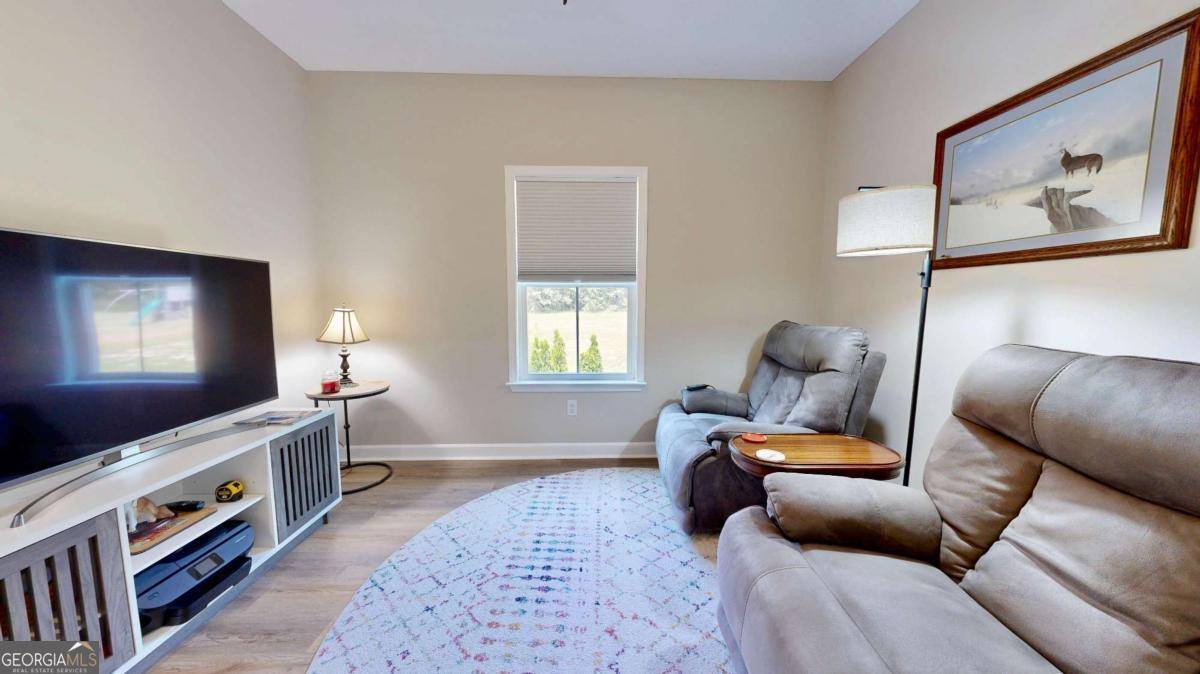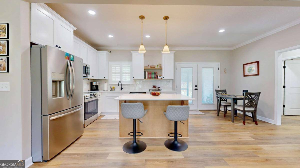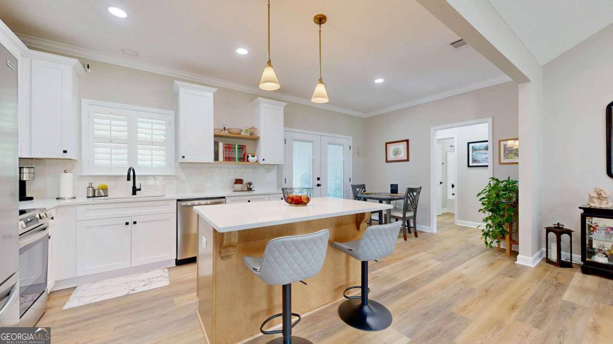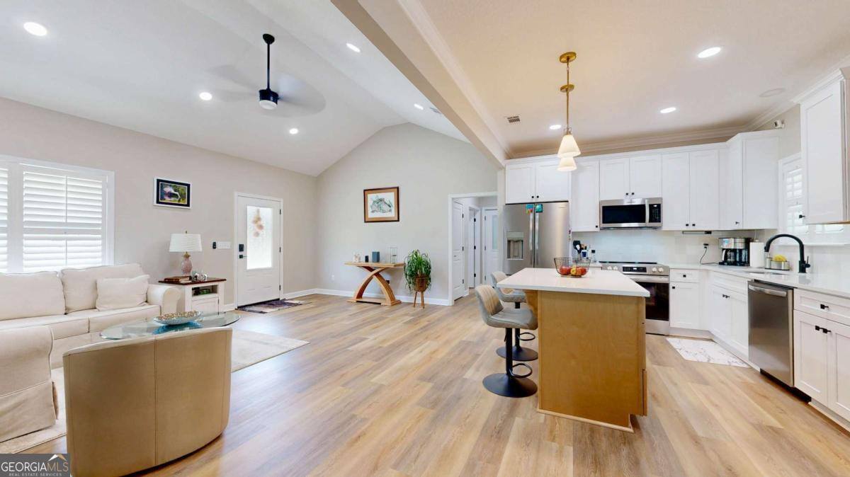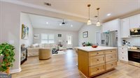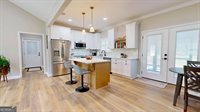 both spacious living areas and privacy. The living room is bright and inviting, with plenty of windows allowing for an abundance of natural light. The kitchen is a chef's delight, featuring an island and bar for convenience, ample cabinet space, and an easy
