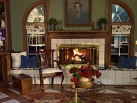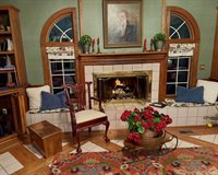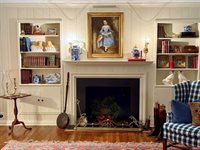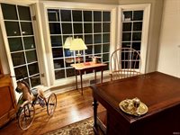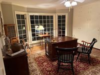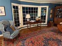 built-in shelving, real hardwood floors, deep bay windows, and a wood-burning fireplace. The hardwood flooring continues into the adjoining dining room, which boasts a built-in corner cabinet and elegant French doors leading to a bright and airy 19-ft. garden/sunroom.