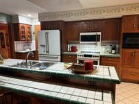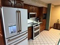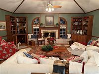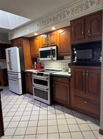 space, highlighted by an island bar, skylight, pantry, and brand-new appliances (refrigerator, 2 stoves, 2 microwaves, dishwasher). The family room wows with a classic gas fireplace, custom shelving, and a striking 13-ft. vaulted tray ceiling. Custom-designed