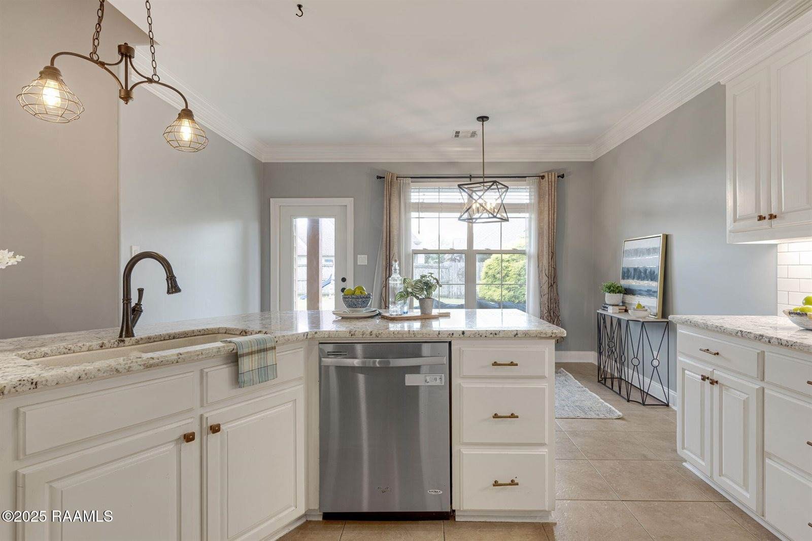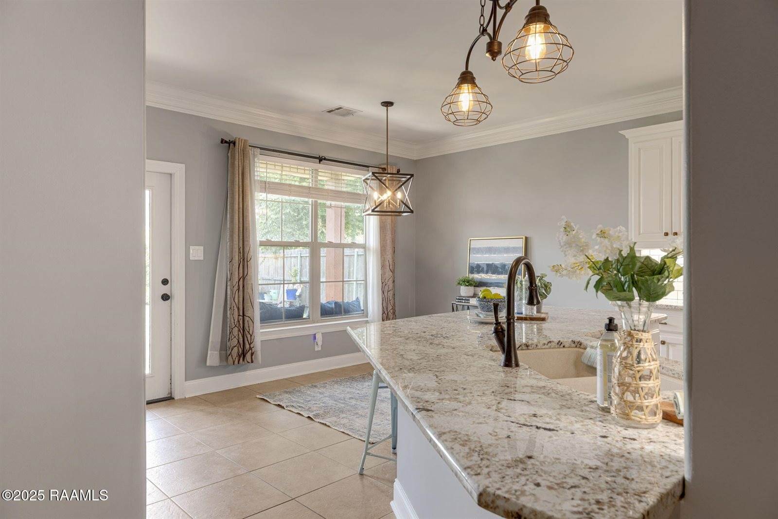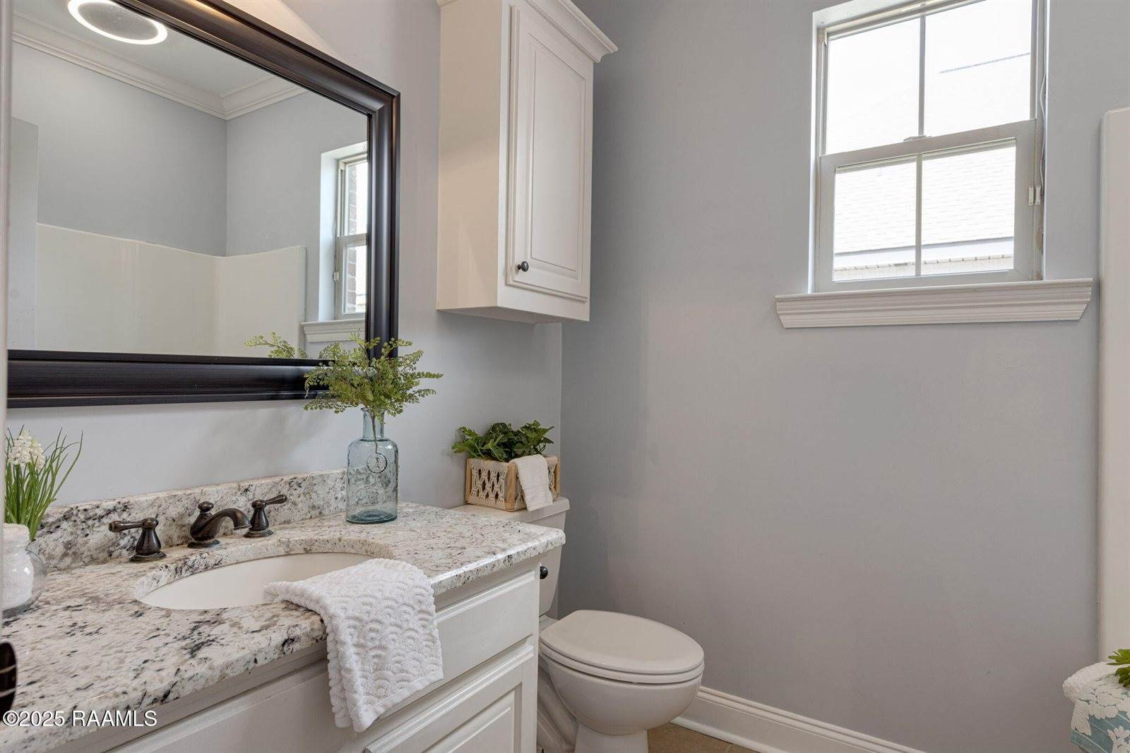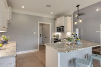Inside, you'll find custom cypress cabinets that bring warmth and character to the kitchen, perfectly complemented by White Galaxy granite countertops with bullnose edging. Fresh paint throughout gives the interior a bright, clean feel, while updated fixtures