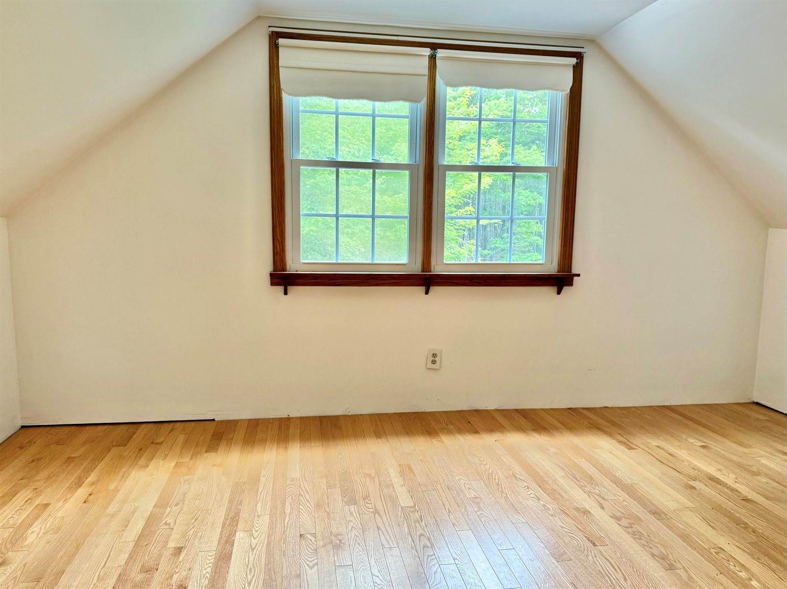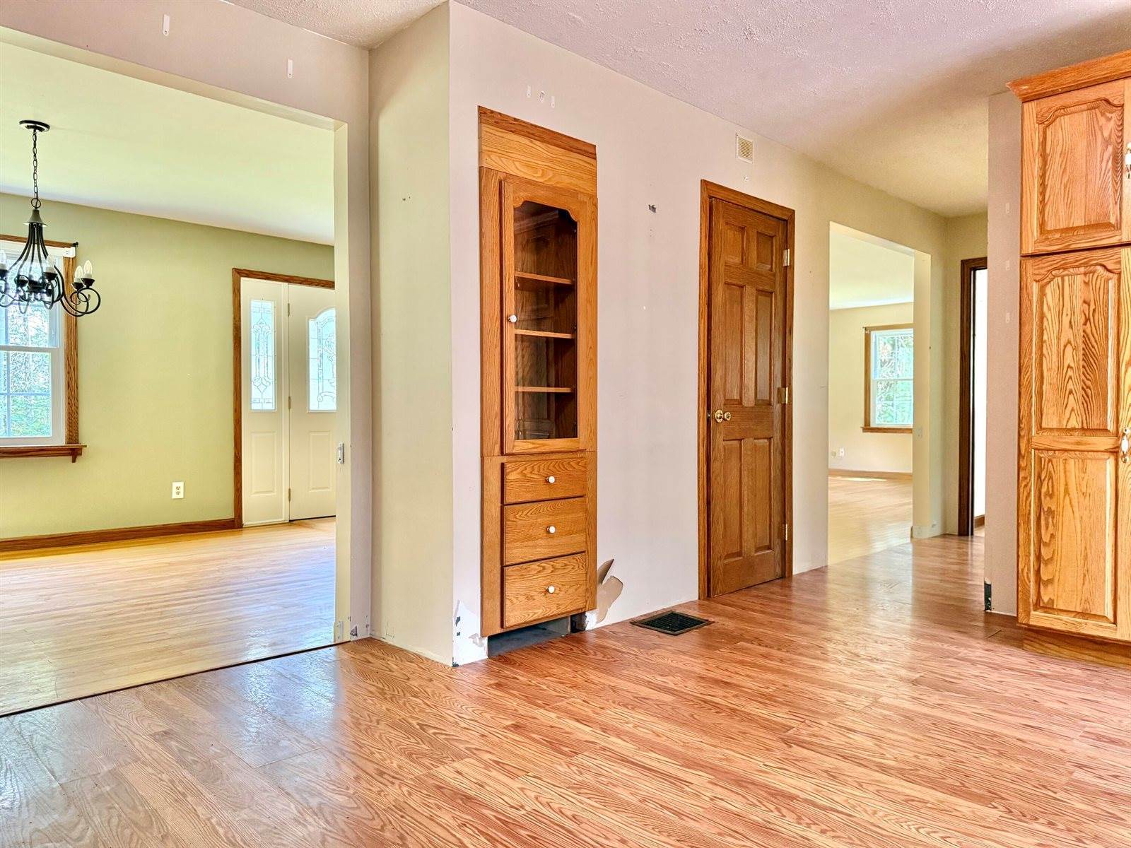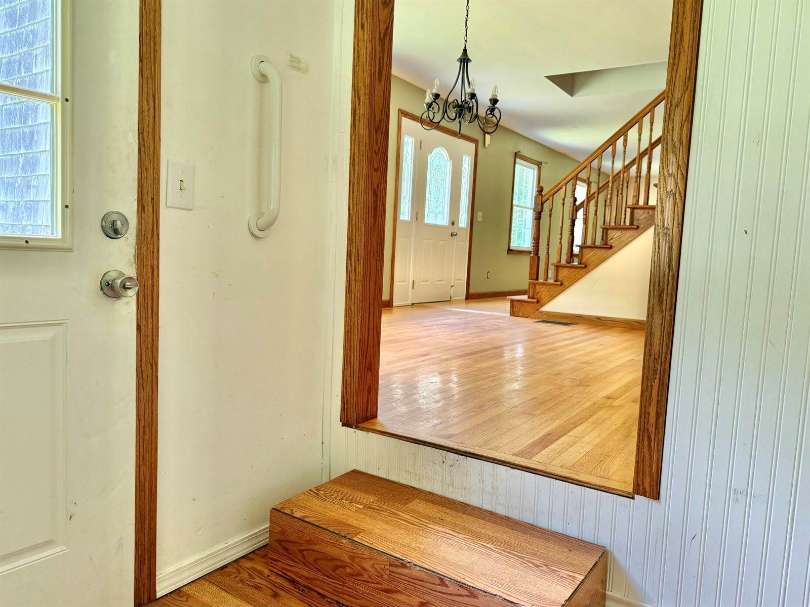 or to build a garage. Step out from the kitchen onto the back deck and take in the serene views of your backyard. Inside, you'll find hardwood floors, a spacious open kitchen with updated appliances, and a convenient mudroom entry. The primary bedroom and