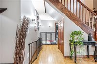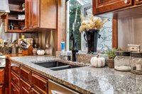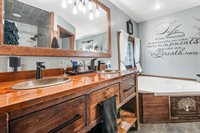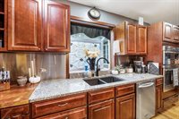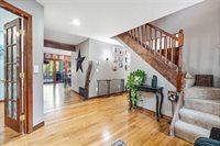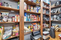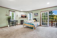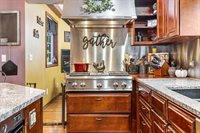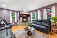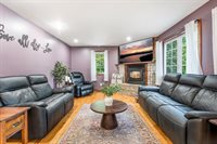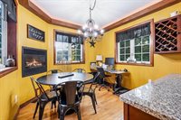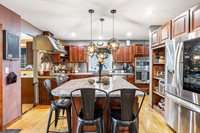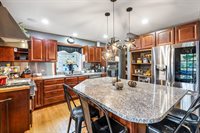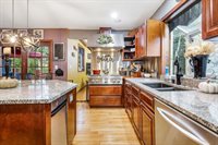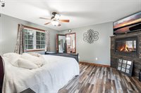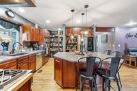 and walk-in closet. The gourmet kitchen has a large pantry, industrial grade appliances, and granite countertops. There is a formal dining room with a gas fireplace off the kitchen. The living room has a wood burning fireplace and a sliding glass door that