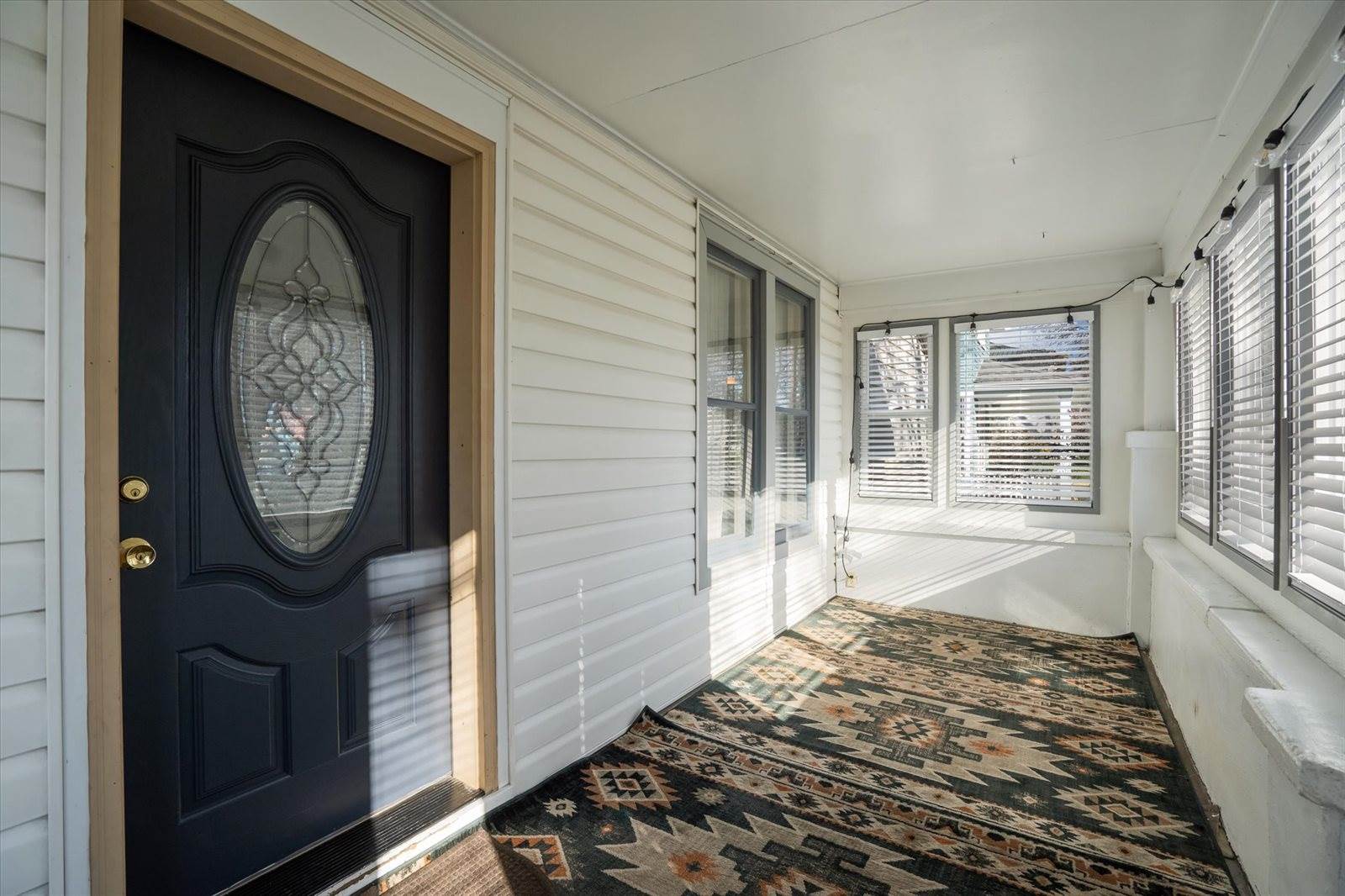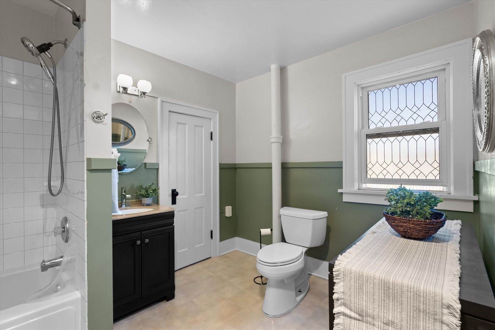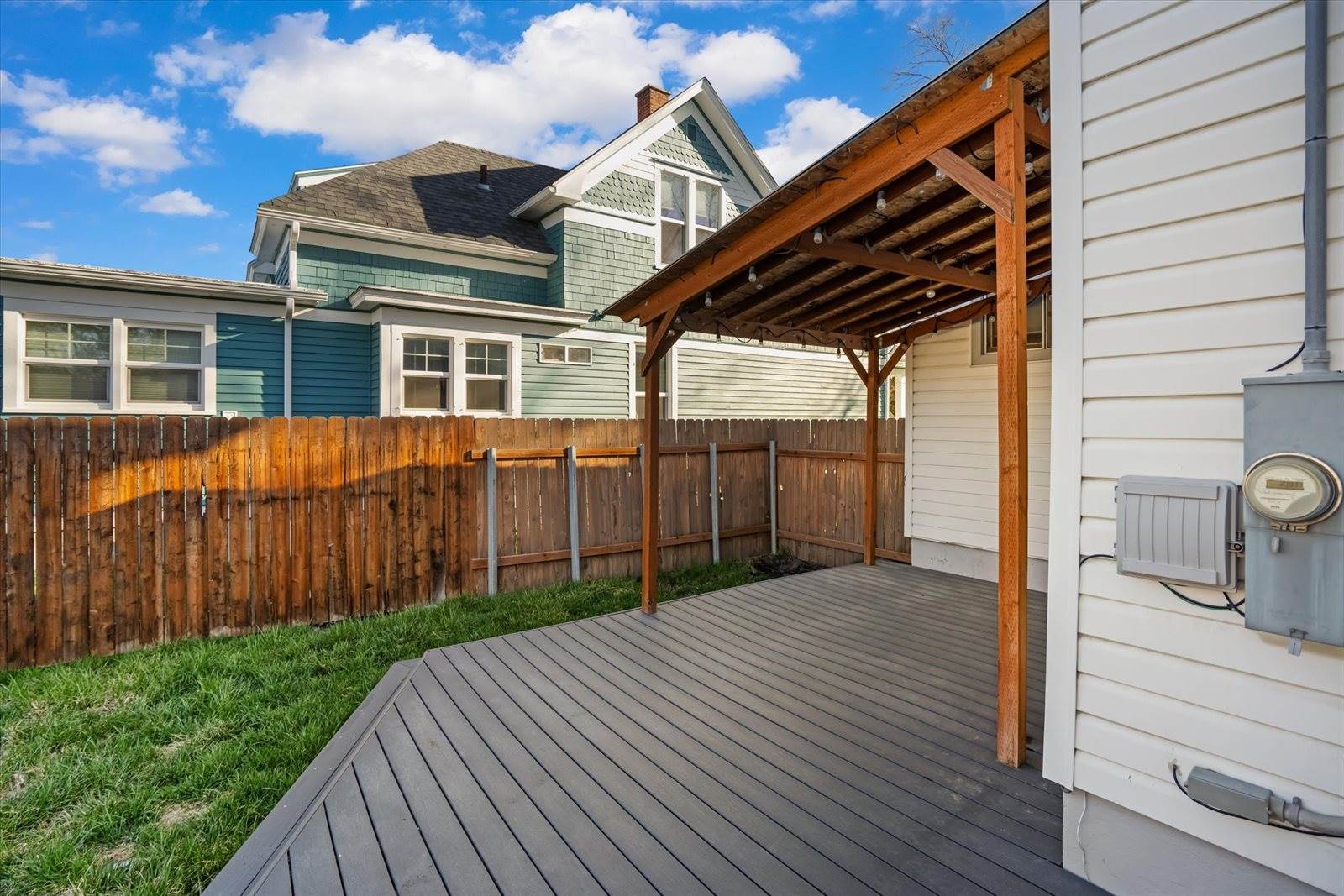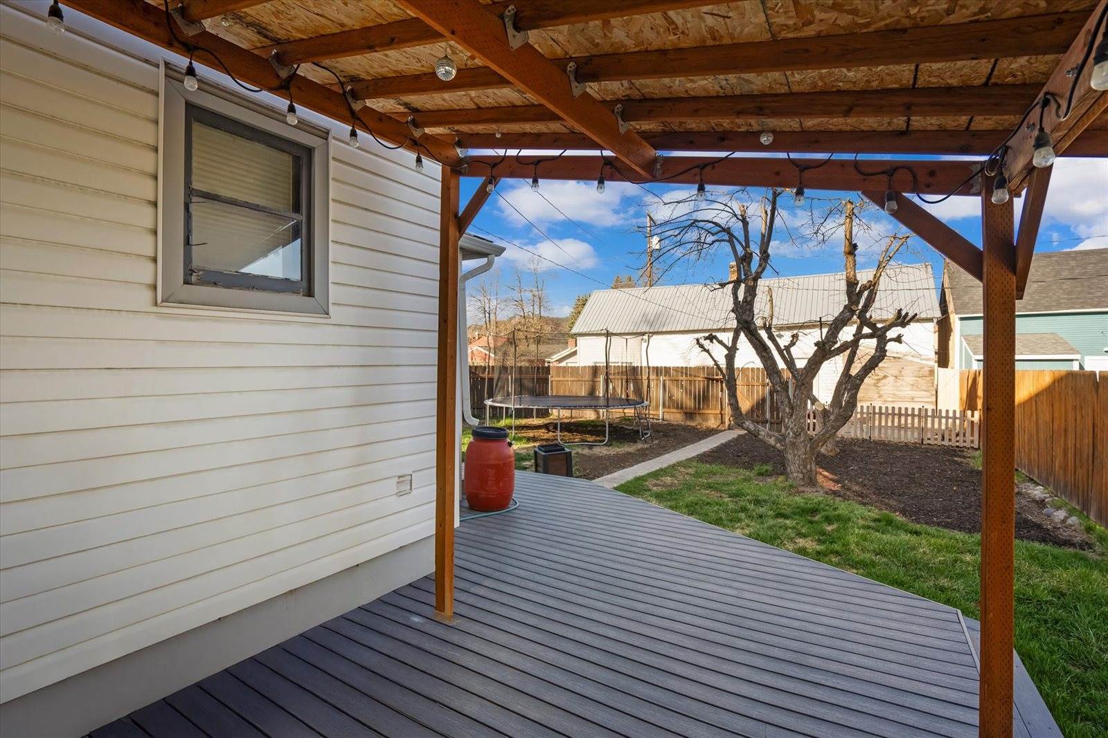 home sits on a generous, oversized city lot with a fenced backyard, a large back deck with a covered area, a pass-through driveway from the street to the alley, and a large rear parking area for the toys. Inside begins with a charming enclosed front porch,