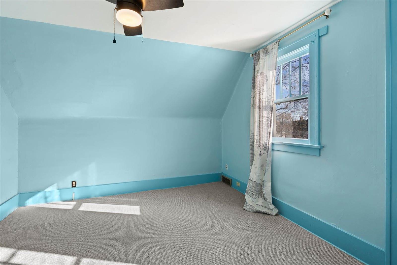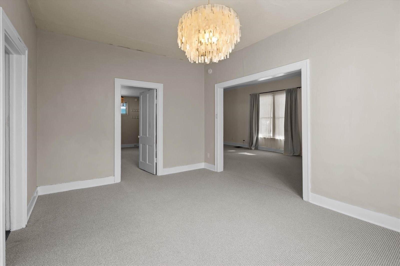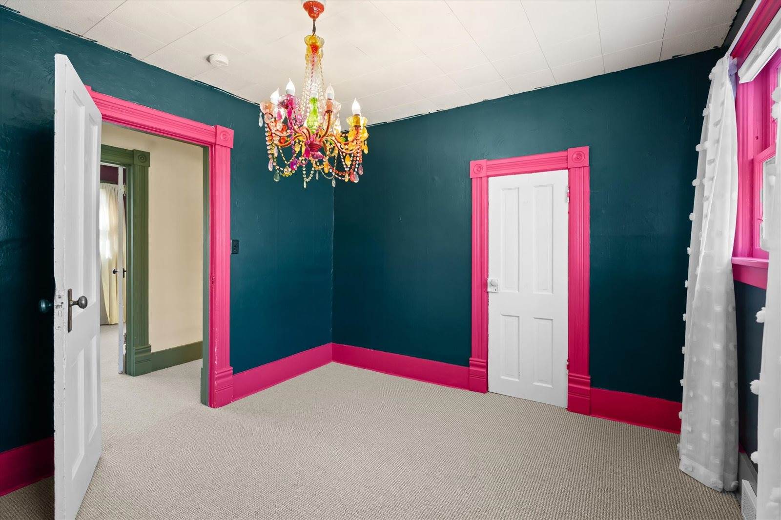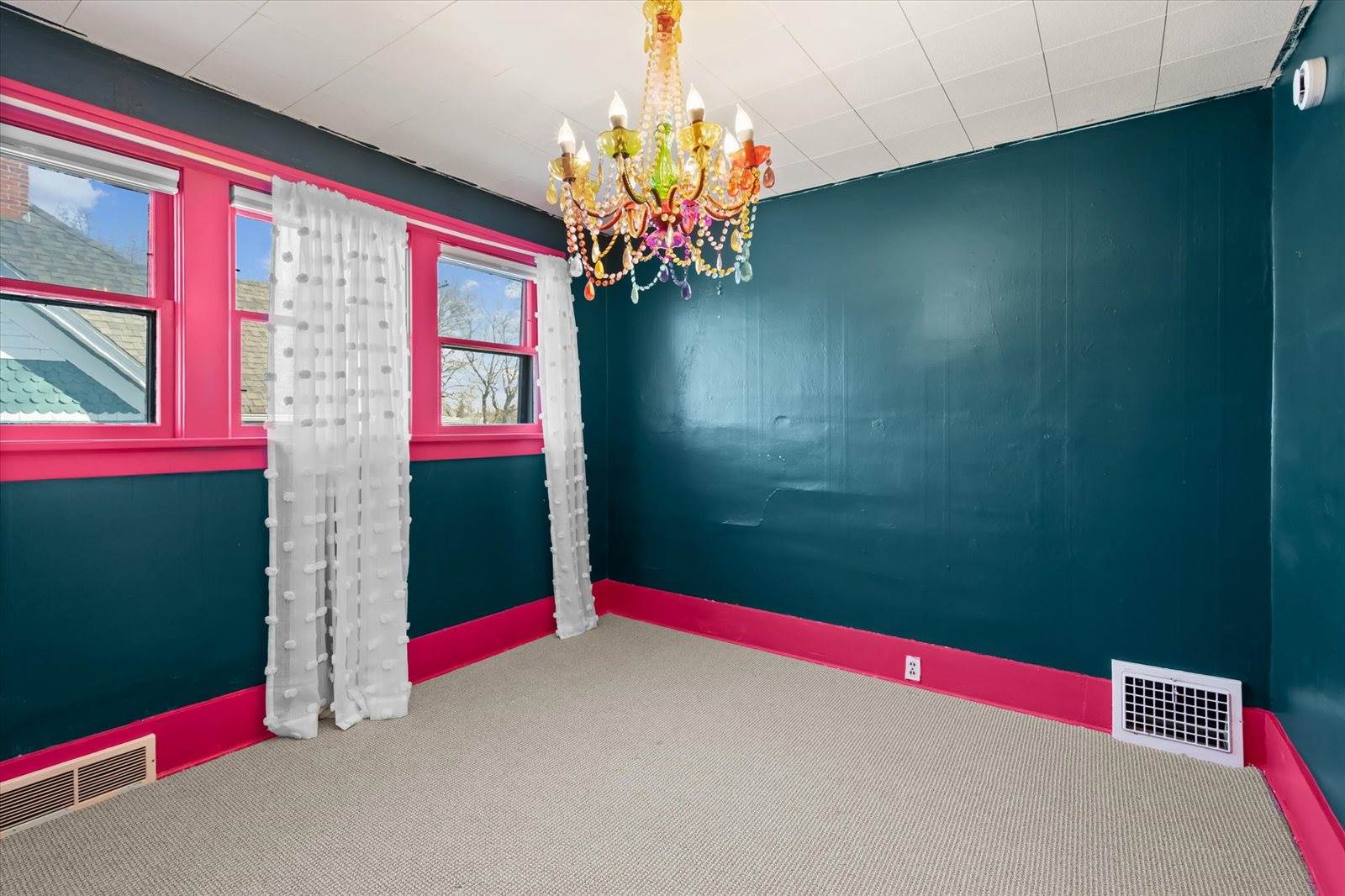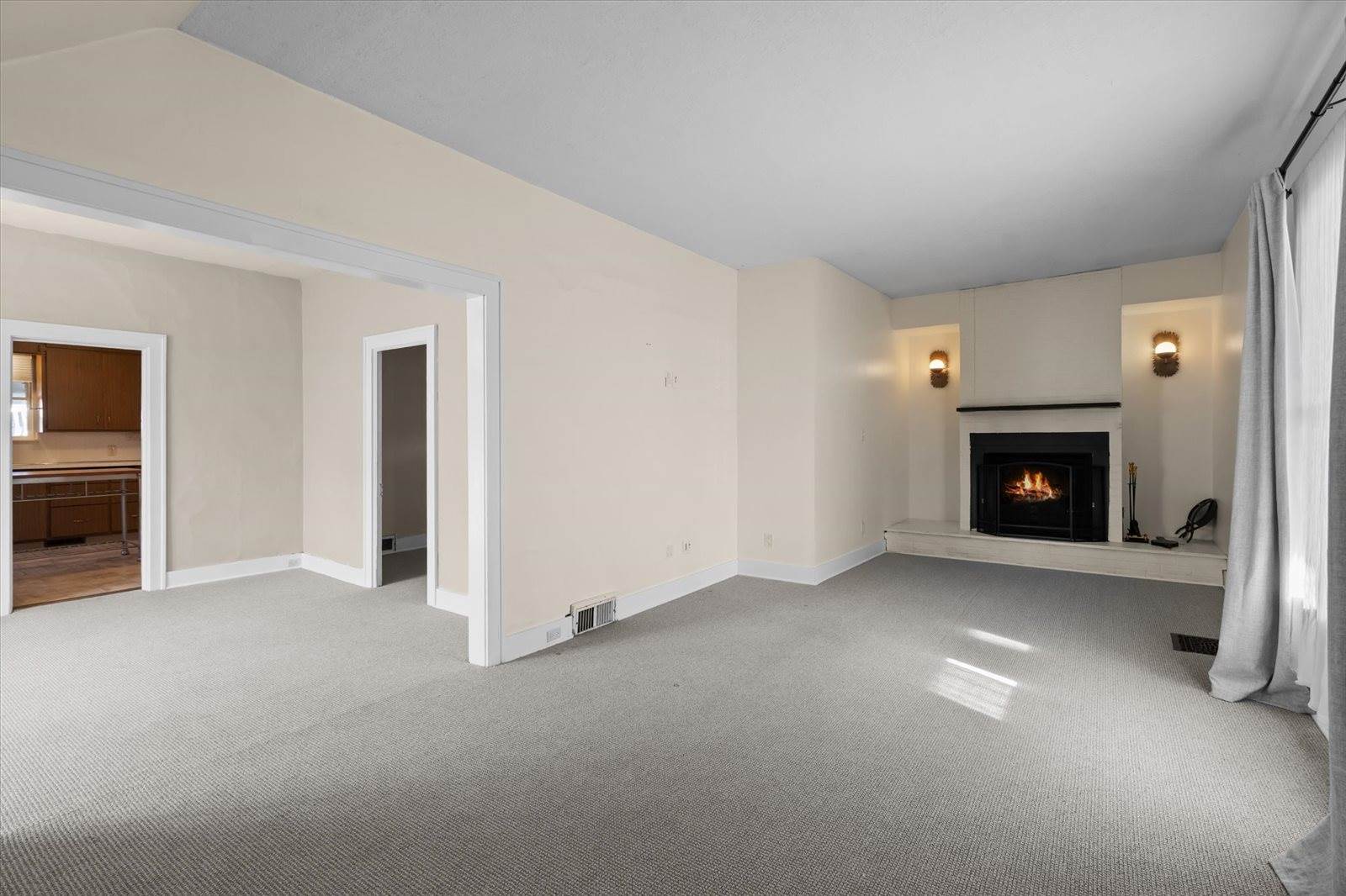 home sits on a generous, oversized city lot with a fenced backyard, a large back deck with a covered area, a pass-through driveway from the street to the alley, and a large rear parking area for the toys. Inside begins with a charming enclosed front porch,