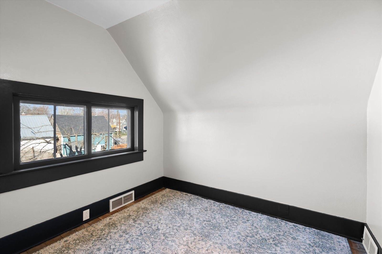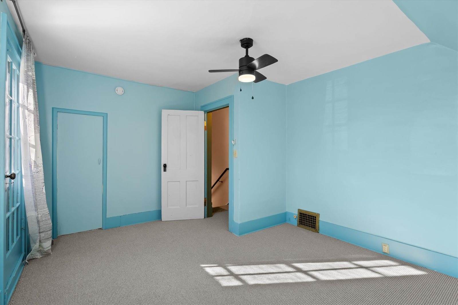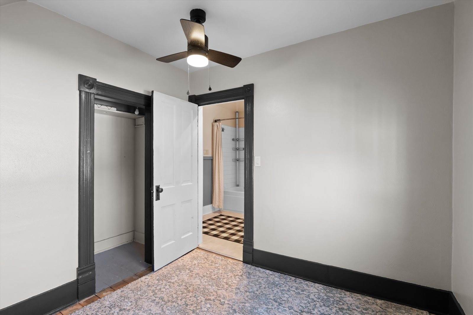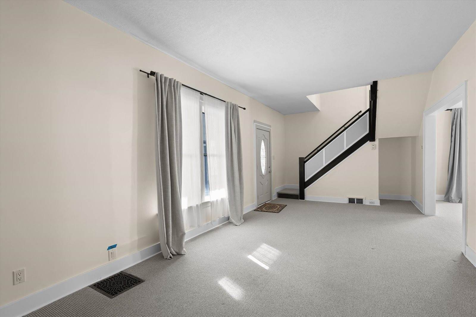 home sits on a generous, oversized city lot with a fenced backyard, a large back deck with a covered area, a pass-through driveway from the street to the alley, and a large rear parking area for the toys. Inside begins with a charming enclosed front porch,